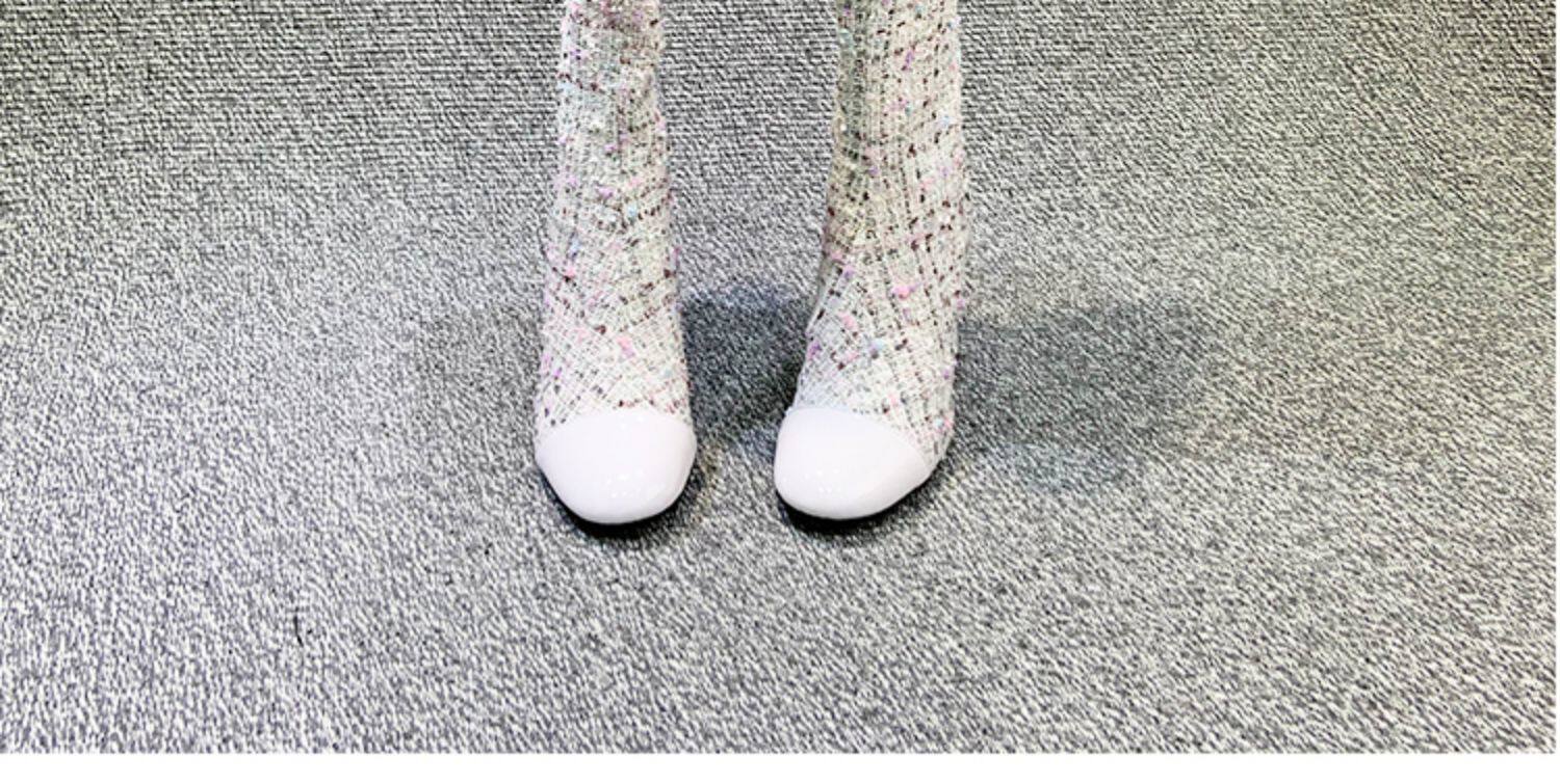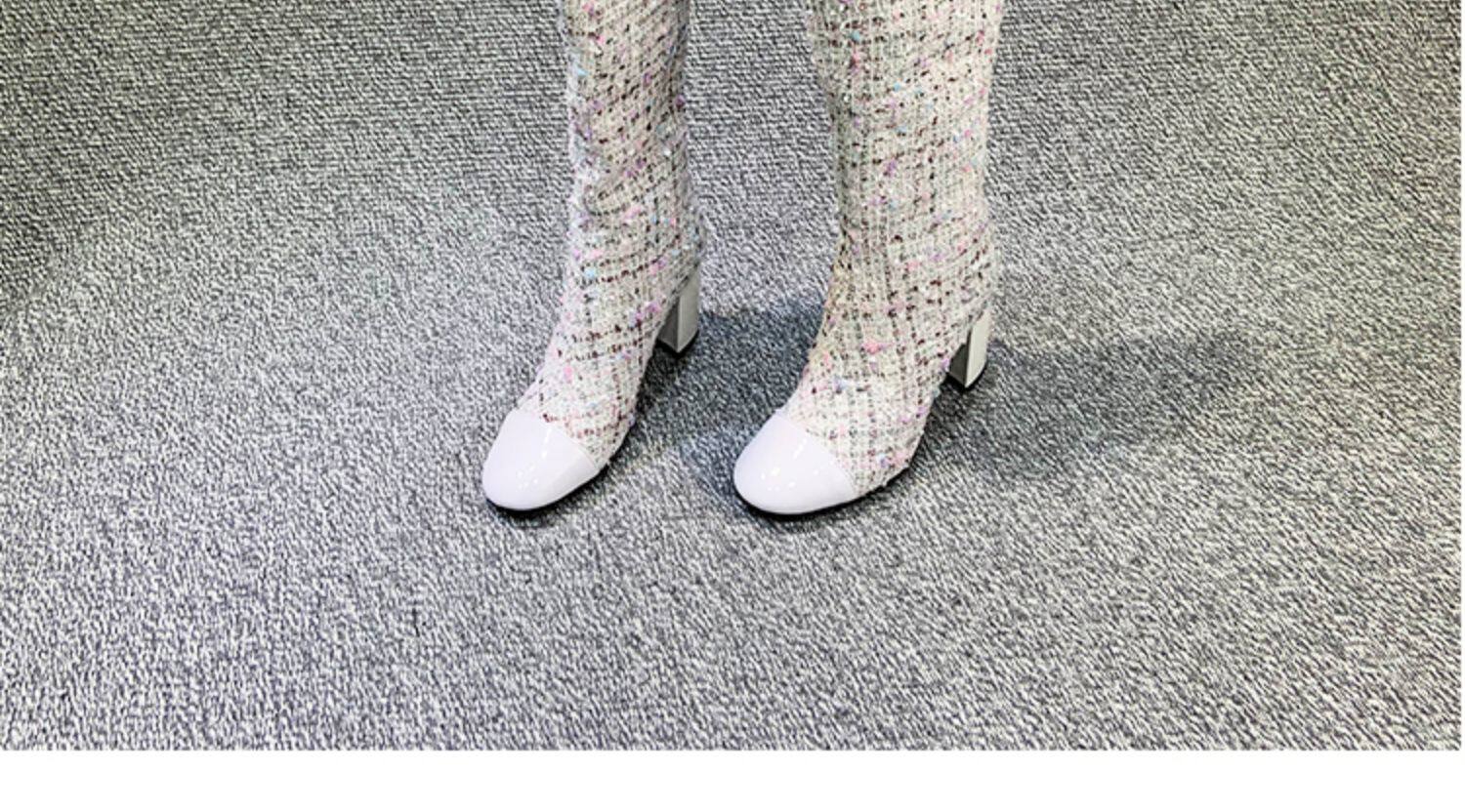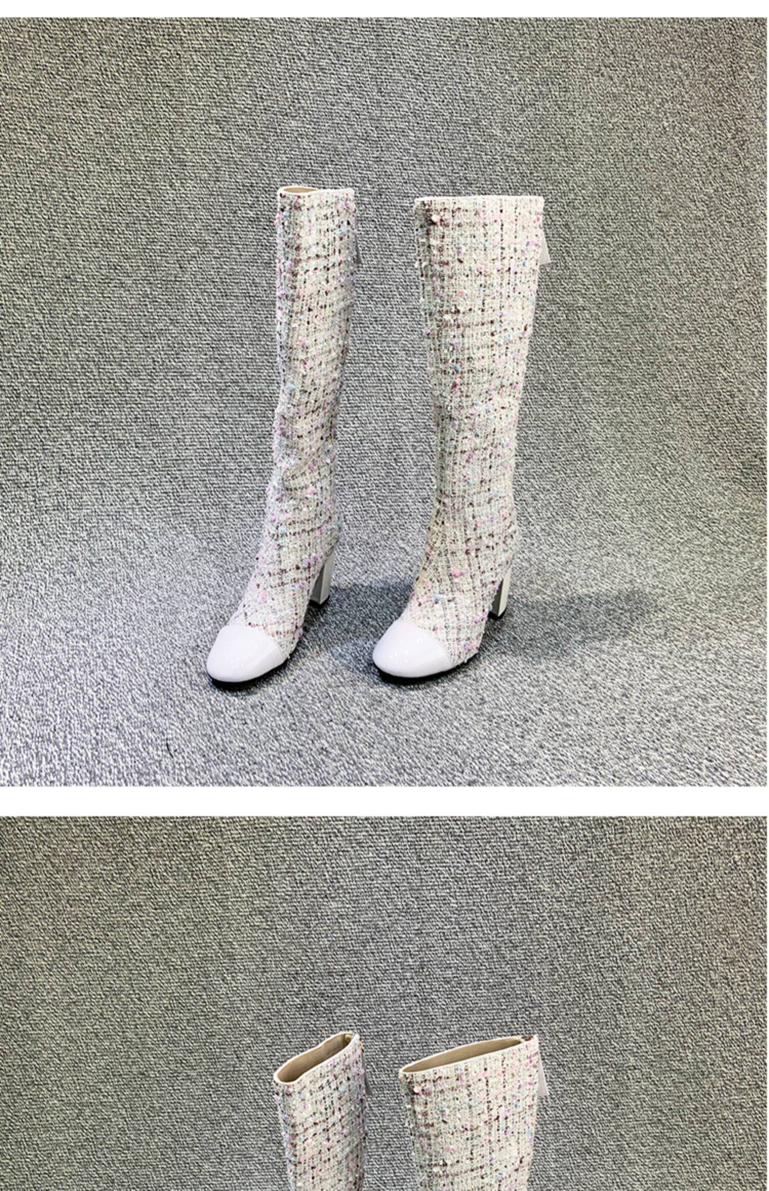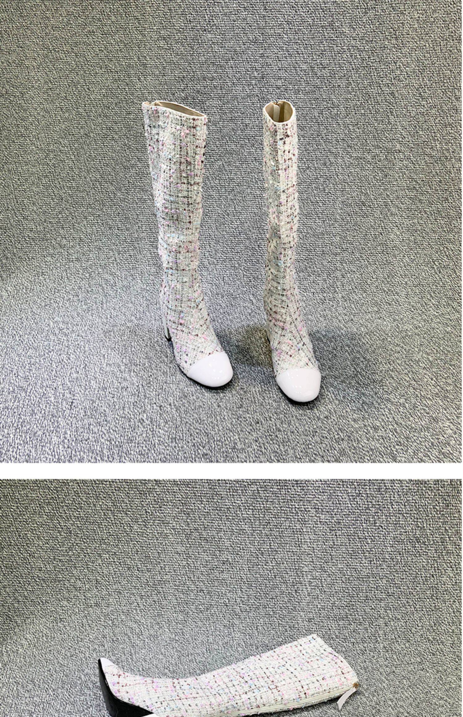 Демисезонные ботинки, белые высокие сапоги на высоком каблуке, в стиле Шанель