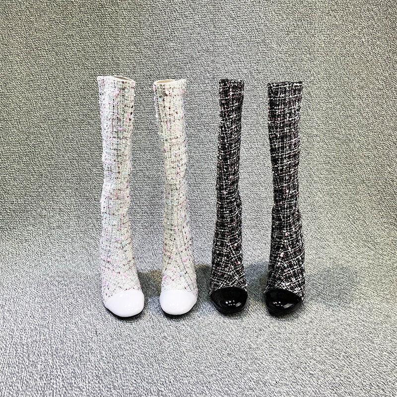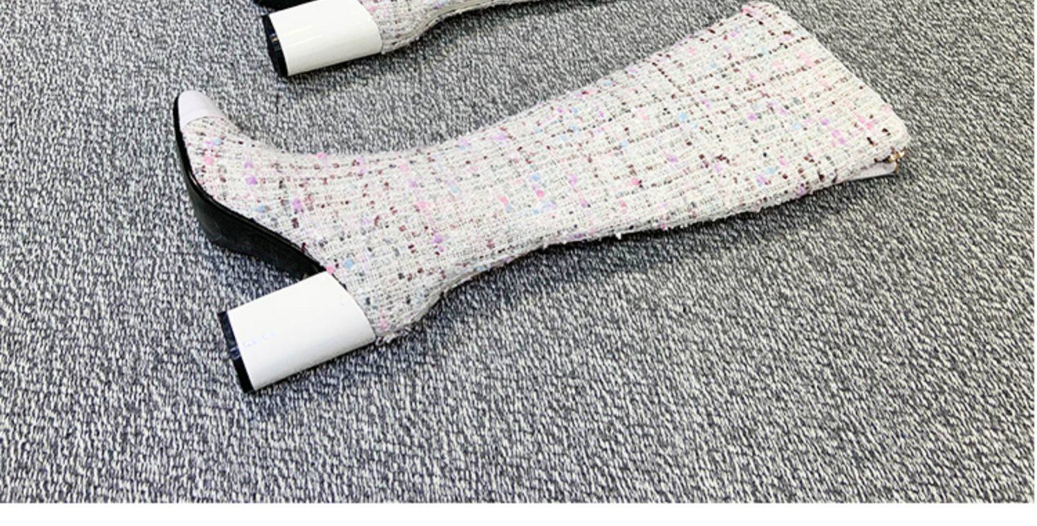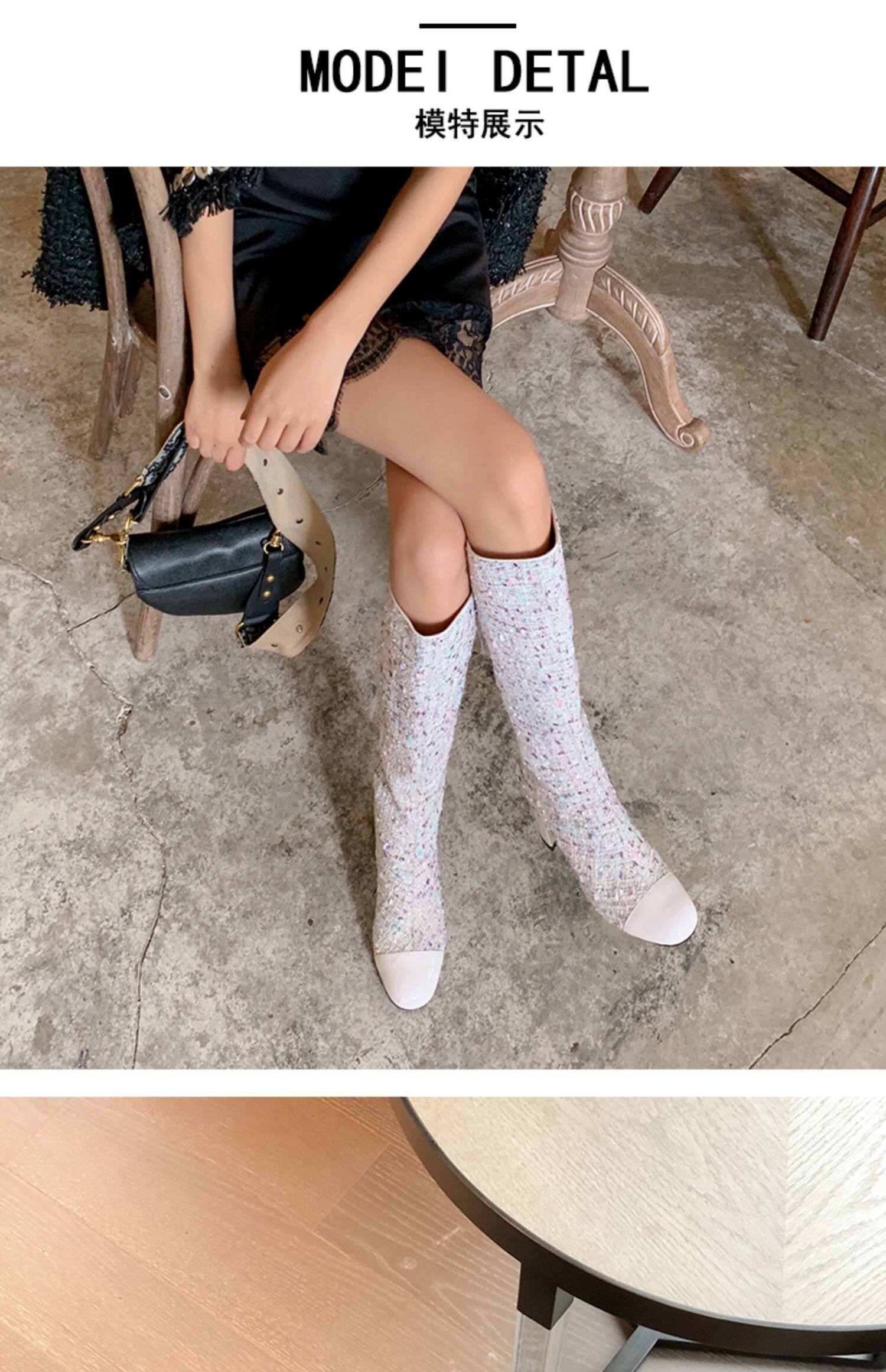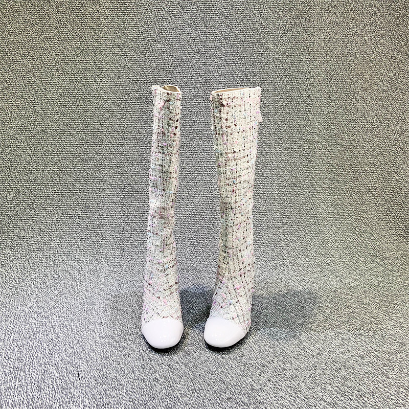 Демисезонные ботинки, белые высокие сапоги на высоком каблуке, в стиле Шанель