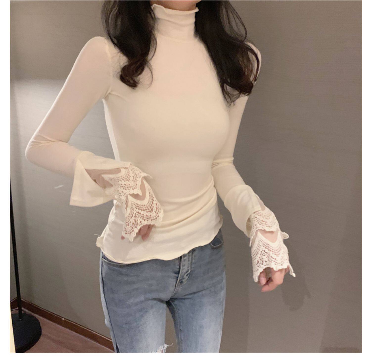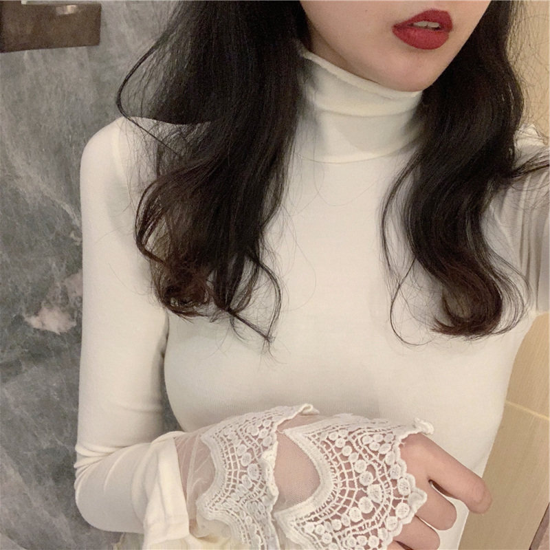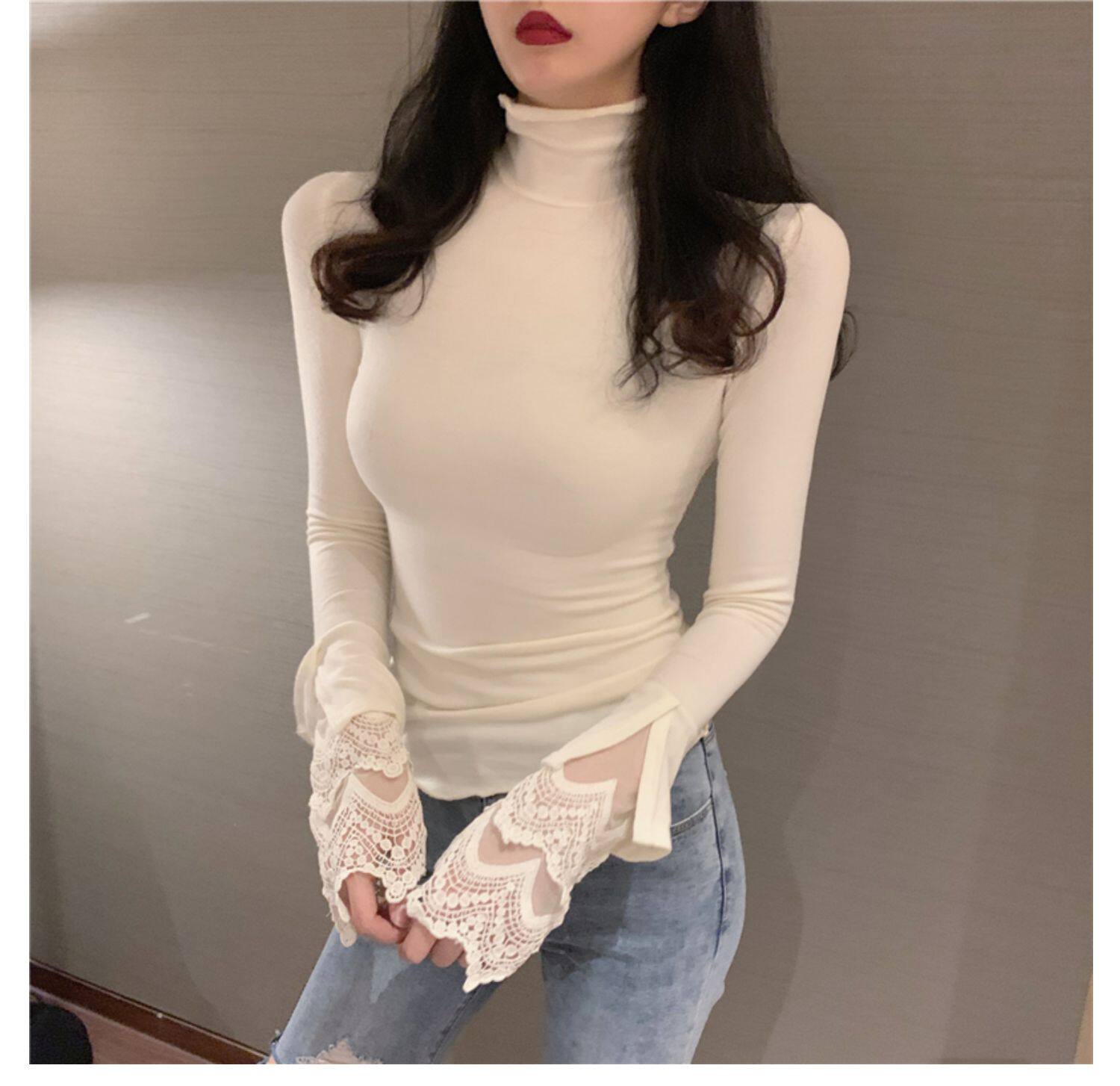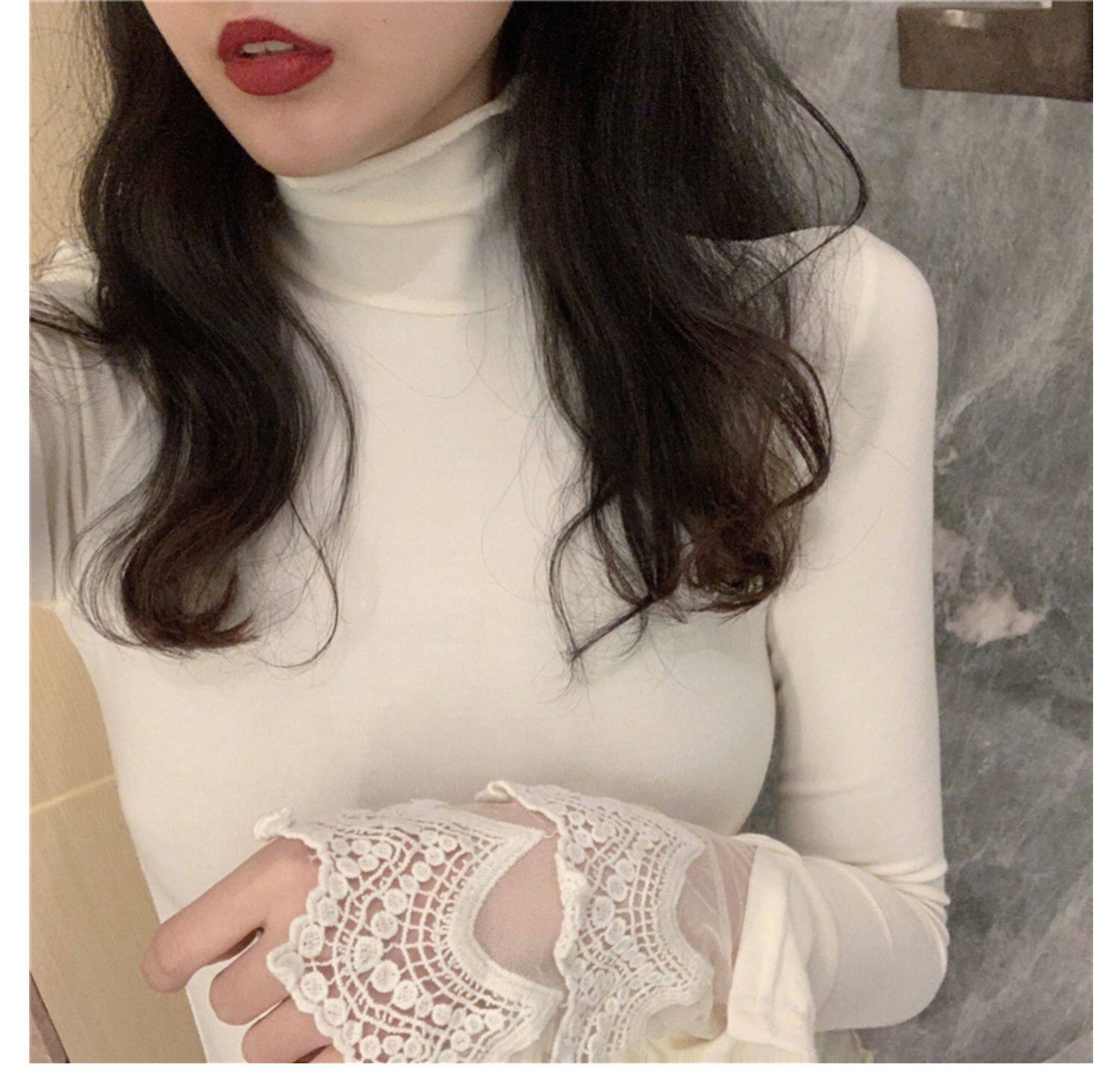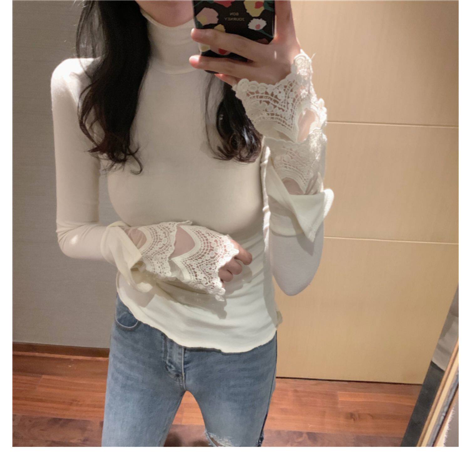 Весенний приталенный хлопковый лонгслив, белая утепленная кружевная шелковая приятная телу футболка, в западном стиле