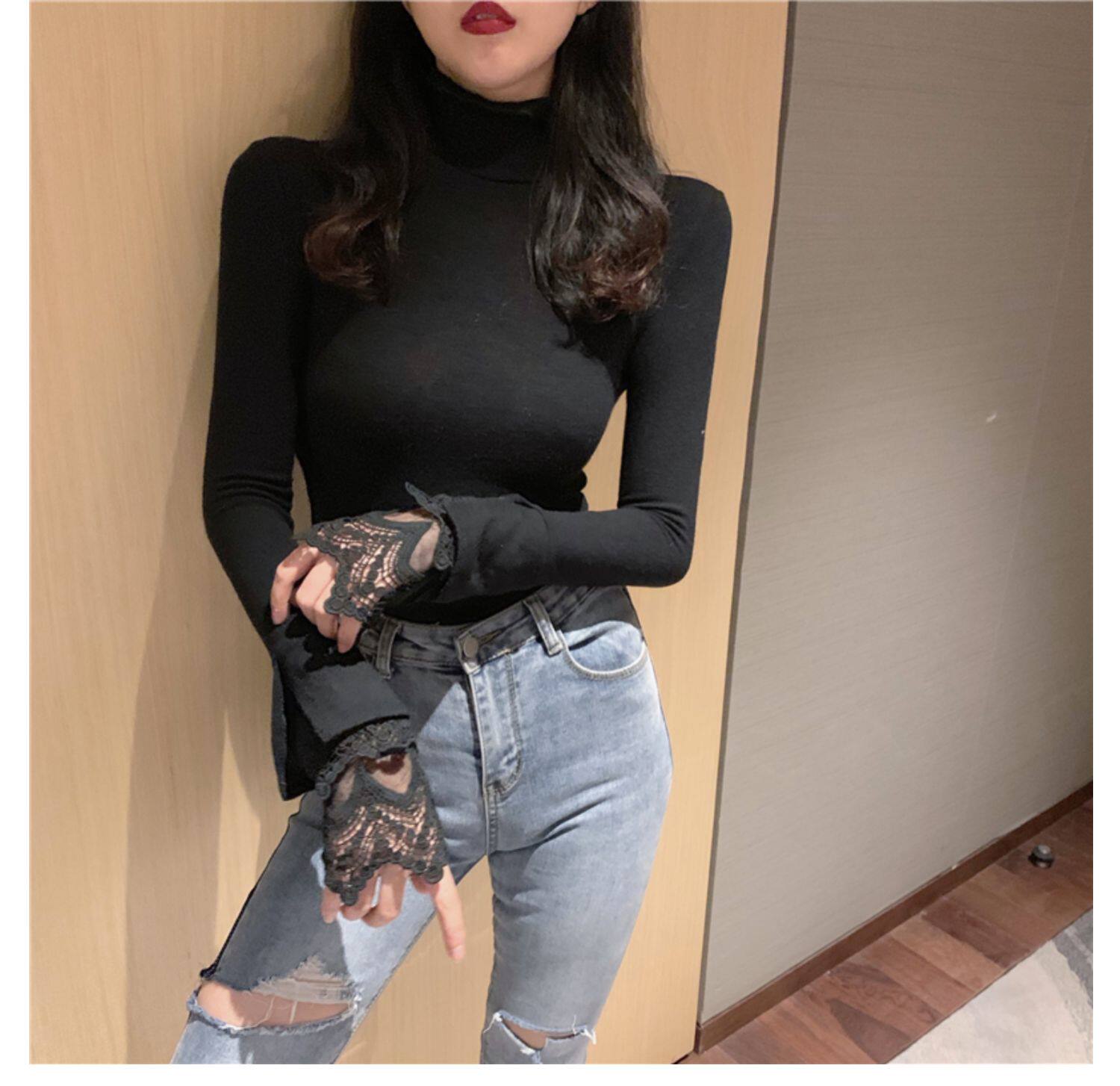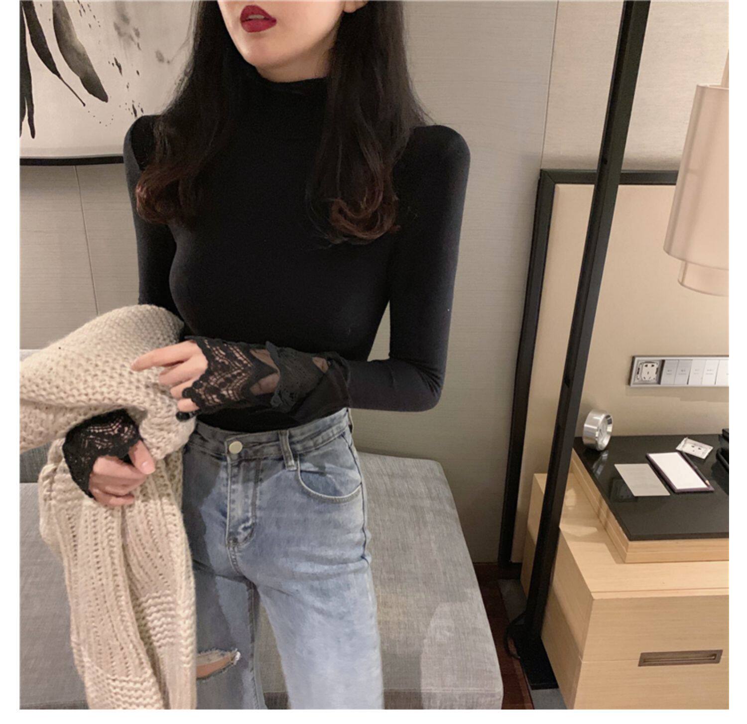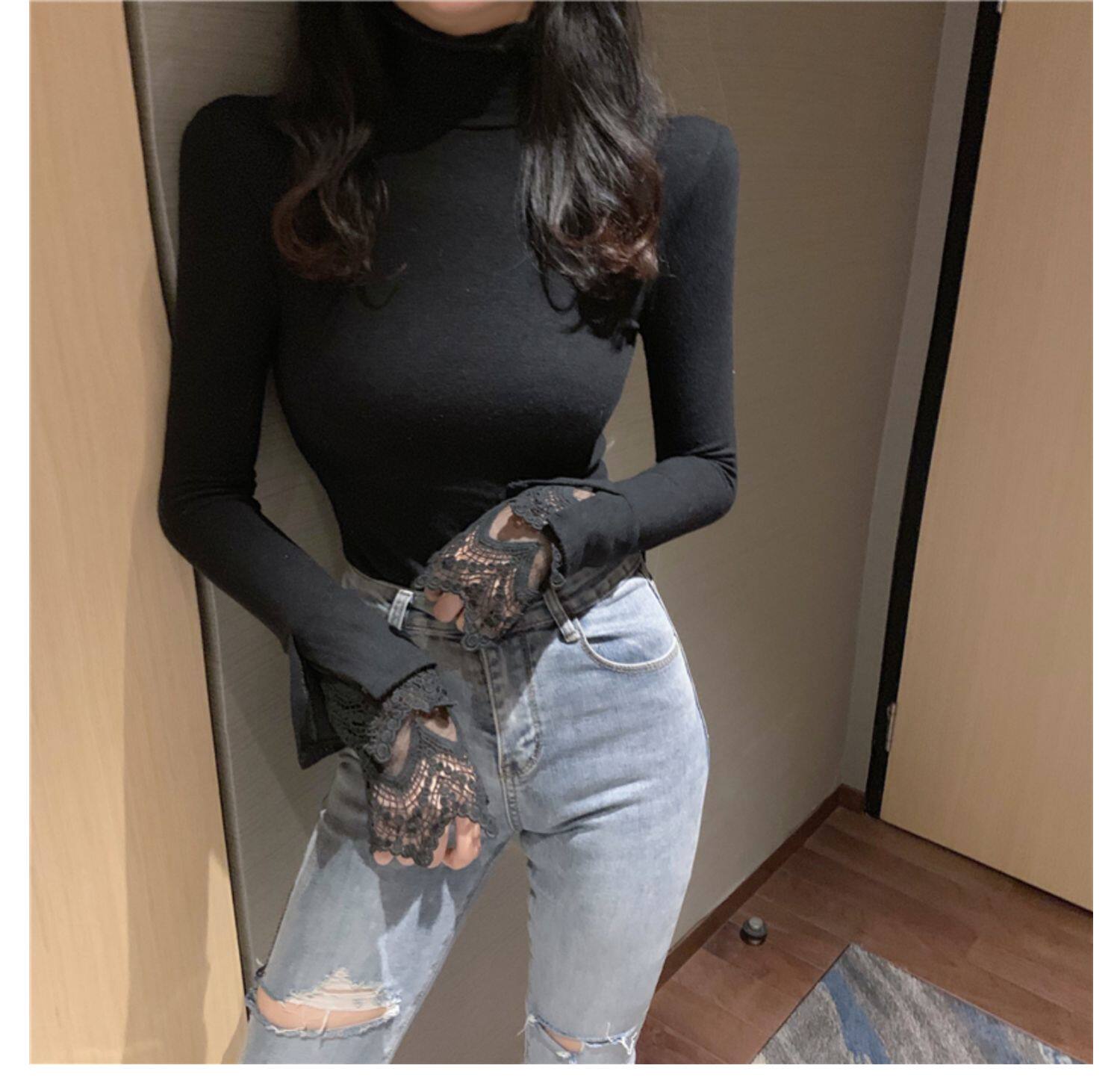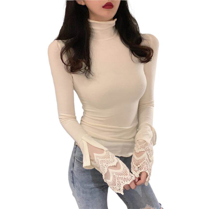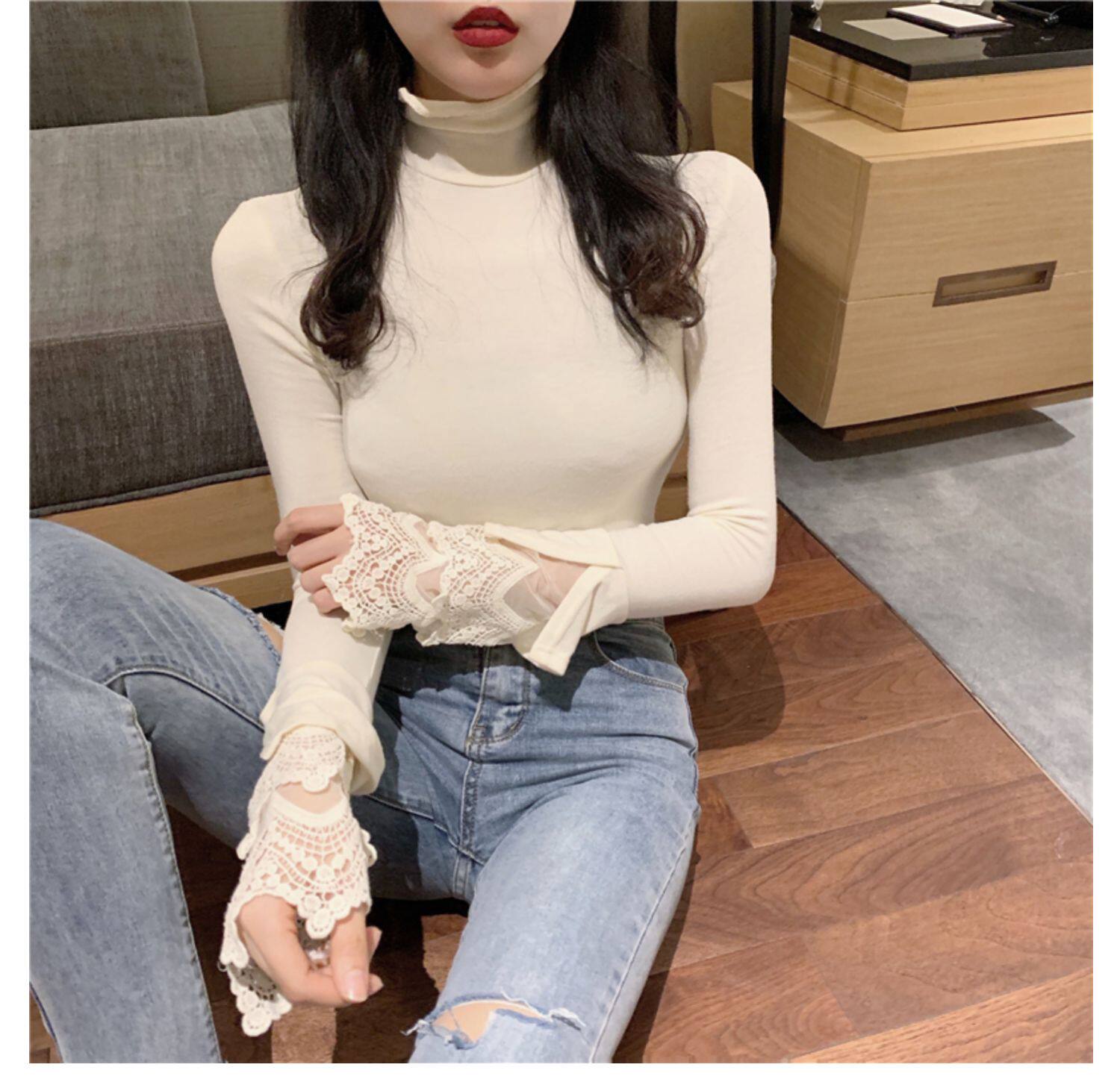 Весенний приталенный хлопковый лонгслив, белая утепленная кружевная шелковая приятная телу футболка, в западном стиле