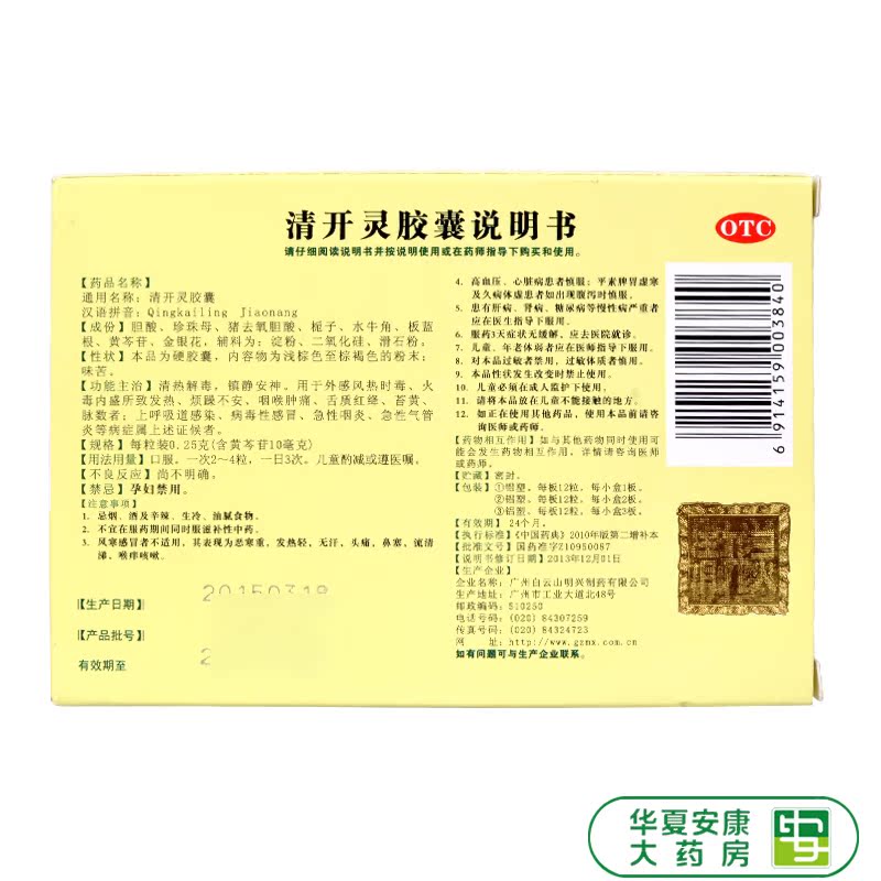 白云山 Чистая капсула капсула 0,25 г*12 капсулы/ящик горло, боль, тепло, тепло, детоксикация острого фарингита, лихорадка HX