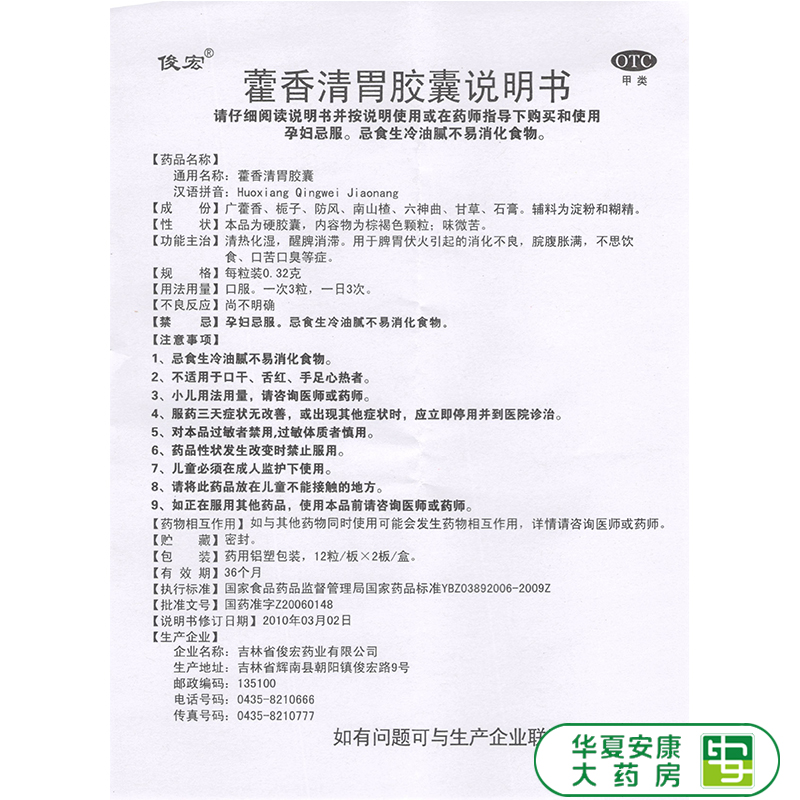 俊宏 Huoxiangquing желудок капсула 0,32 г*24 Капсула кондиционирующая желудочно -кишечная горечь горечь и расстройство желудка, запор HX
