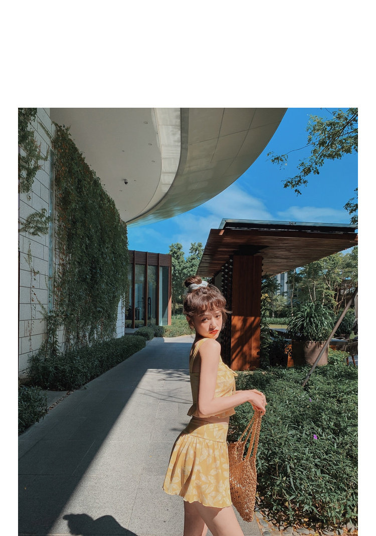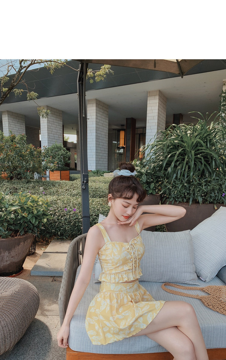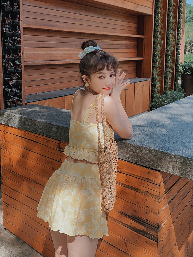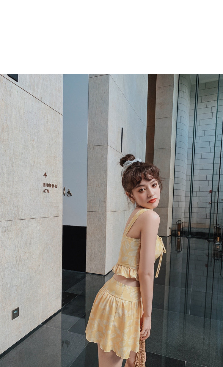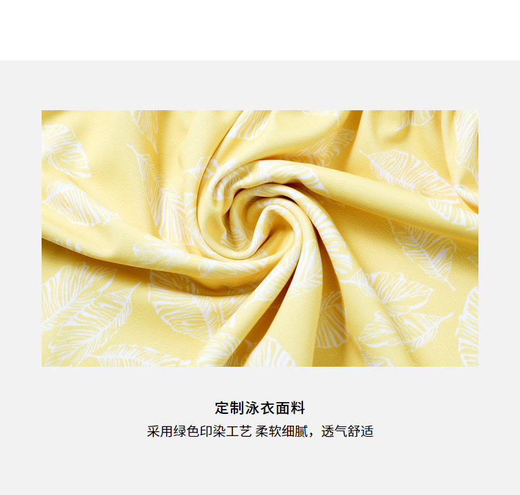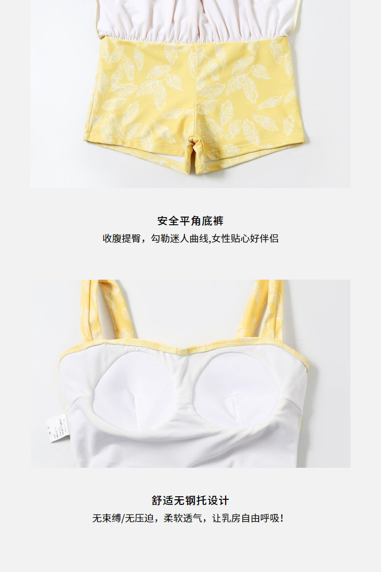 Элегантный желтый купальник, дизайн прост, чтобы иметь двух белых листьев, и есть небольшая конструкция морщин -конструкции в верхней части жилища.