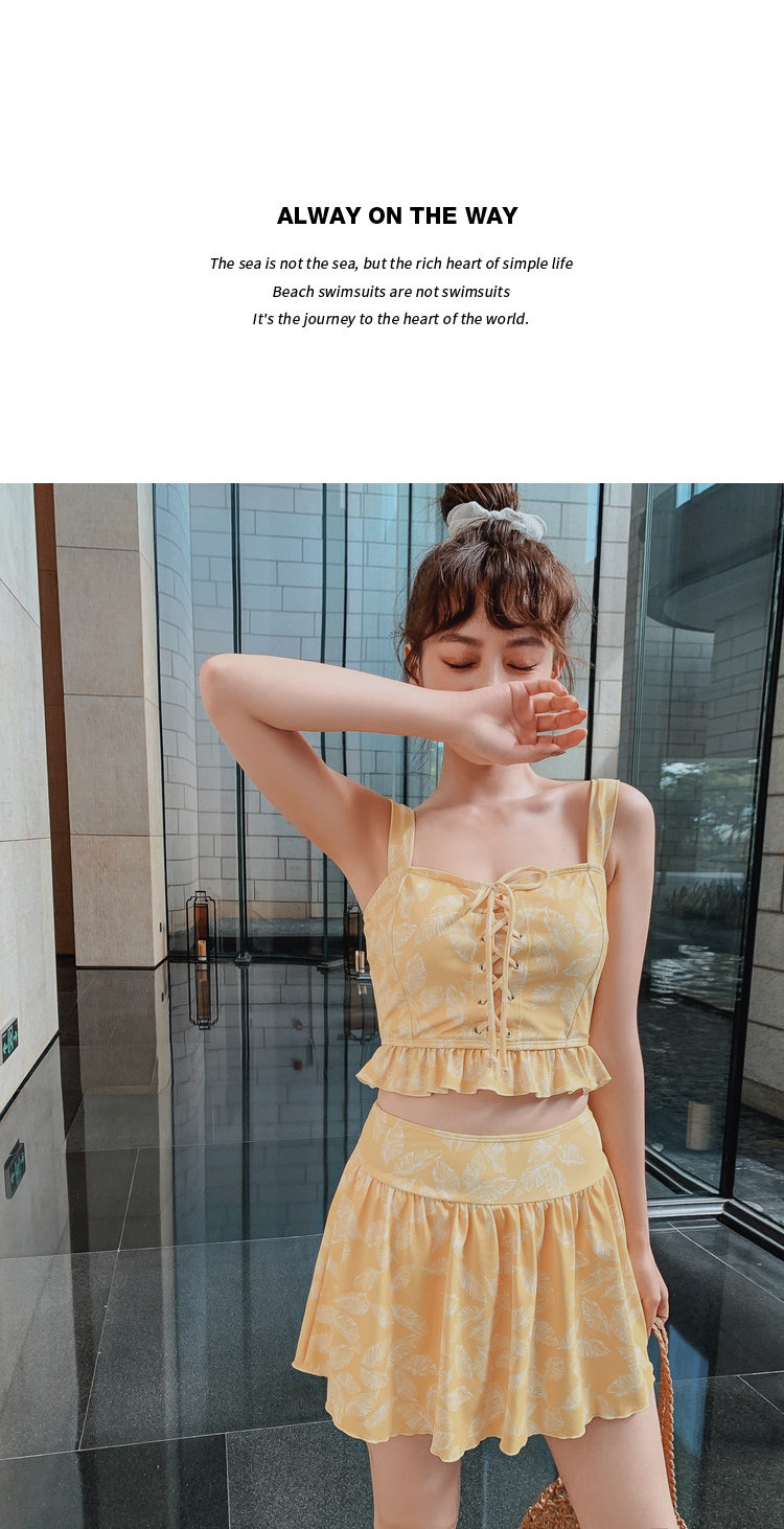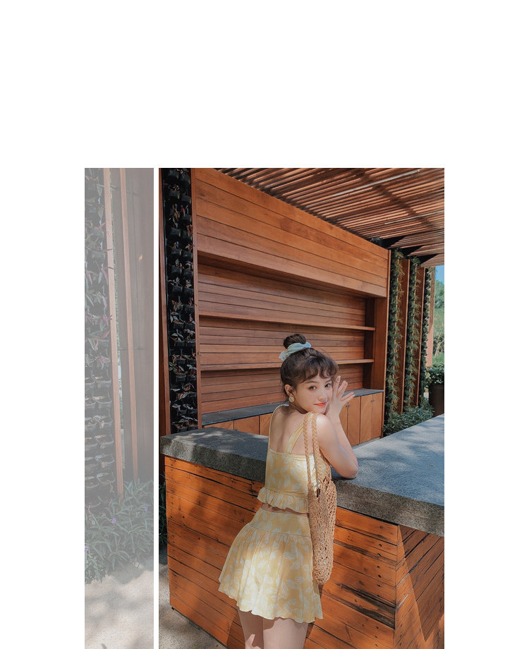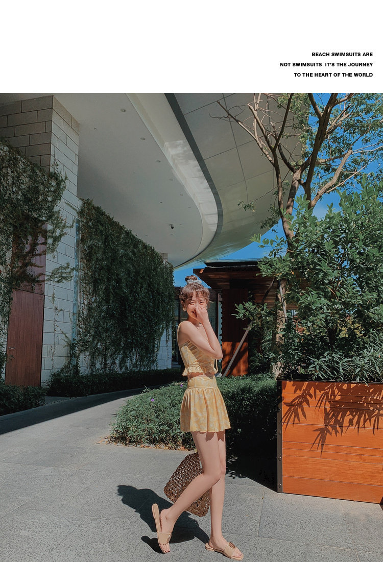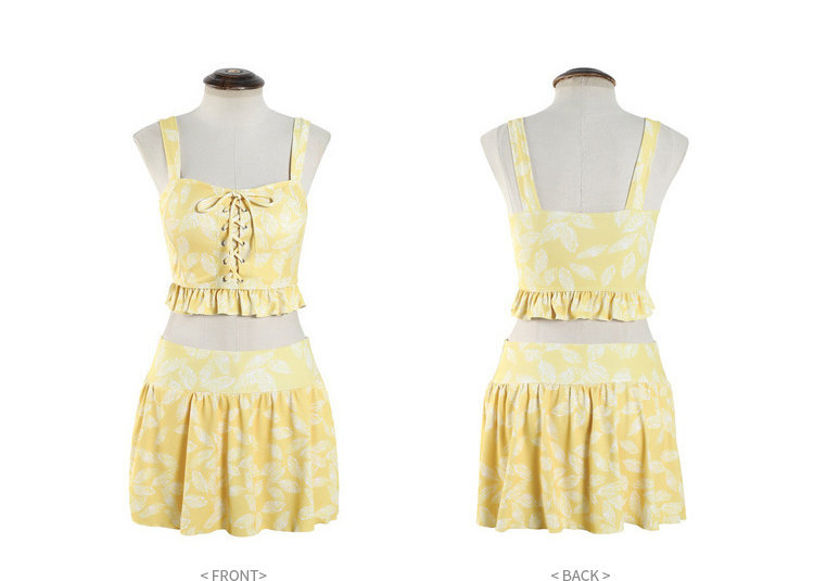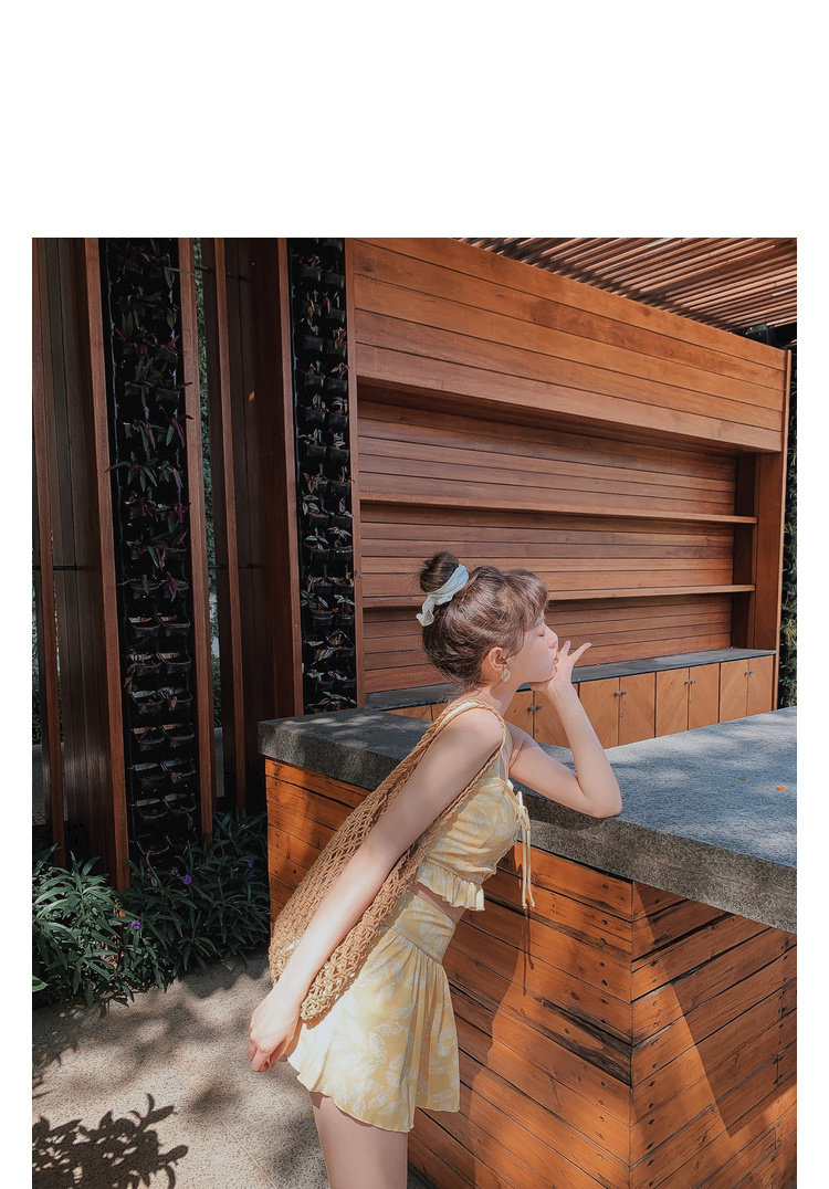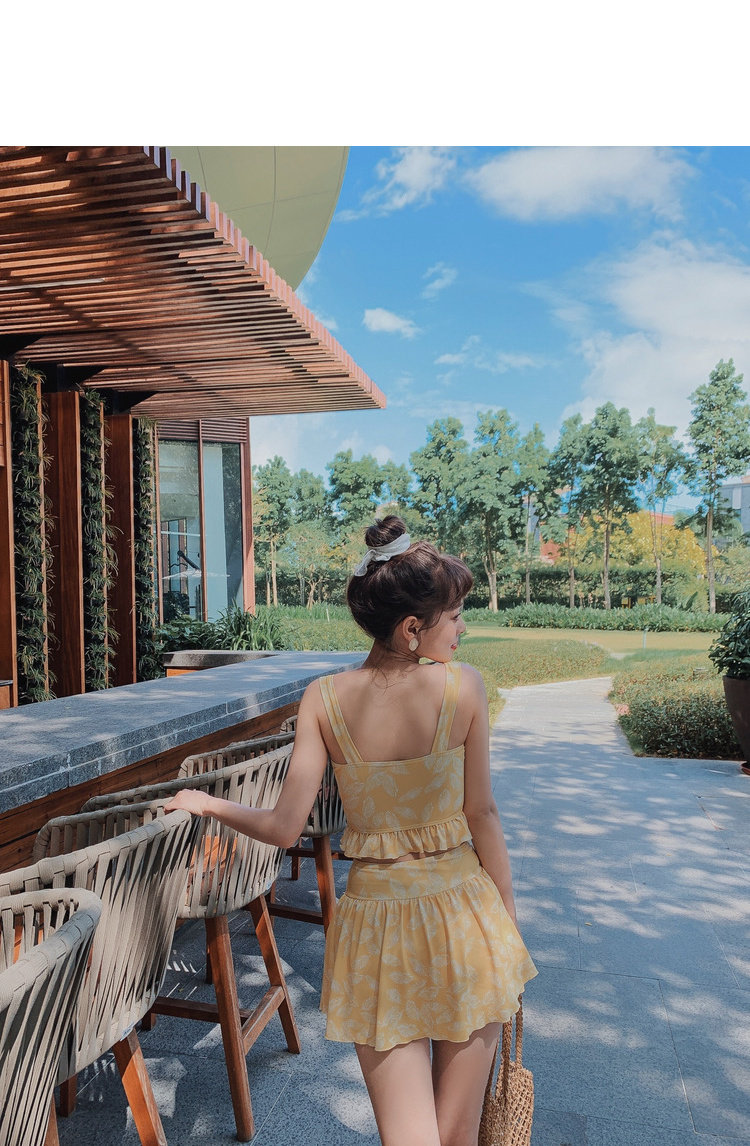 Элегантный желтый купальник, дизайн прост, чтобы иметь двух белых листьев, и есть небольшая конструкция морщин -конструкции в верхней части жилища.