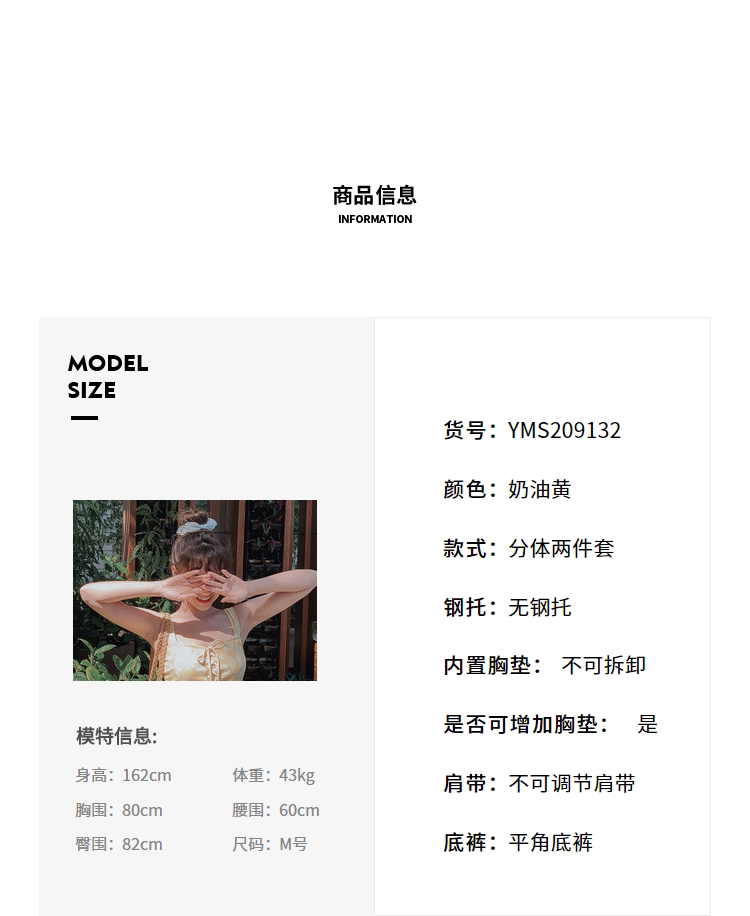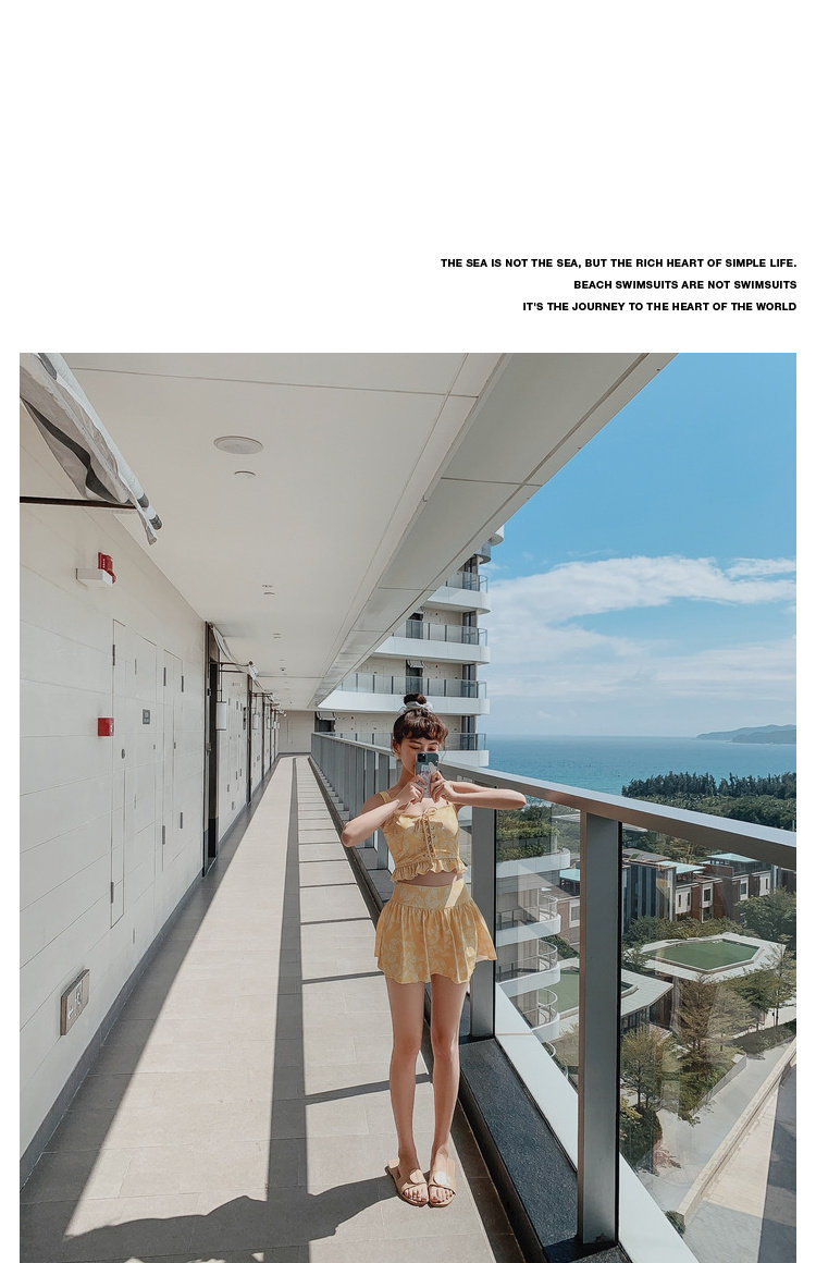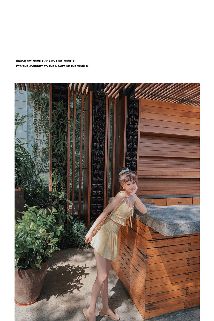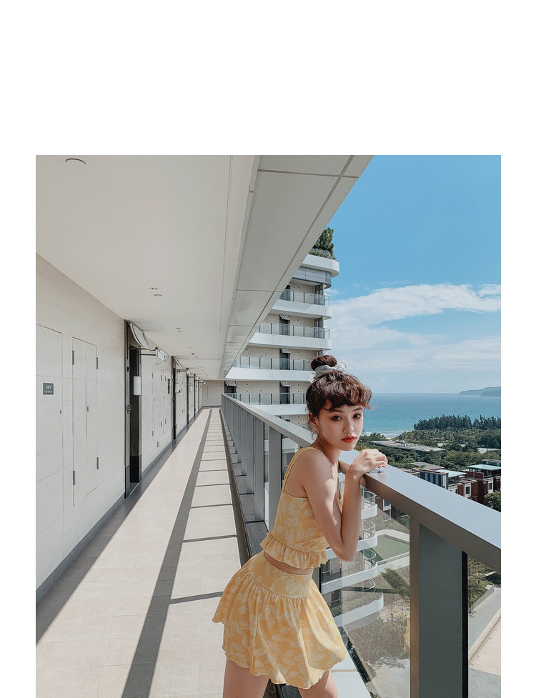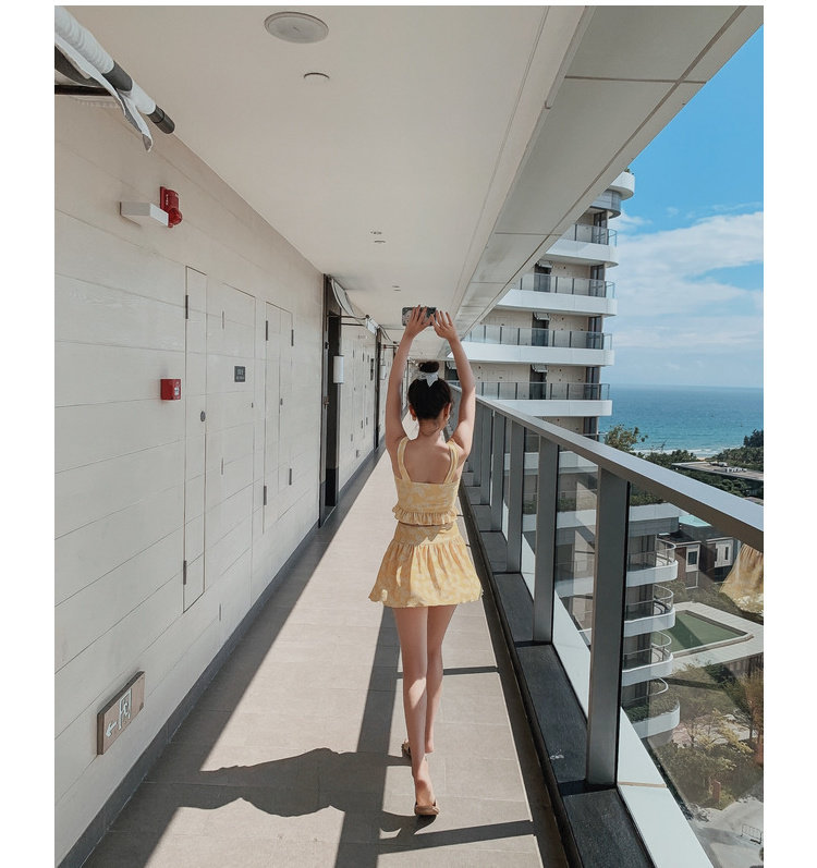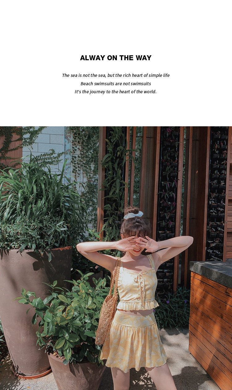 Элегантный желтый купальник, дизайн прост, чтобы иметь двух белых листьев, и есть небольшая конструкция морщин -конструкции в верхней части жилища.