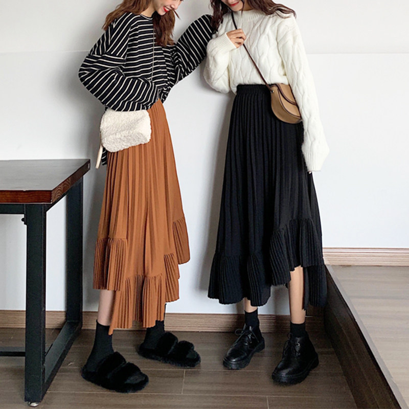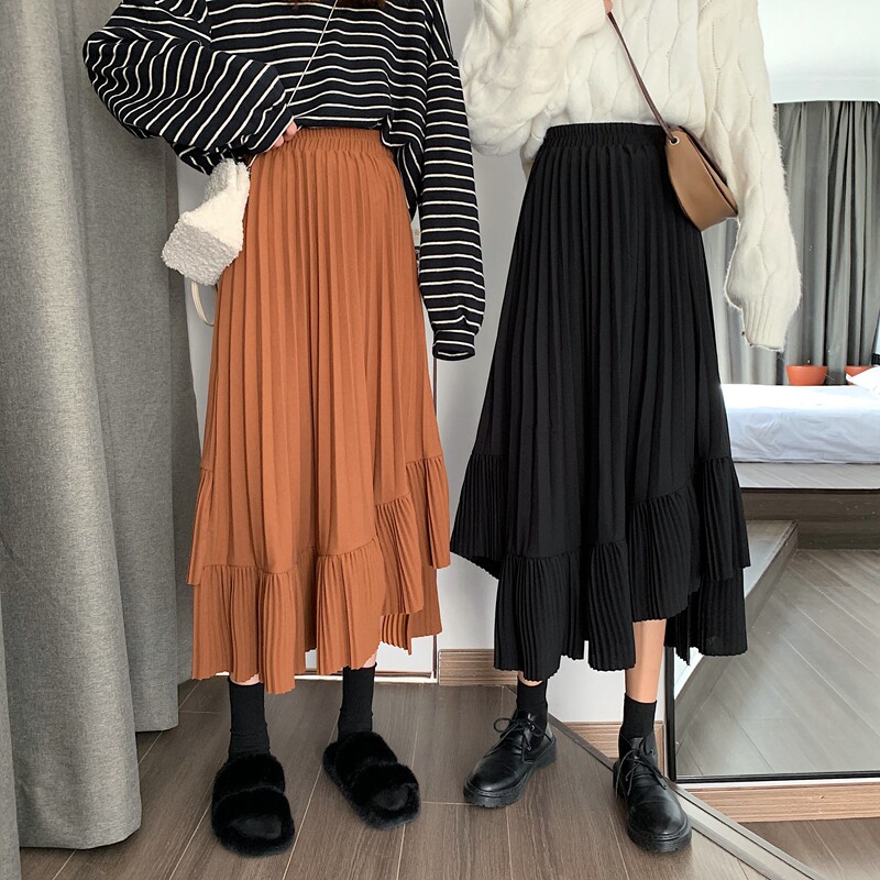 Черная осенняя юбка в складку, длинная длинная юбка, средней длины, высокая талия, А-силуэт