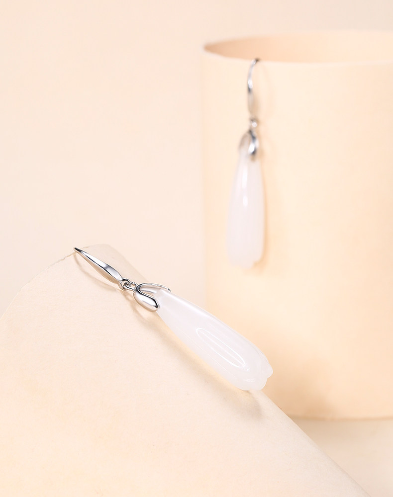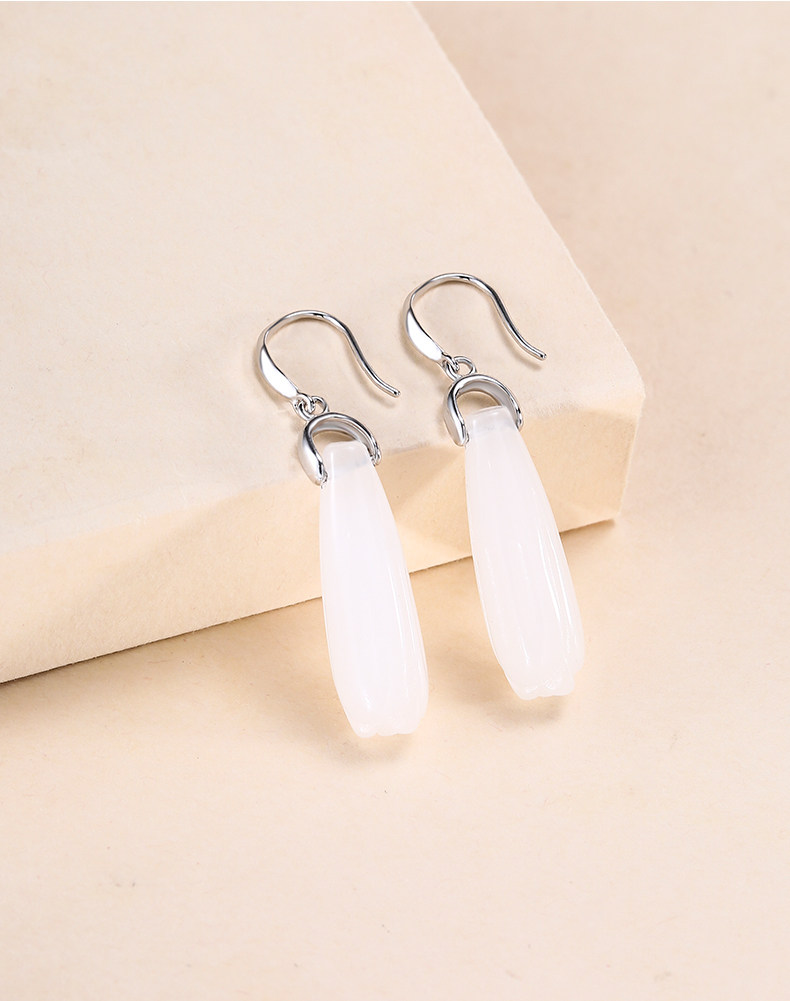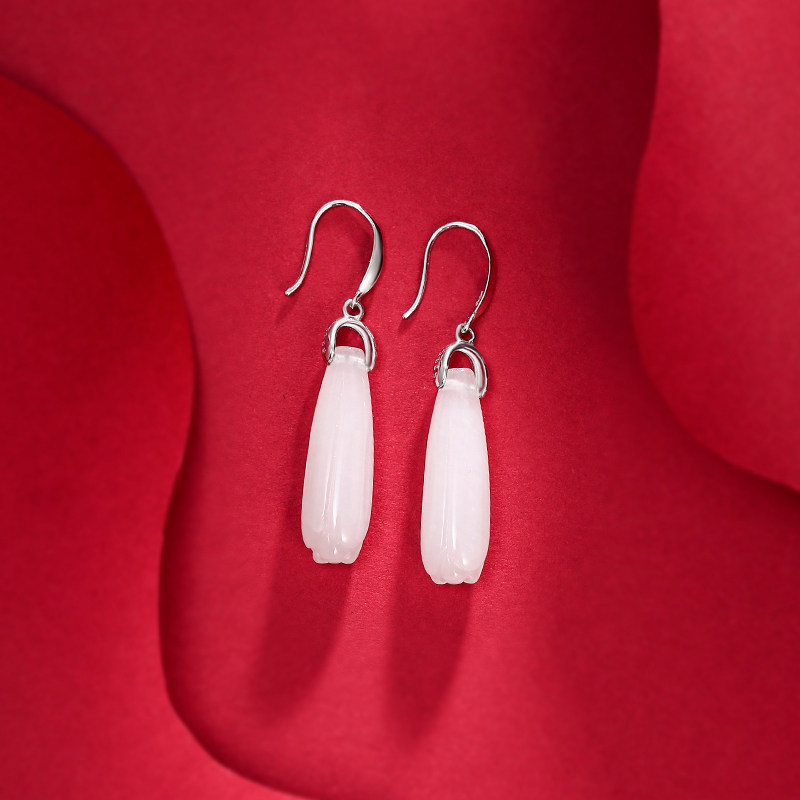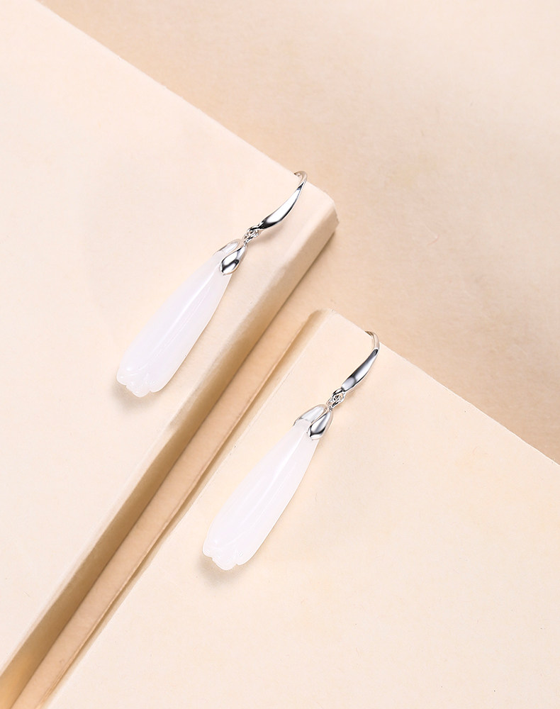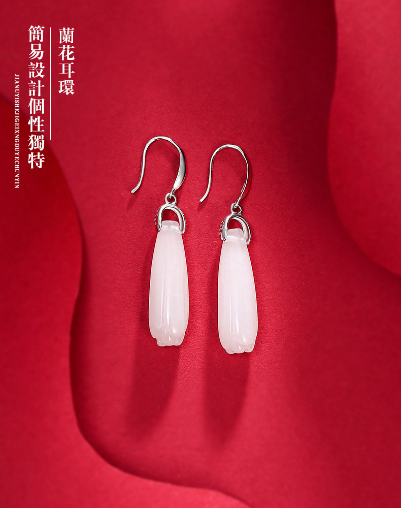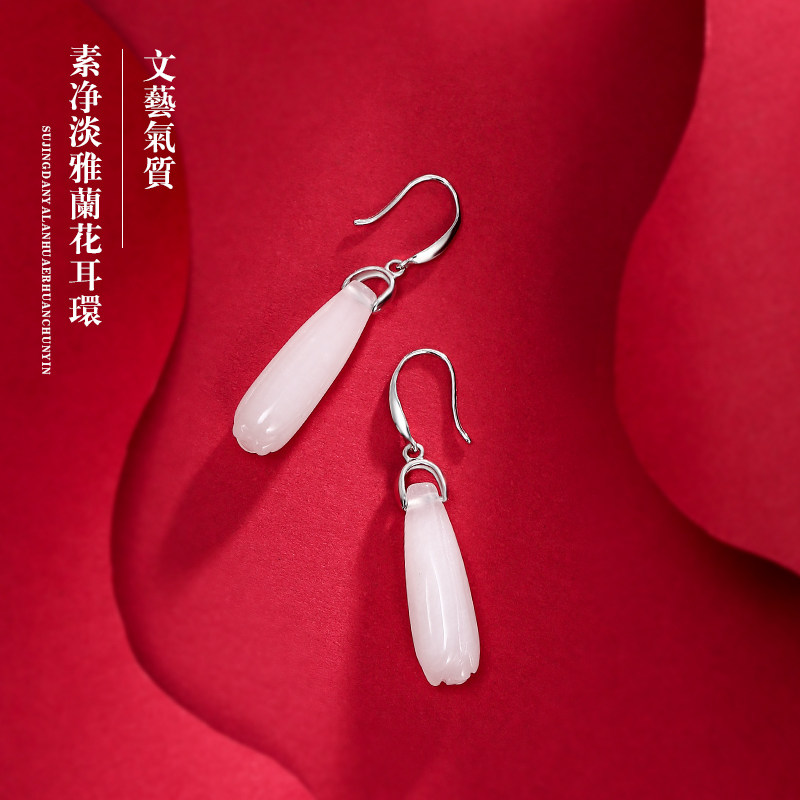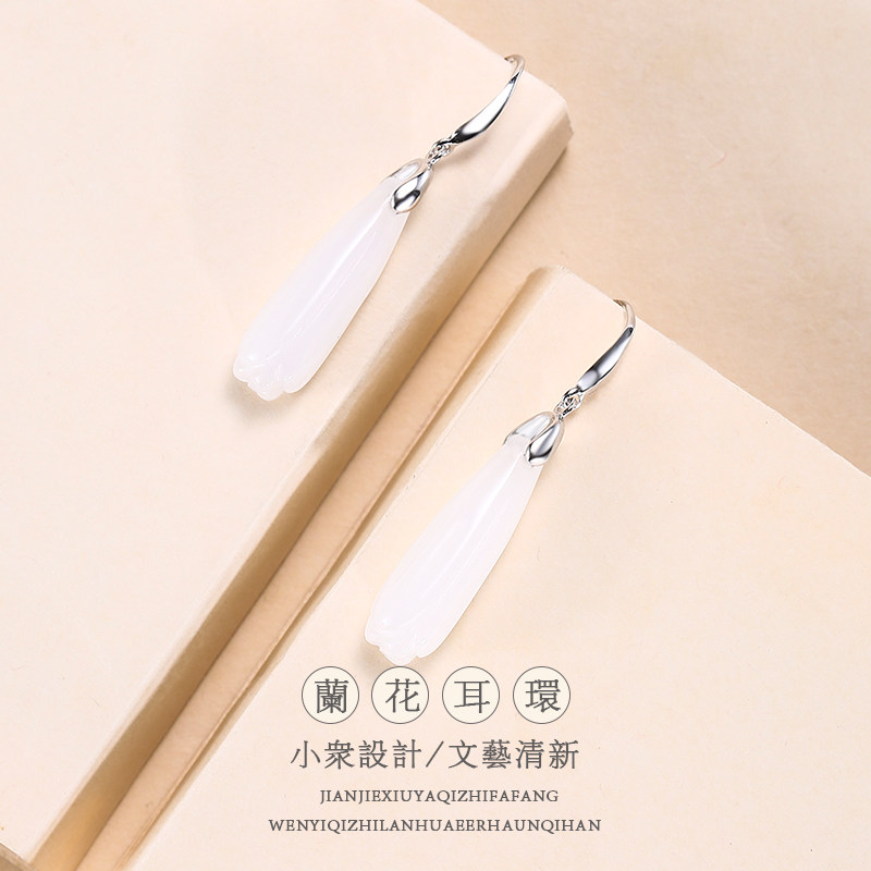 Серьги, инкрустация камня из нефрита, яшма из белого нефрита, серебро 925 пробы, орхидея, китайский стиль