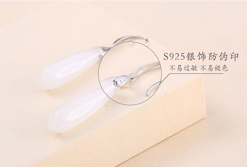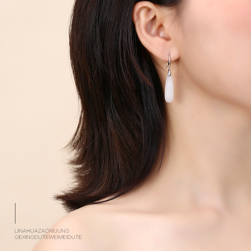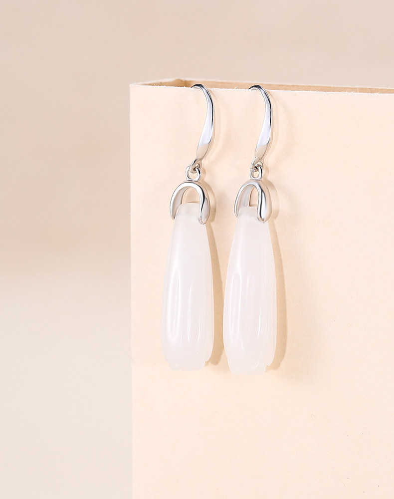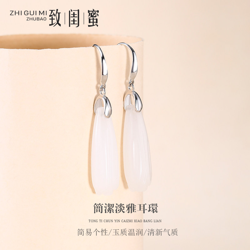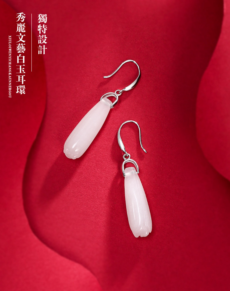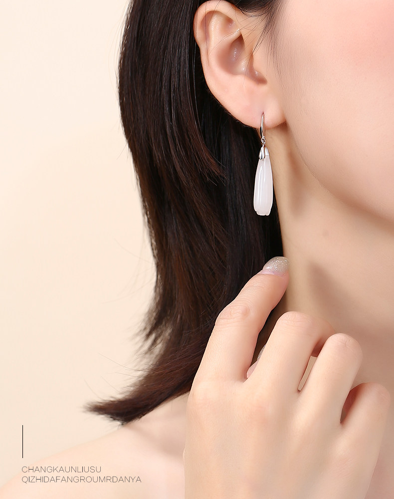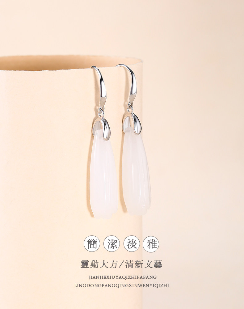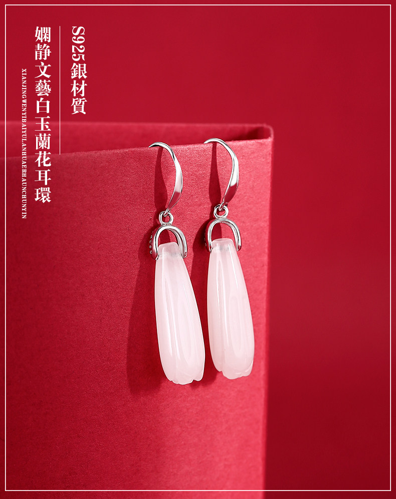 Серьги, инкрустация камня из нефрита, яшма из белого нефрита, серебро 925 пробы, орхидея, китайский стиль