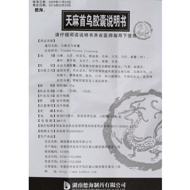 德海 Tianma Shouwu Капсулы 0,45 г*72 капсулы/коробка