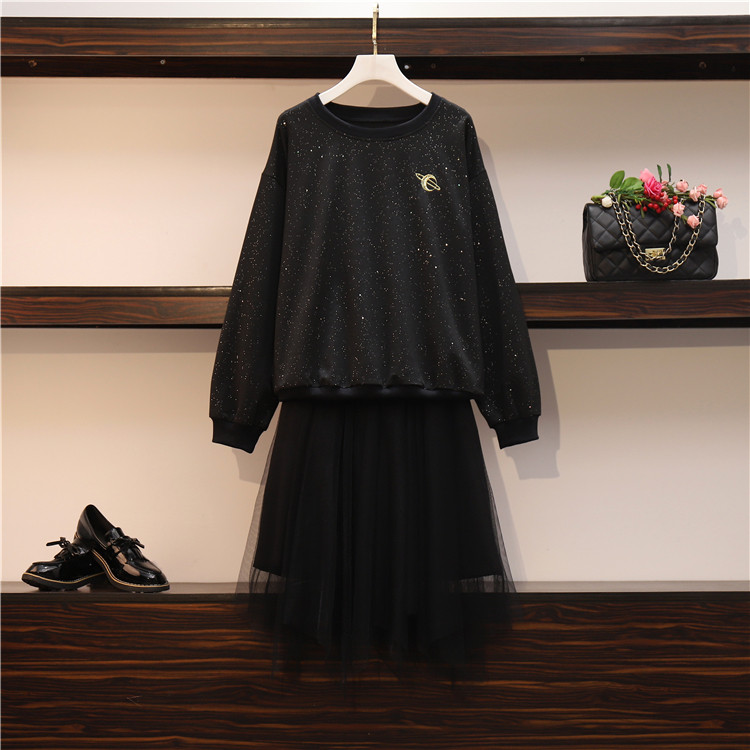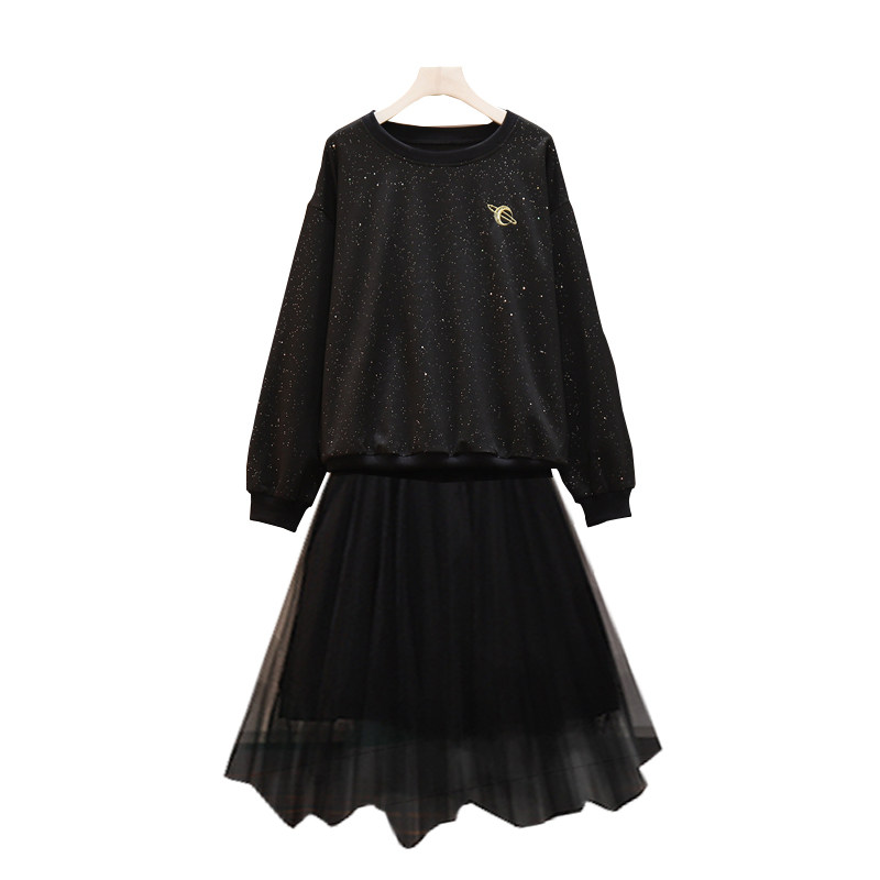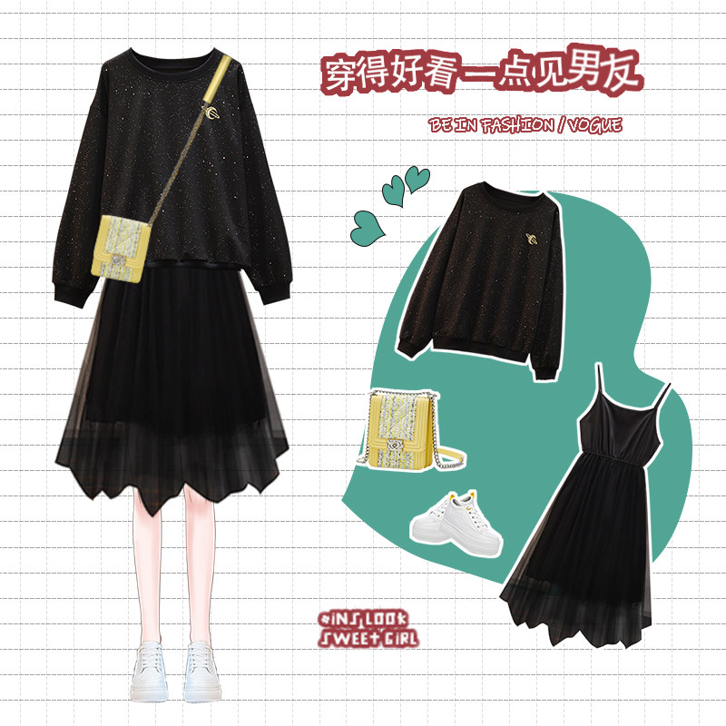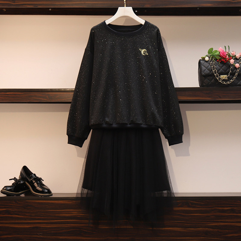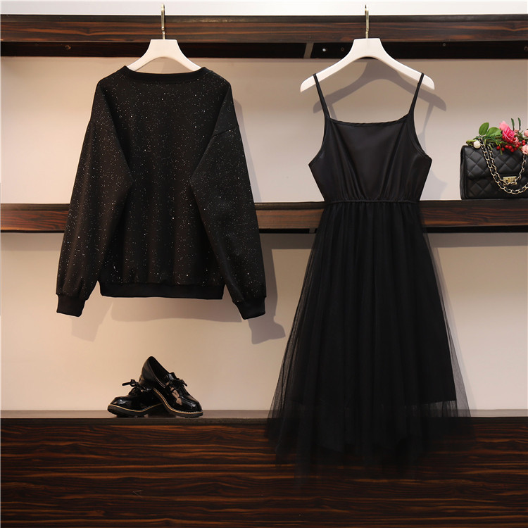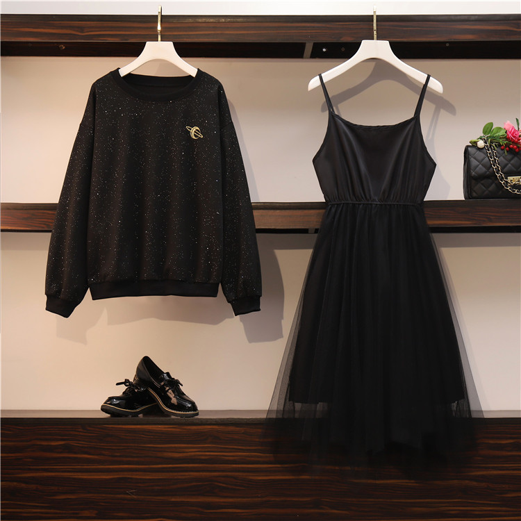 Весенняя осенняя толстовка, платье-комбинация, комплект, большой размер, подходит для полных девушек, свободный крой, в западном стиле