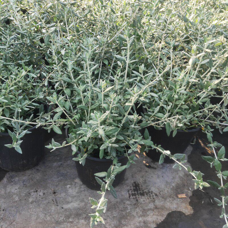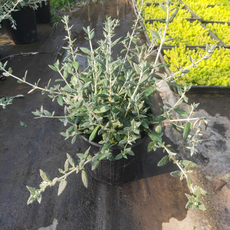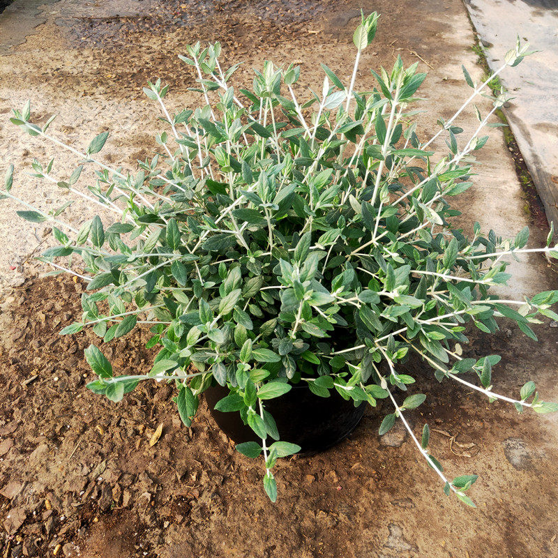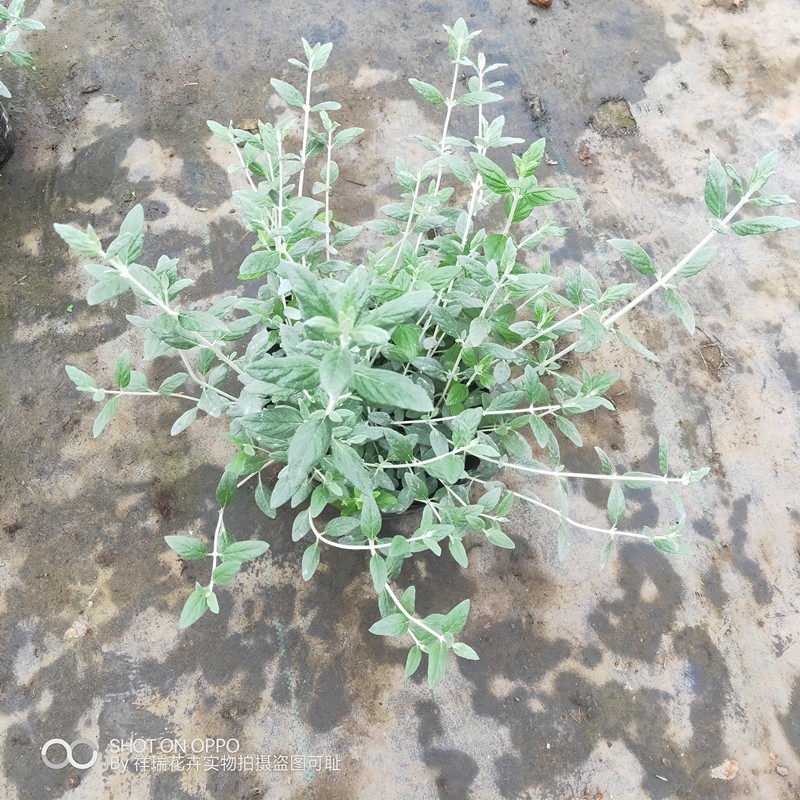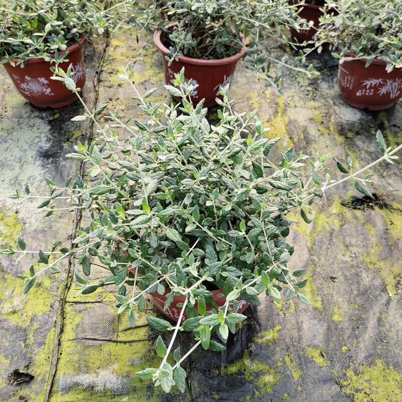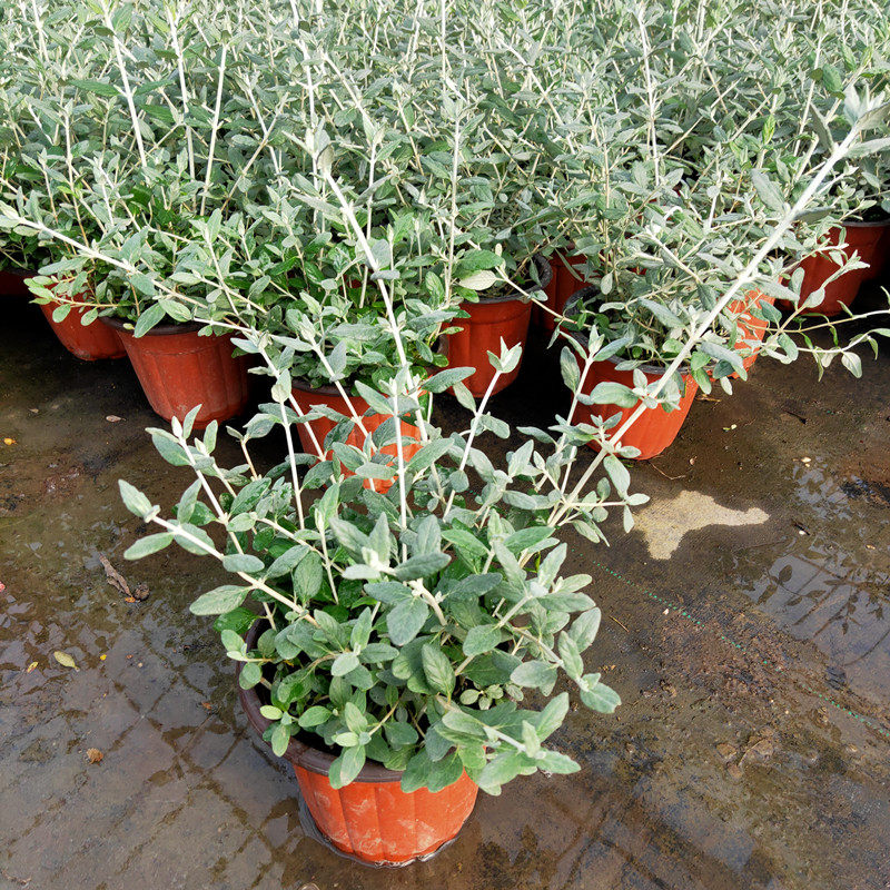 Саженцы цветов в горшках с серебряной фруктовой орхидеей, зеркальные растения на балконе во дворе, цветущие жаростойкие и морозостойкие садовые лиственные растения.
