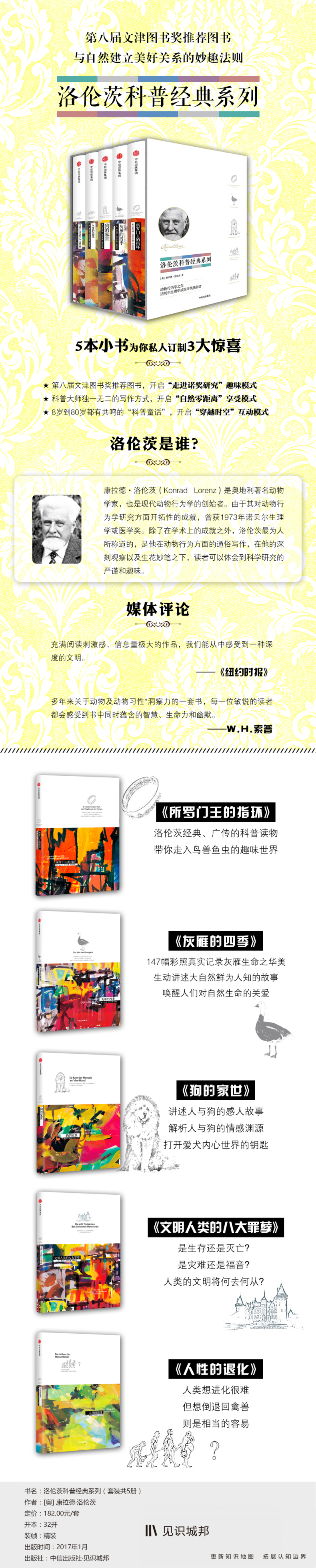 Лоренц - австрийский зоолог и основатель современного поведения животных.Из -за своих новаторских достижений в исследованиях поведения животных он получил Нобелевскую премию 1973 года в области физиологии.В дополнение к академическим достижениям, Лоренц наиболее известен его популярным письмом в поведении животных.Он является автором «Кольца короля Соломона», «Четыре сезона серого гуся», «Семья собаки», «Секрет нападения» и другие работы.Под его глубоким наблюдением и давлением цветов читатели могут оценить строгость и интерес к научным исследованиям.