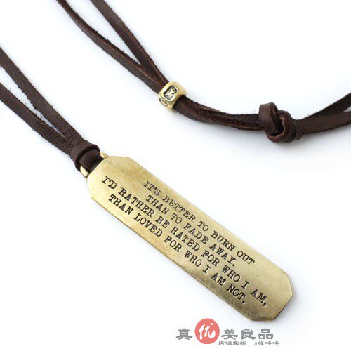 Ожерелье с выгравированной на нем цитатой Курта Дональда Кобейна.Лучше сгореть, чем исчезнуть. Лучше сгореть, чем исчезнуть.я предпочитаю, чтобы меня ненавидели за то, кто я есть, чем любили за то, кем я не являюсь“Я предпочитаю оставаться верным себе и быть ненавидимым, чем притворяться кем-то другим и быть любимым.”аксессуар-амулет