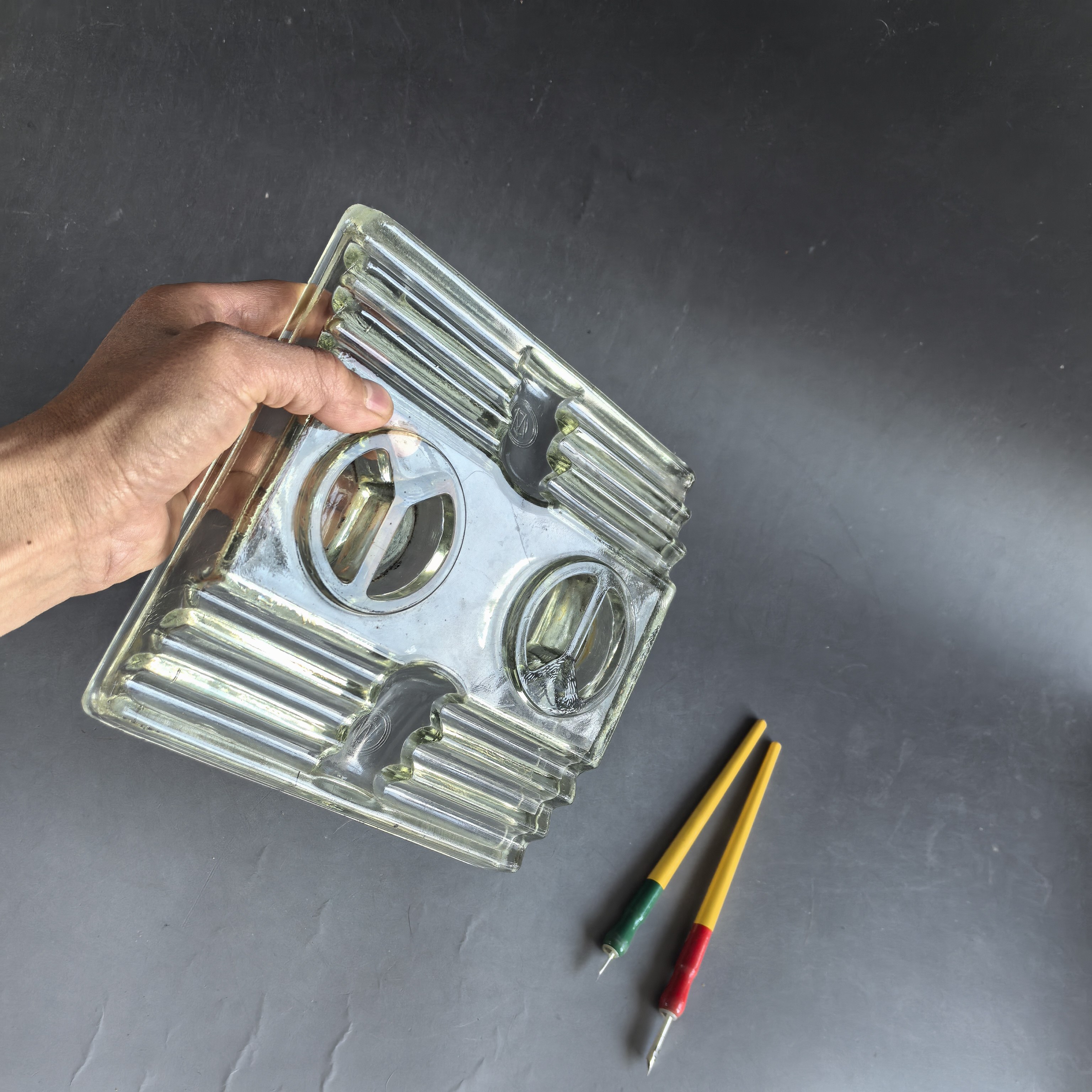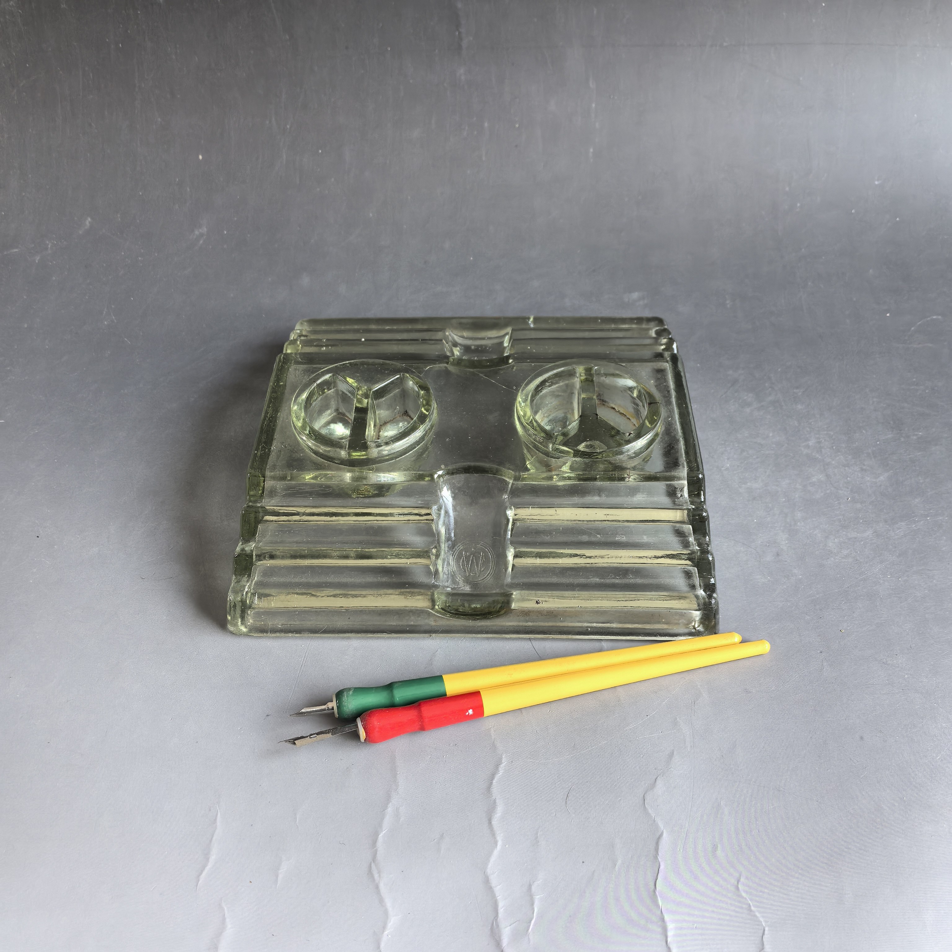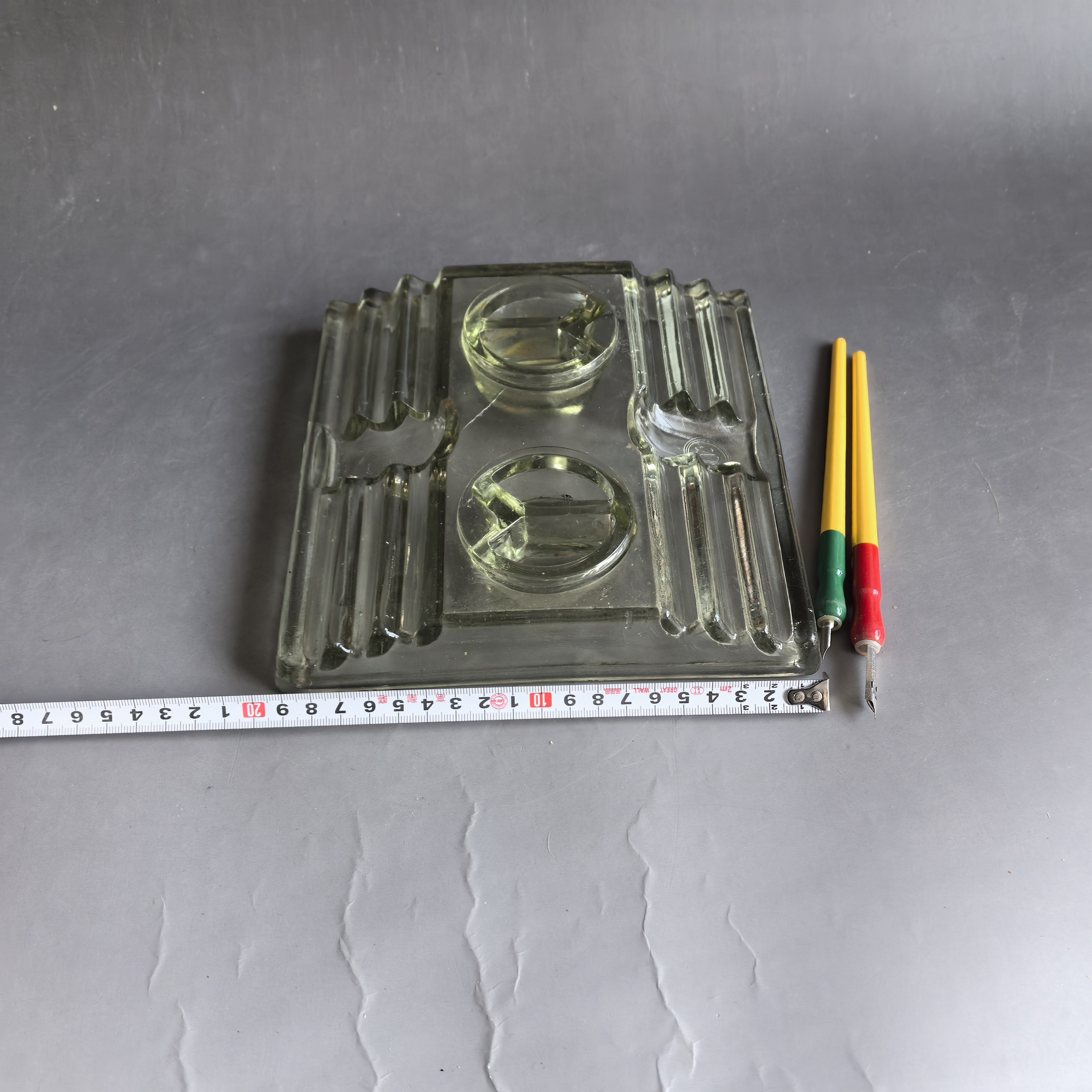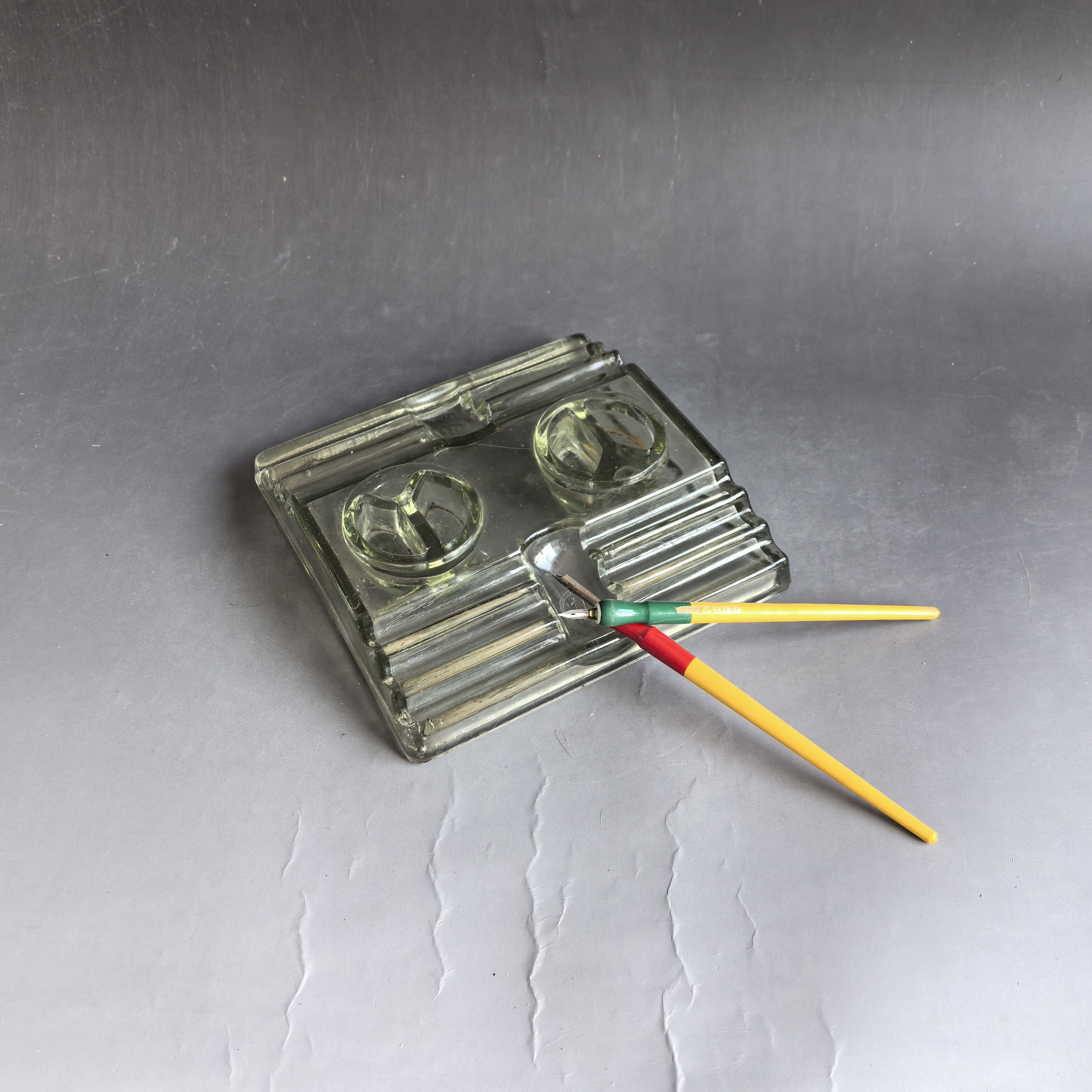 [大型墨水台,尺寸较大,品相完好,有制作时的玻璃纹,并非裂纹。送笔2支。]