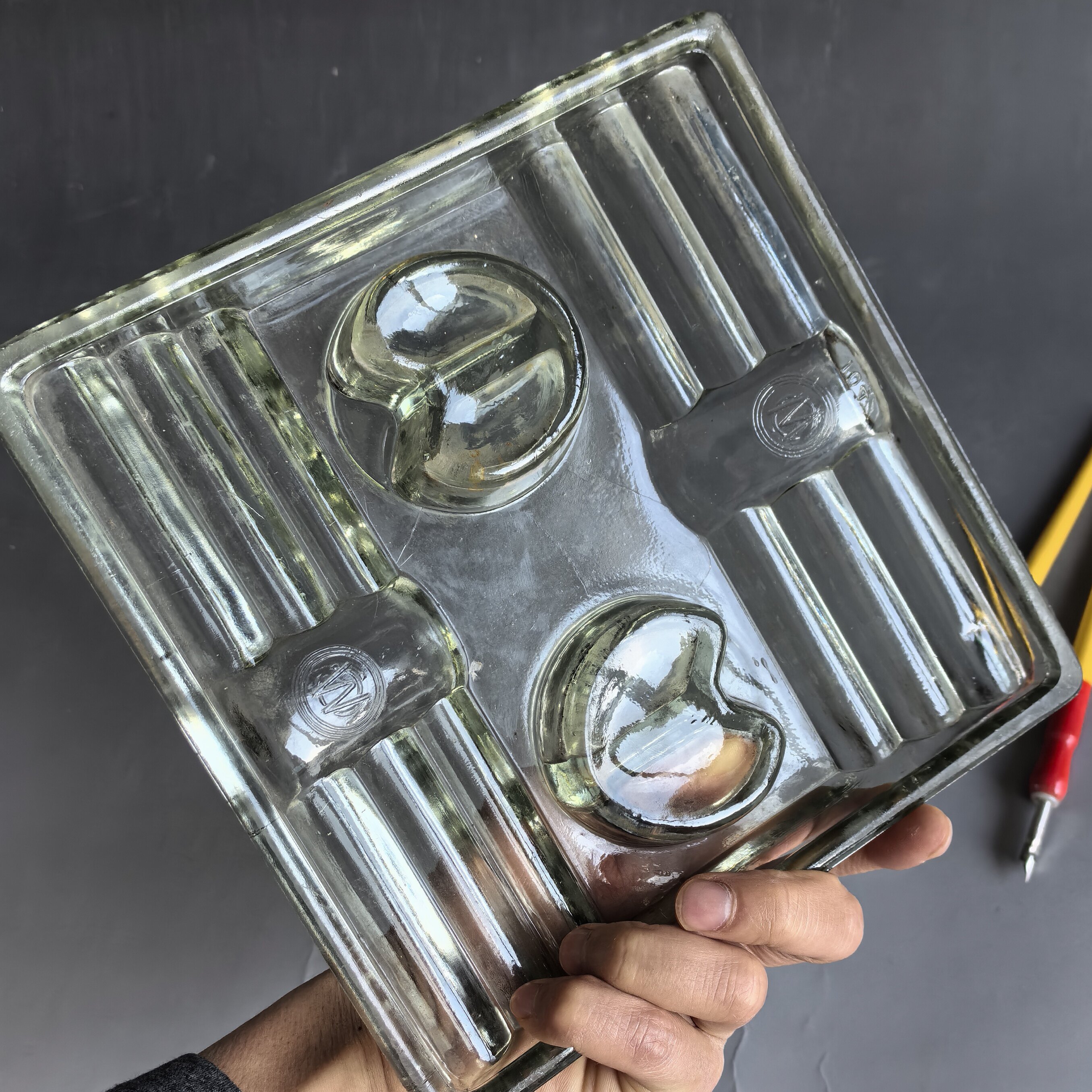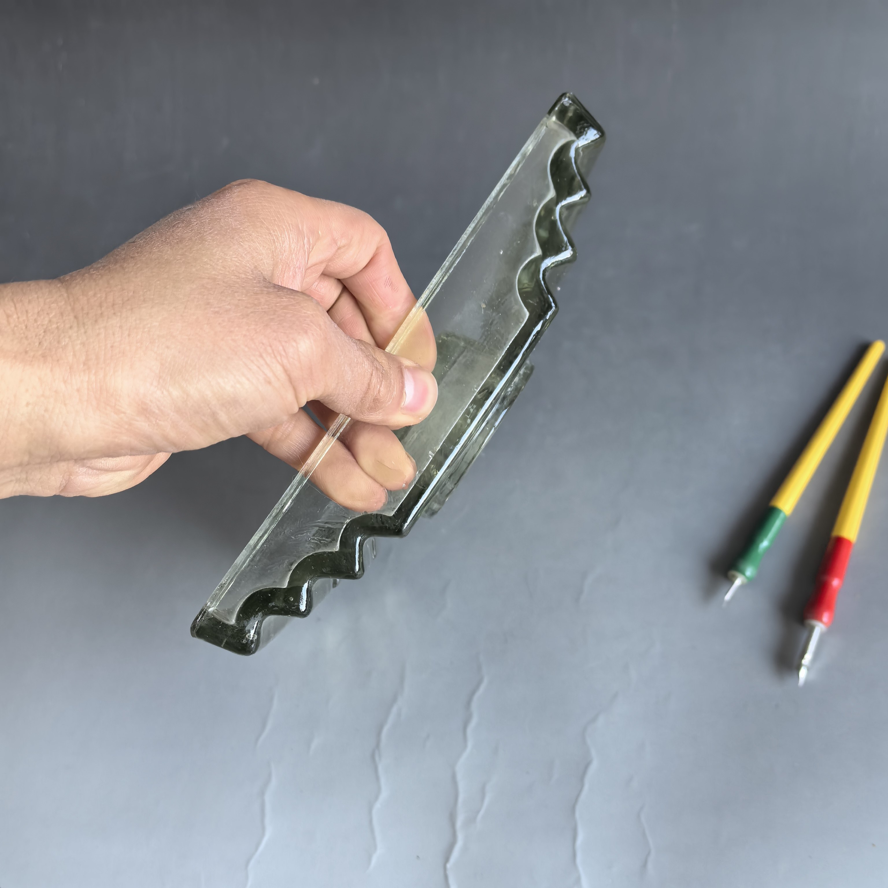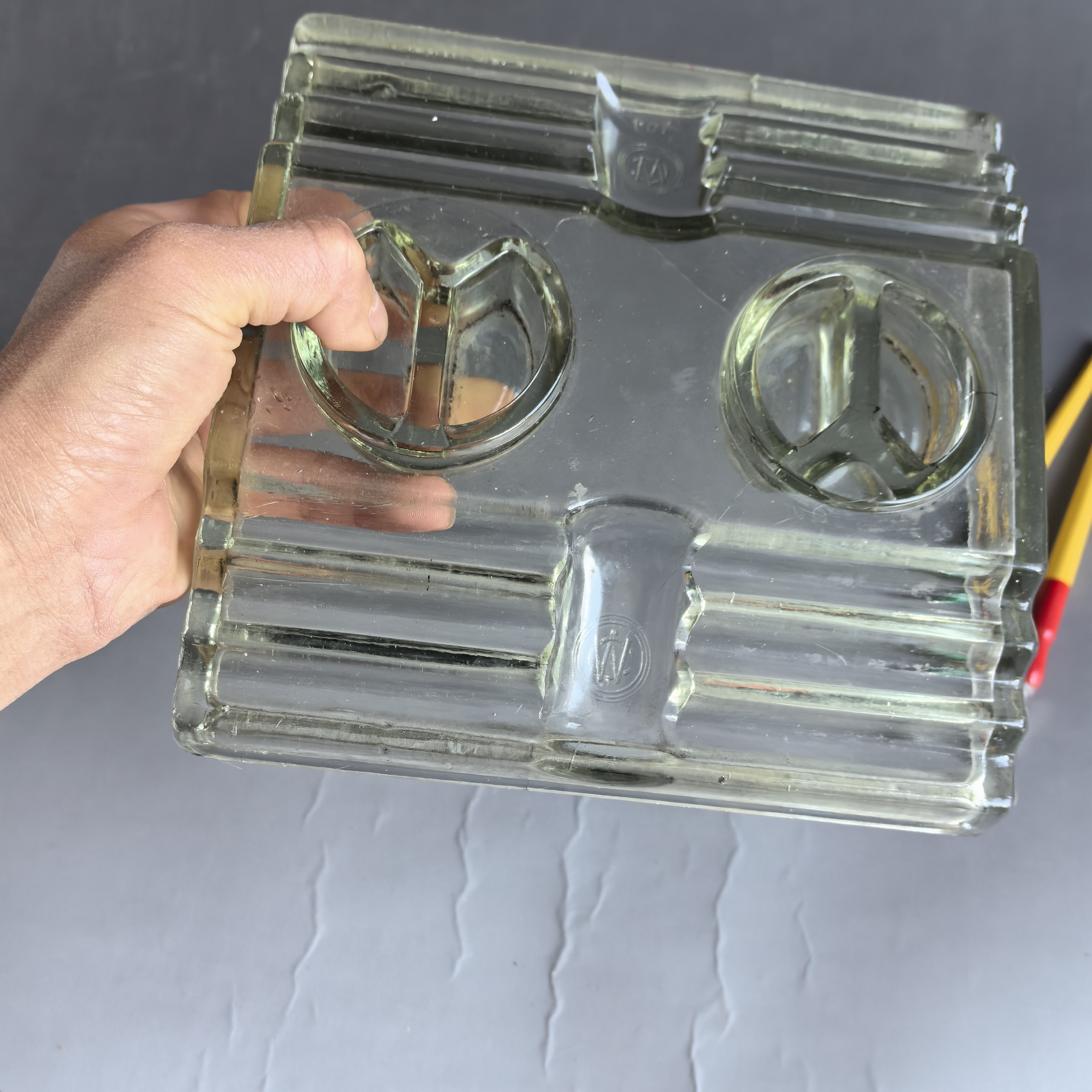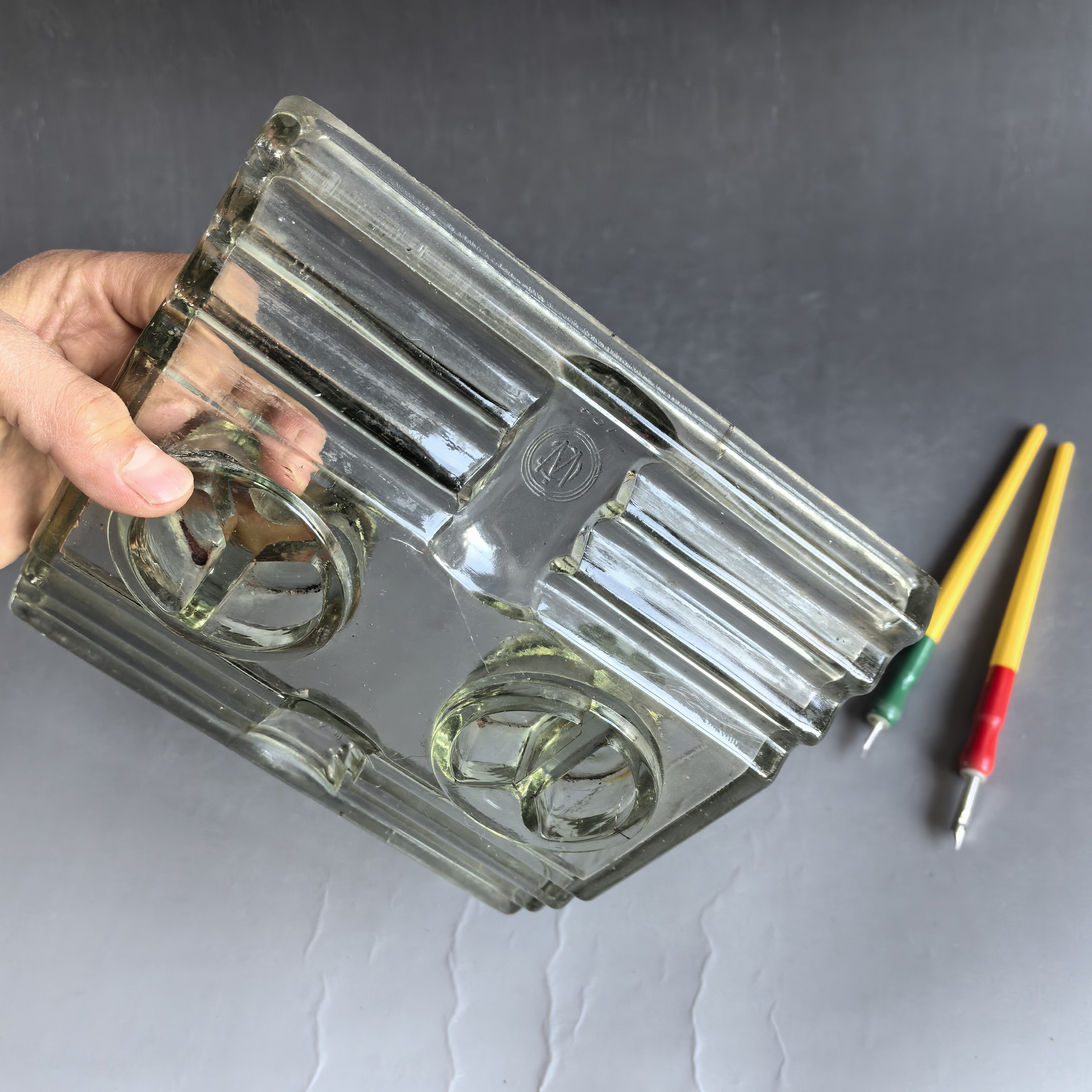 [大型墨水台,尺寸较大,品相完好,有制作时的玻璃纹,并非裂纹。送笔2支。]
