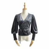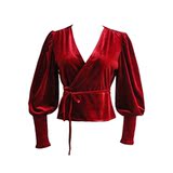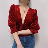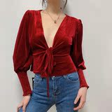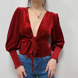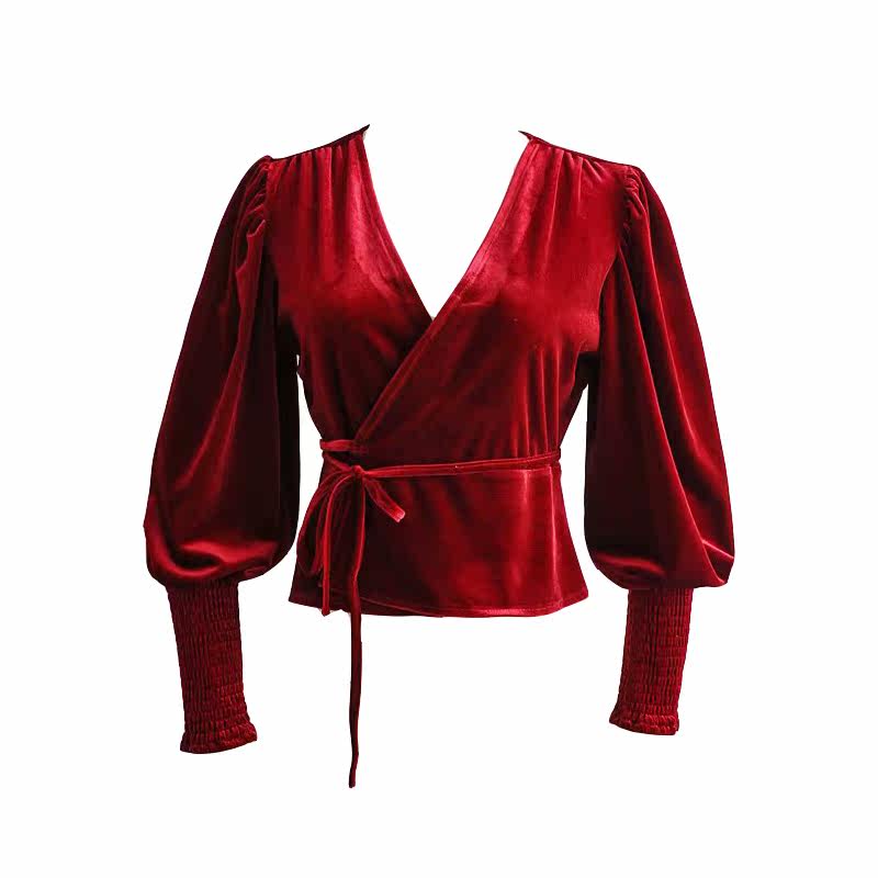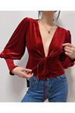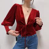 Ремень, лонгслив, короткий фонарь, бархатная утеплённая рубашка, на шнурках, V-образный вырез