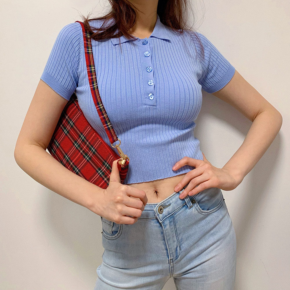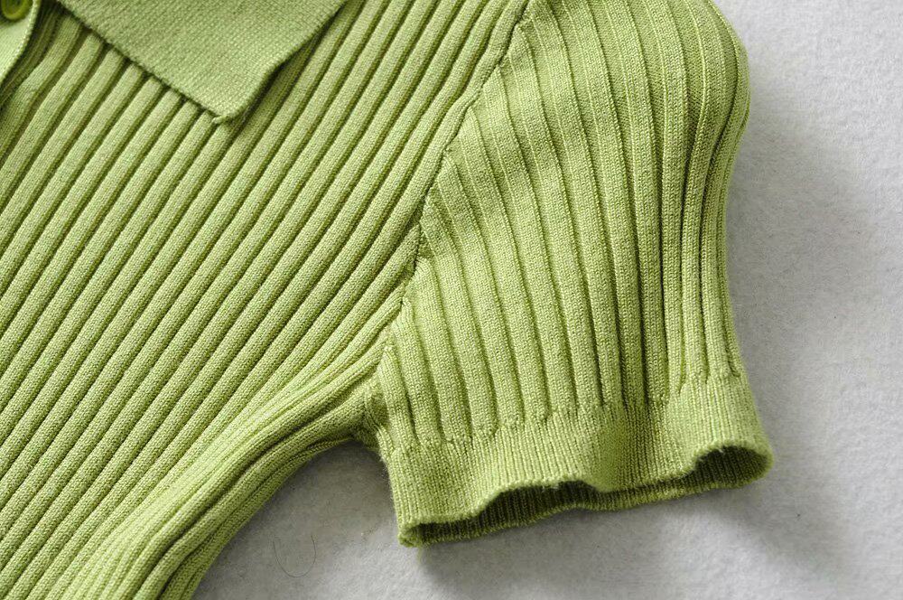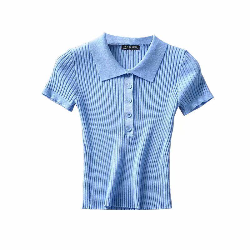 Летний ретро короткий трикотажный свитер, футболка, воротник поло, облегающий крой