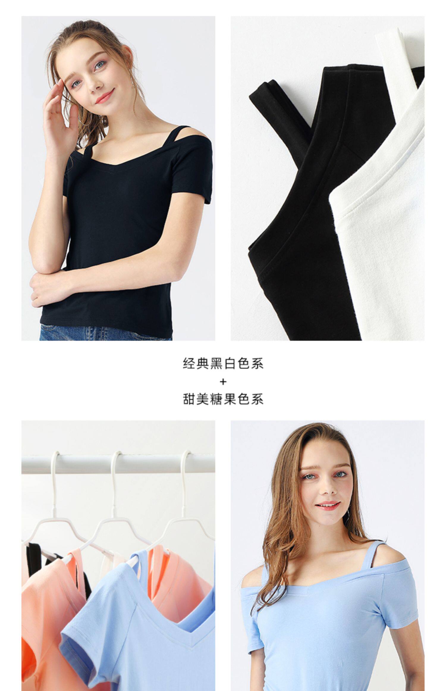 艾米恋 Летняя тонкая приталенная хлопковая белая футболка, открытые плечи, эффект подтяжки, V-образный вырез