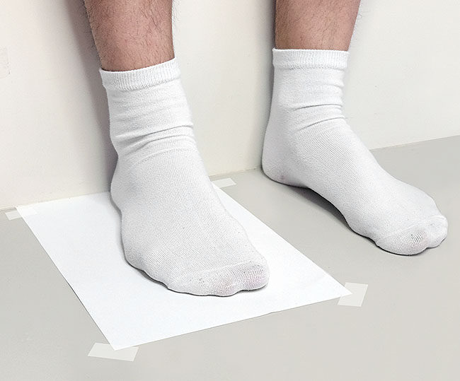 1. Положите лист белой бумаги на стену,Пятки у стены,Выпрямить пальцы ног