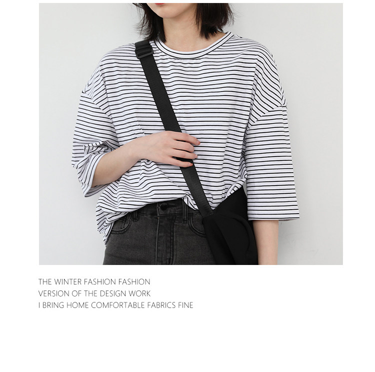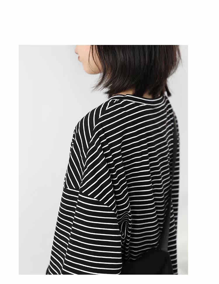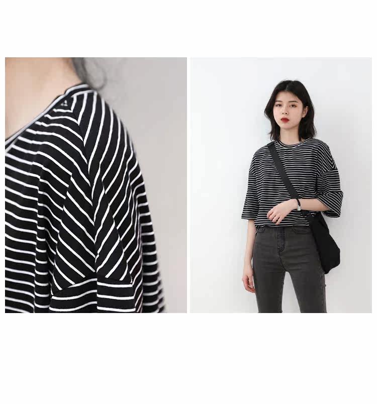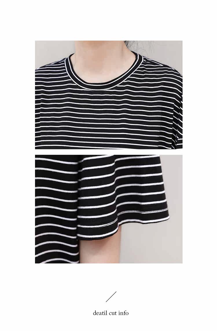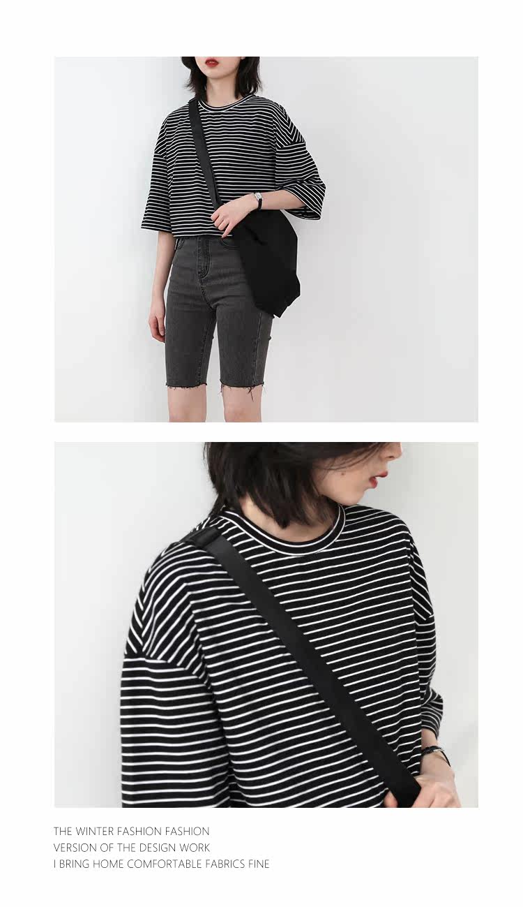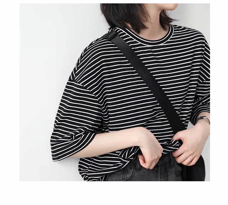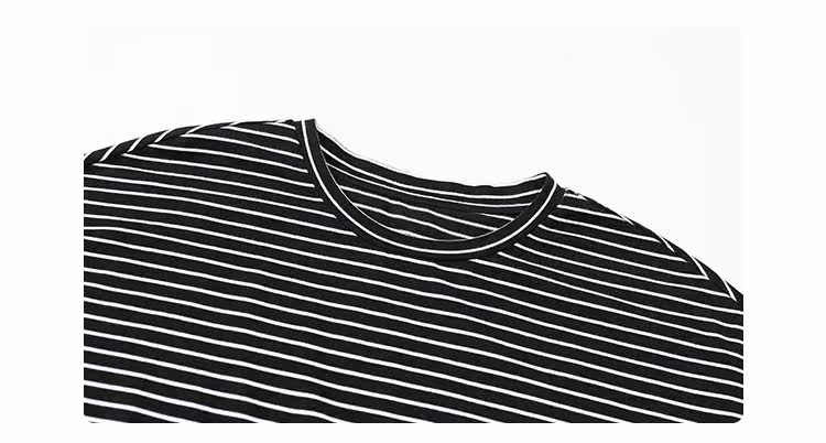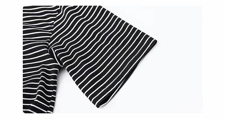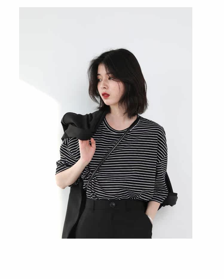 Круглая шея и цветовая нить край, тонкое снижение возраста ZhiСвободный пять -точечный дизайн рукава, скрытое поклонение мясоШитье автомобиля плоское и плотное, показывая ощущение деталей мастерстваЧерно -белые полосы, классическиеНелегко взглянуть на универсальный
