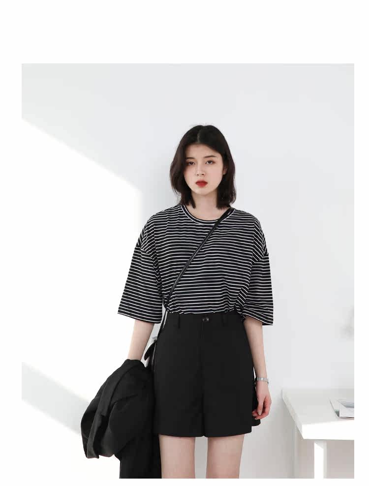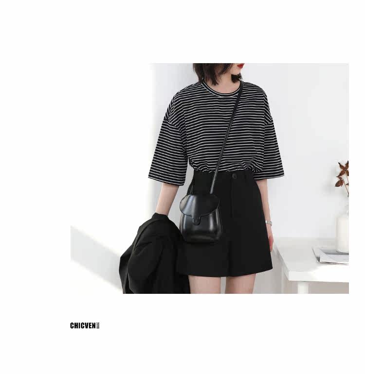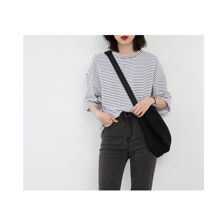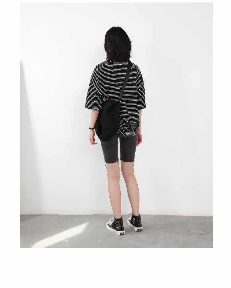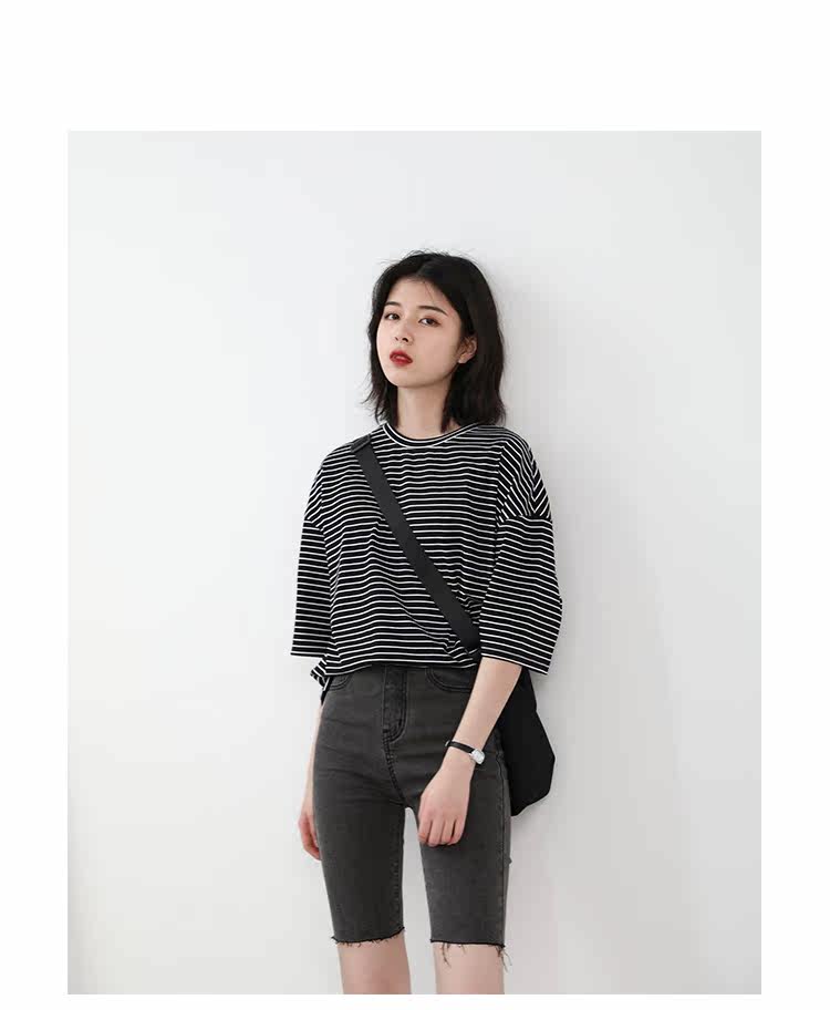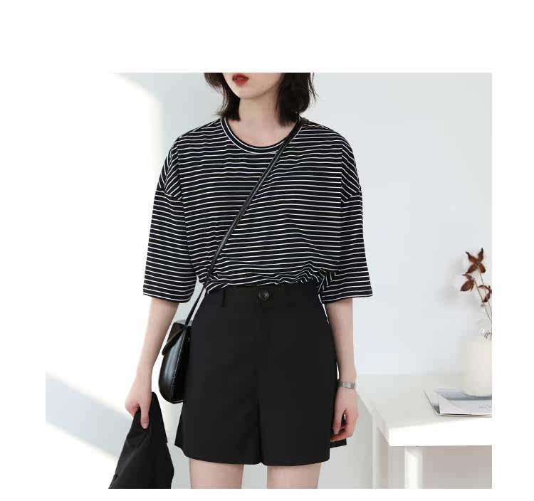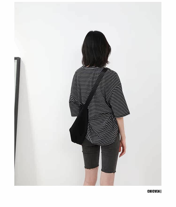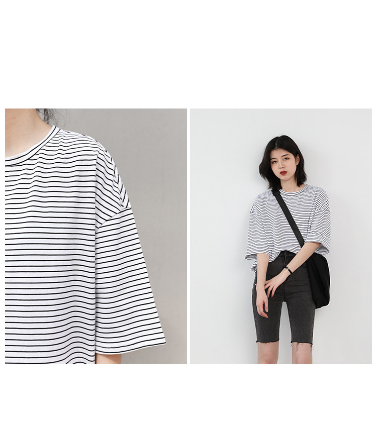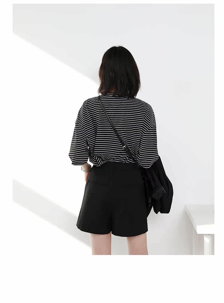 Круглая шея и цветовая нить край, тонкое снижение возраста ZhiСвободный пять -точечный дизайн рукава, скрытое поклонение мясоШитье автомобиля плоское и плотное, показывая ощущение деталей мастерстваЧерно -белые полосы, классическиеНелегко взглянуть на универсальный