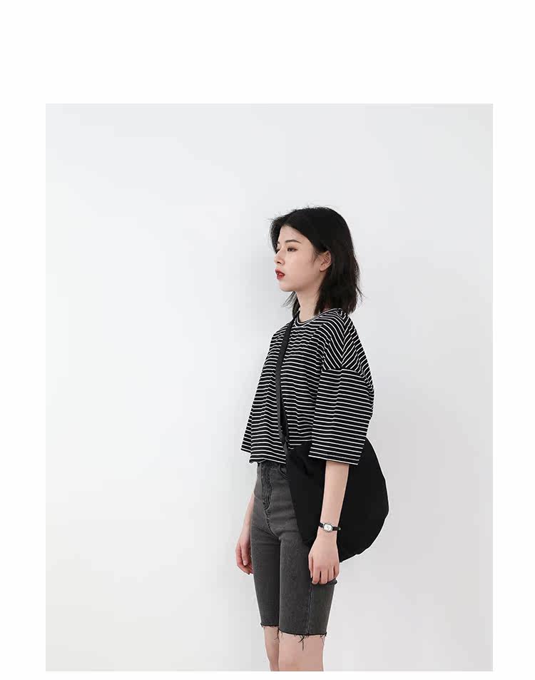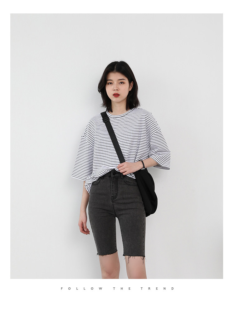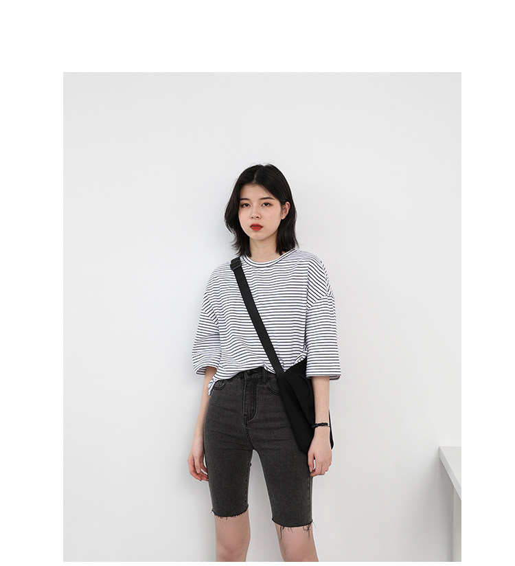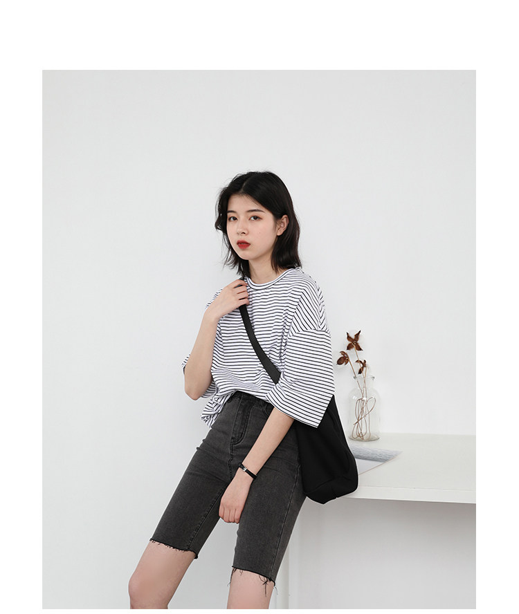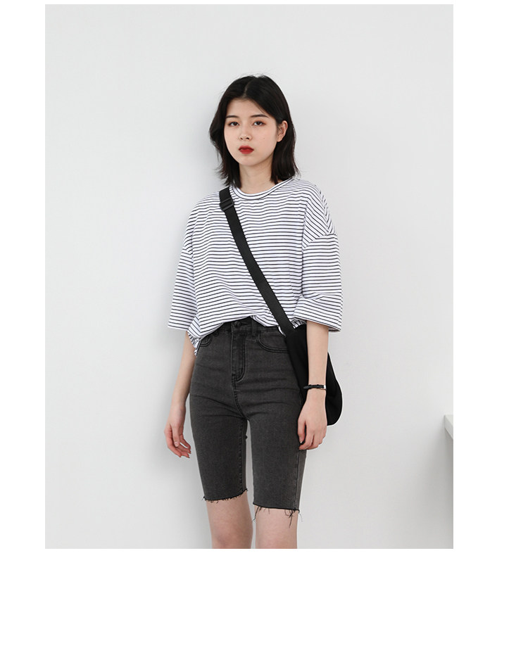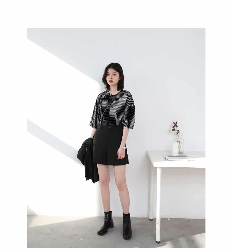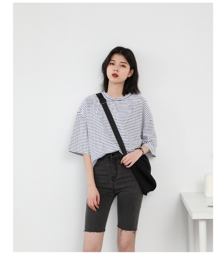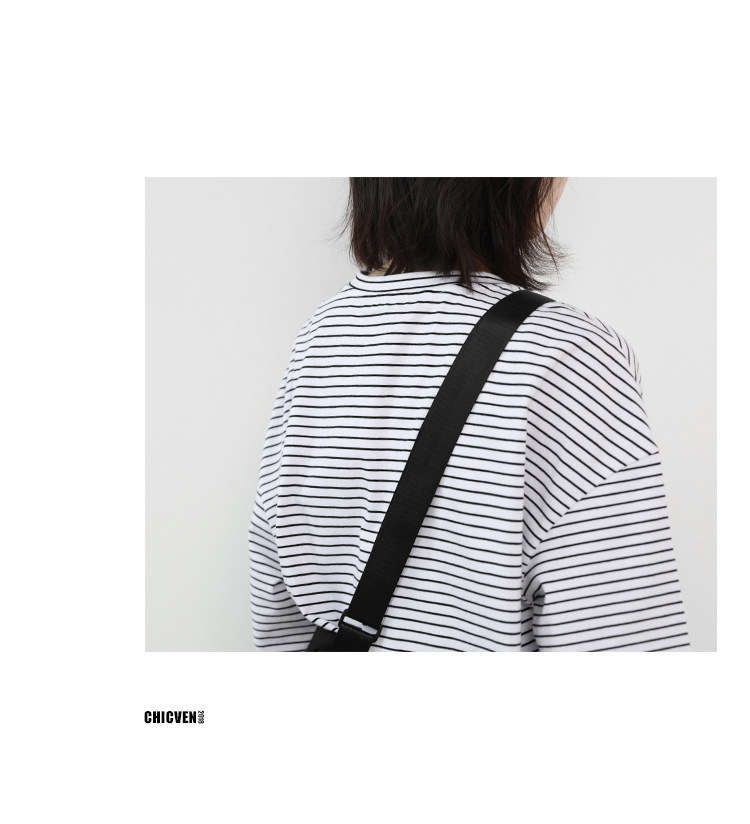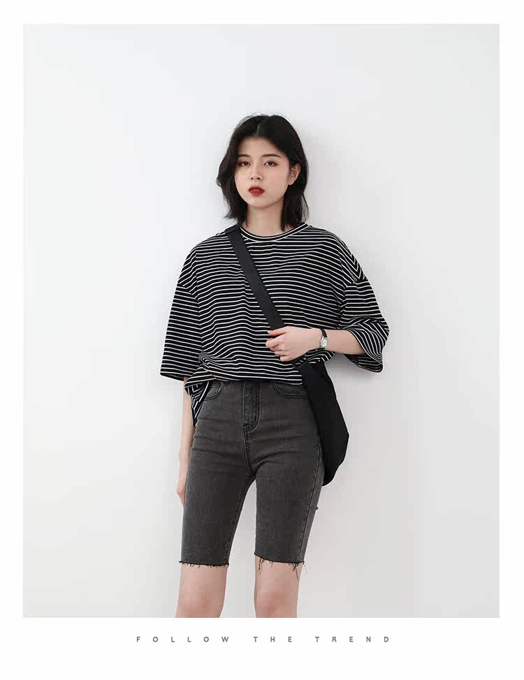 Круглая шея и цветовая нить край, тонкое снижение возраста ZhiСвободный пять -точечный дизайн рукава, скрытое поклонение мясоШитье автомобиля плоское и плотное, показывая ощущение деталей мастерстваЧерно -белые полосы, классическиеНелегко взглянуть на универсальный
