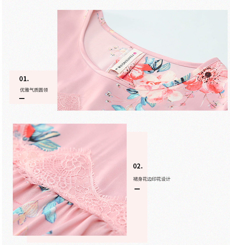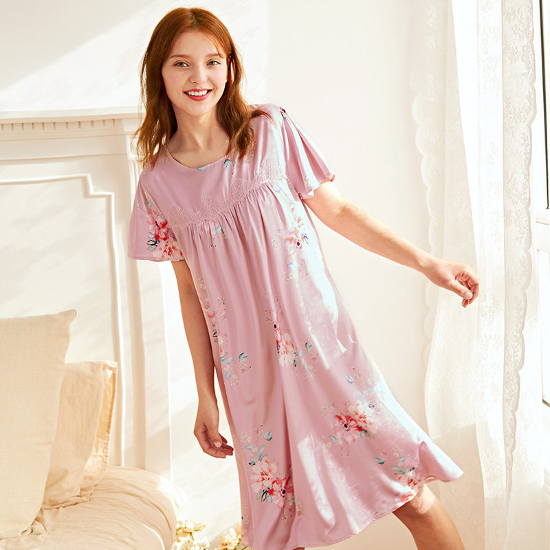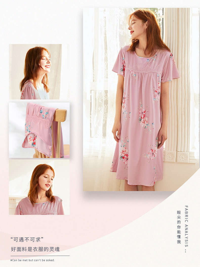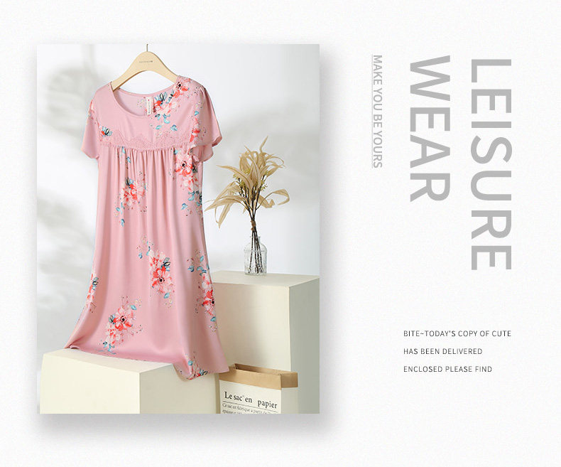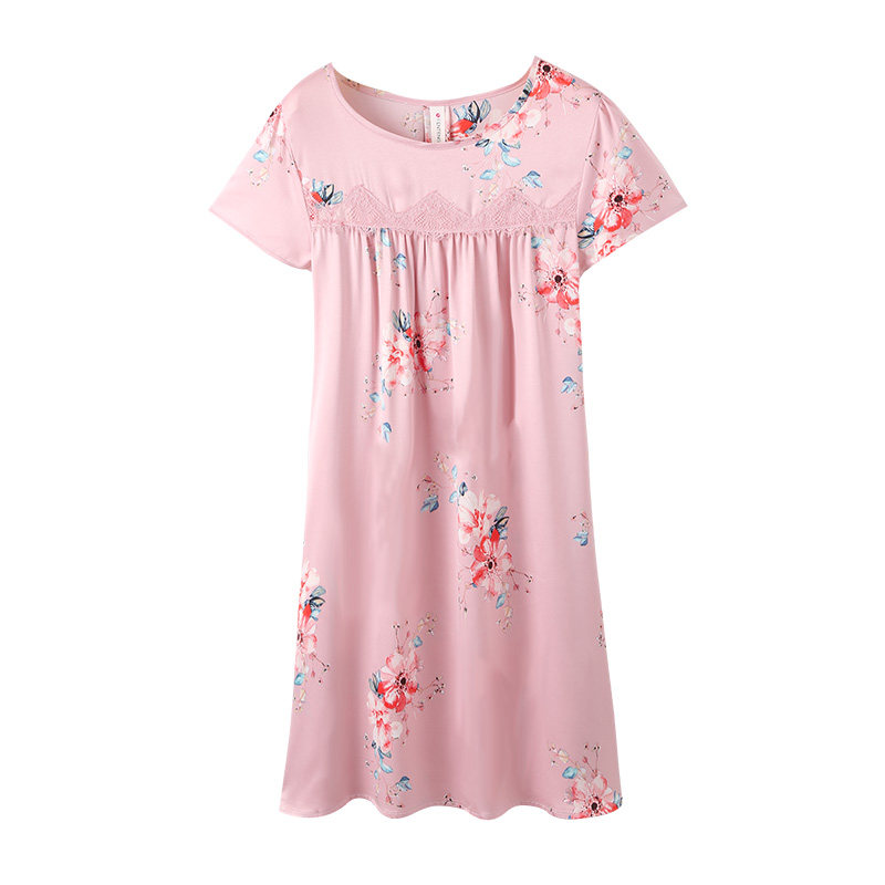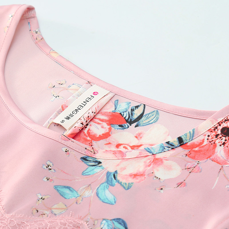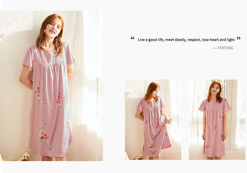 芬腾 Летняя шелковая милая пижама, длинное шелковое платье с круглым воротником, короткий рукав, средней длины