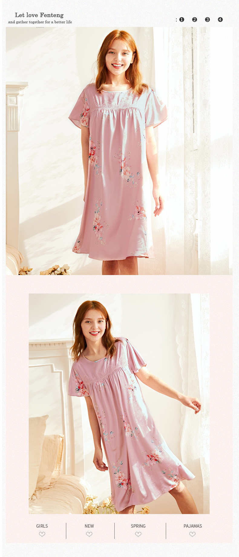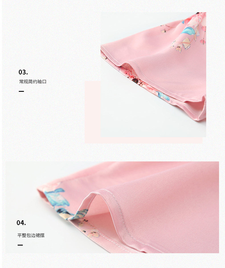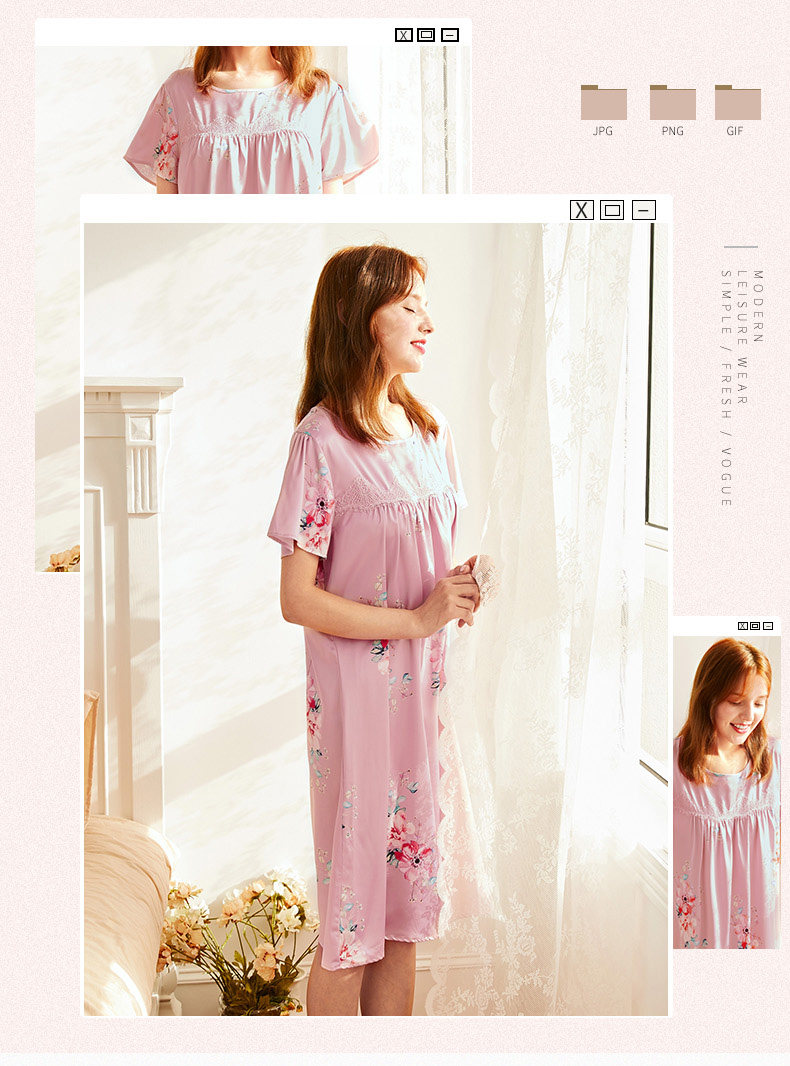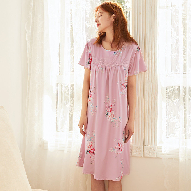 芬腾 Летняя шелковая милая пижама, длинное шелковое платье с круглым воротником, короткий рукав, средней длины