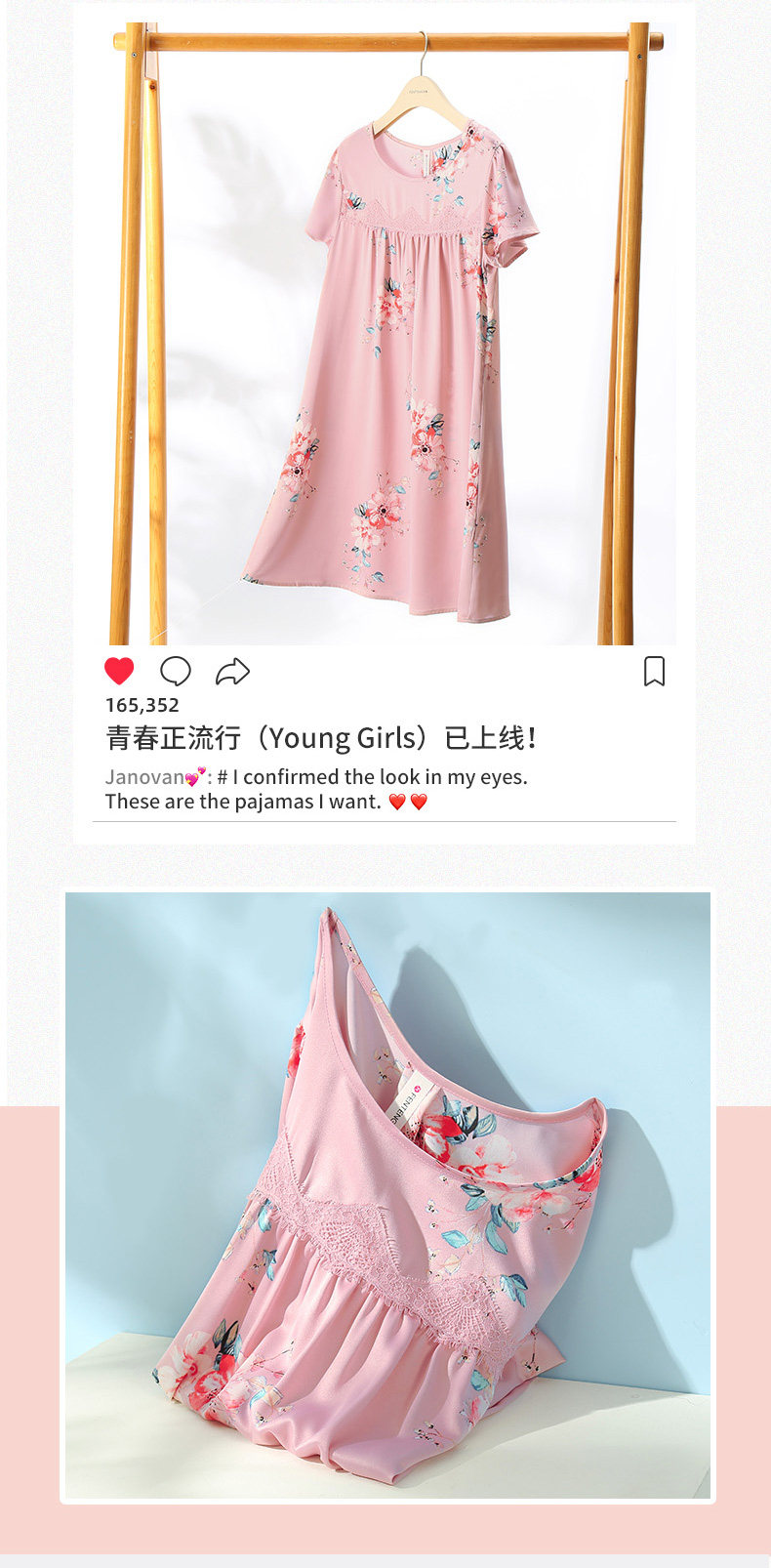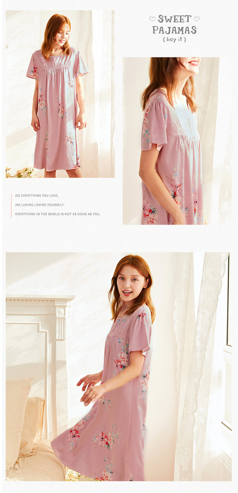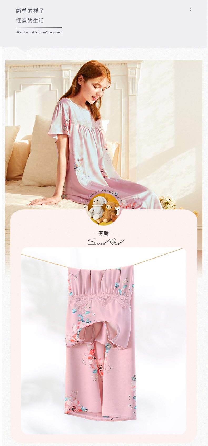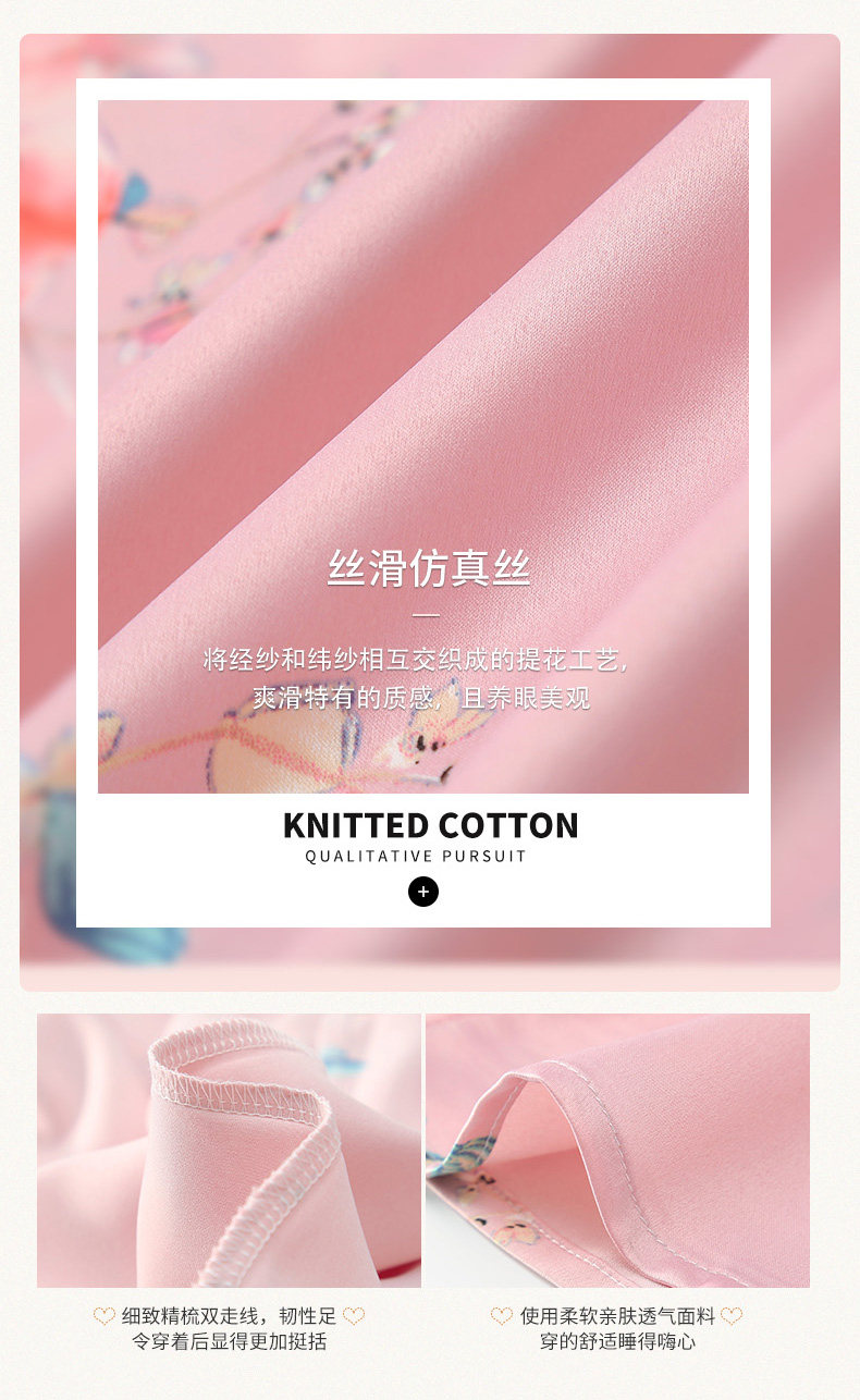 芬腾 Летняя шелковая милая пижама, длинное шелковое платье с круглым воротником, короткий рукав, средней длины