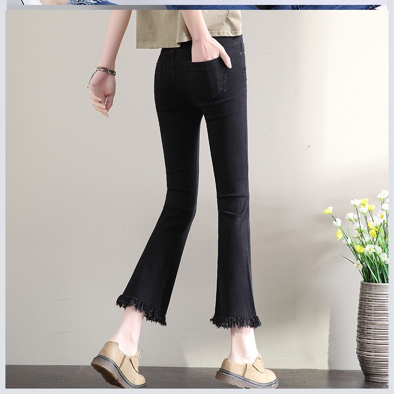 2020 корейская версия весенне-осенних женских новых стильных черных джинсов с девятью точками для студентов, модные расклешенные брюки с необработанными краями