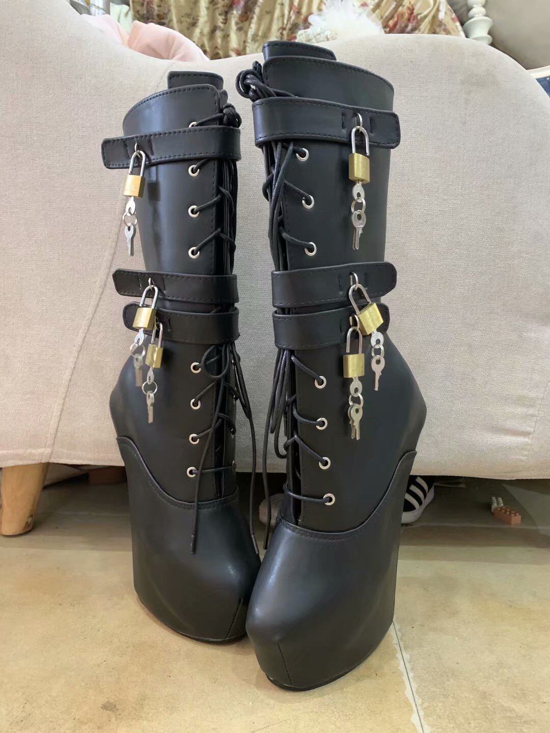 Черный матовый искусственная кожа в европейском и американском стиле. Короткие ботинки на платформе без каблука 18 см. Сапоги-подковы специальной формы на каблуке ZDX3.
