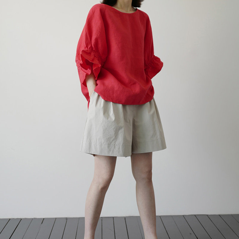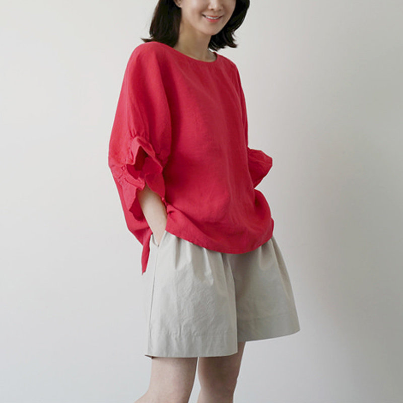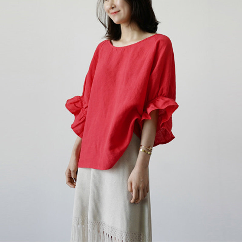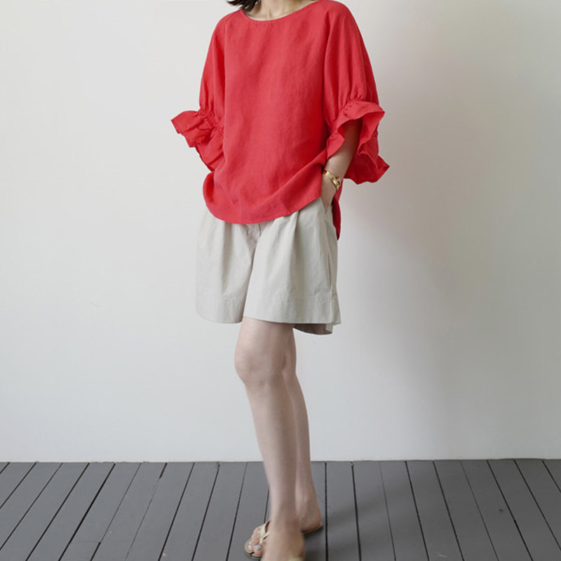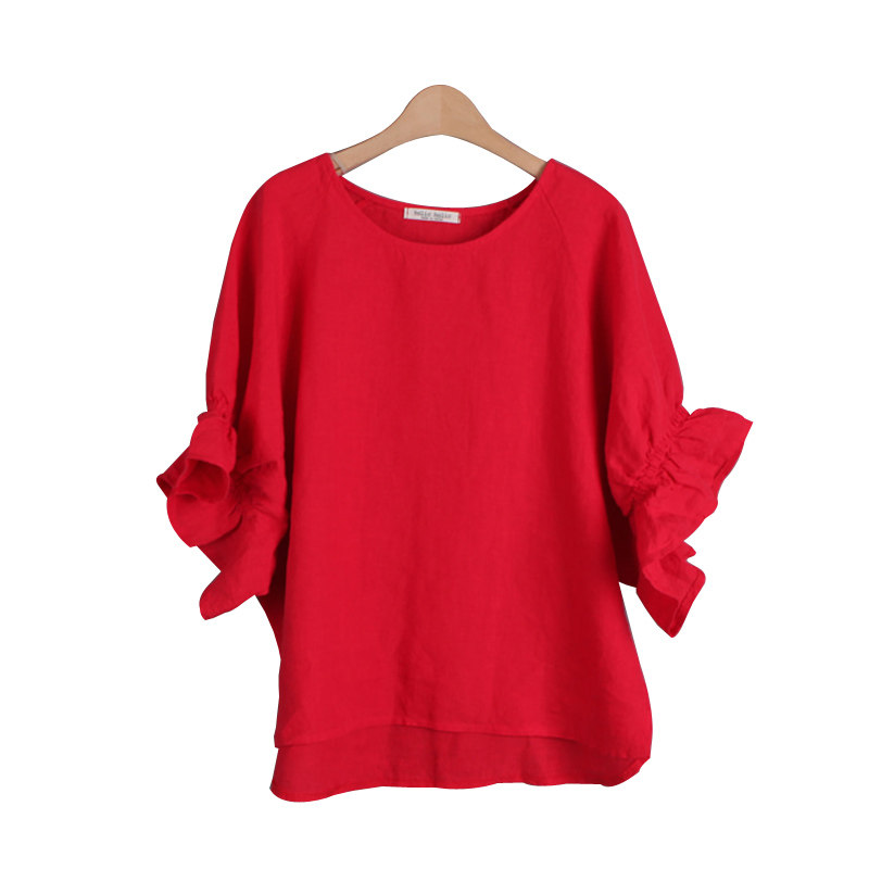 Летняя красная футболка для отдыха, 2020, короткий рукав, оверсайз, из хлопка и льна