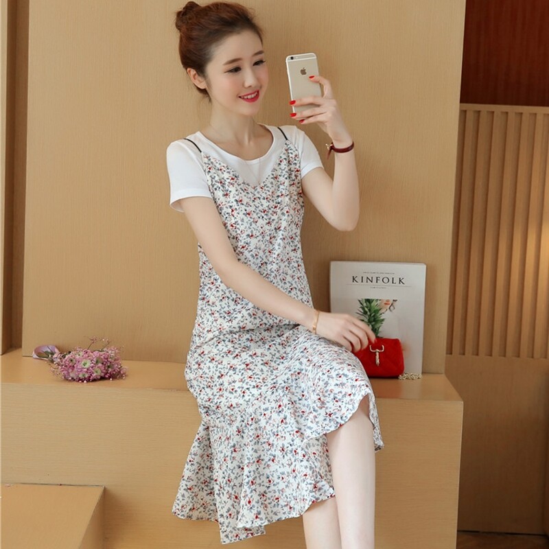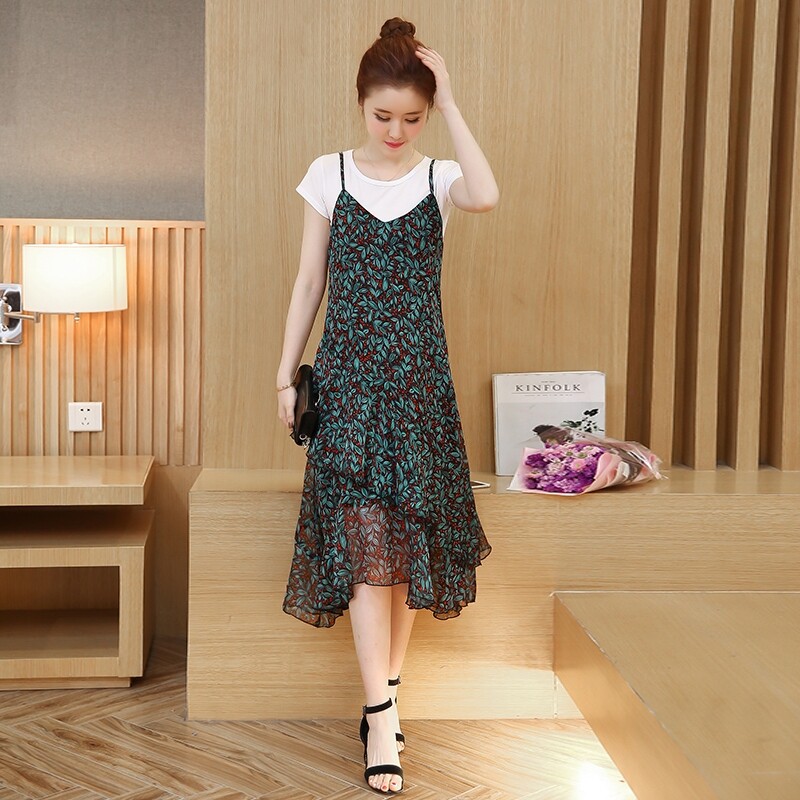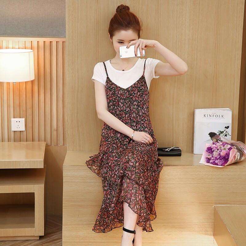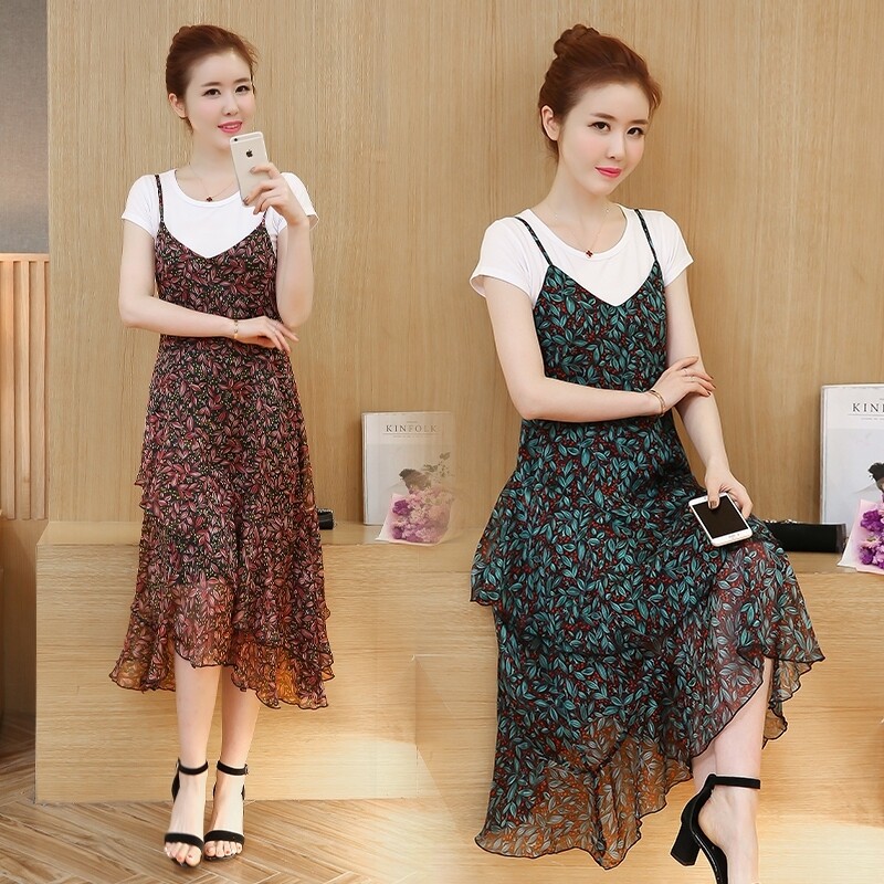 Шифоновый комплект, платье, длинная юбка, 2020 года, в стиле Шанель, эффект подтяжки, цветочный принт, подходит для подростков, по фигуре