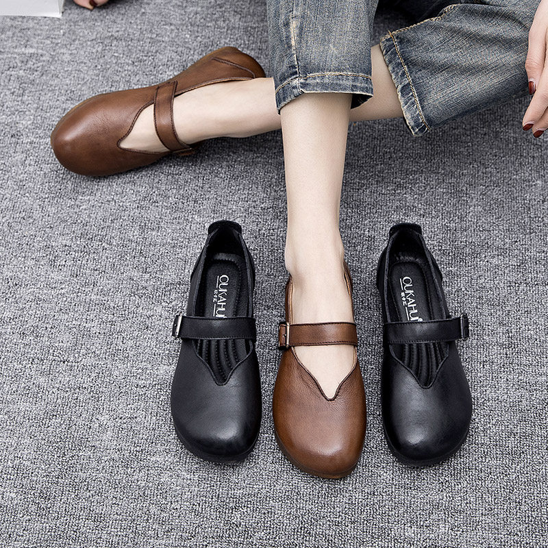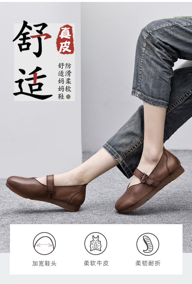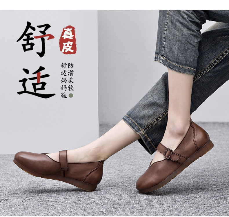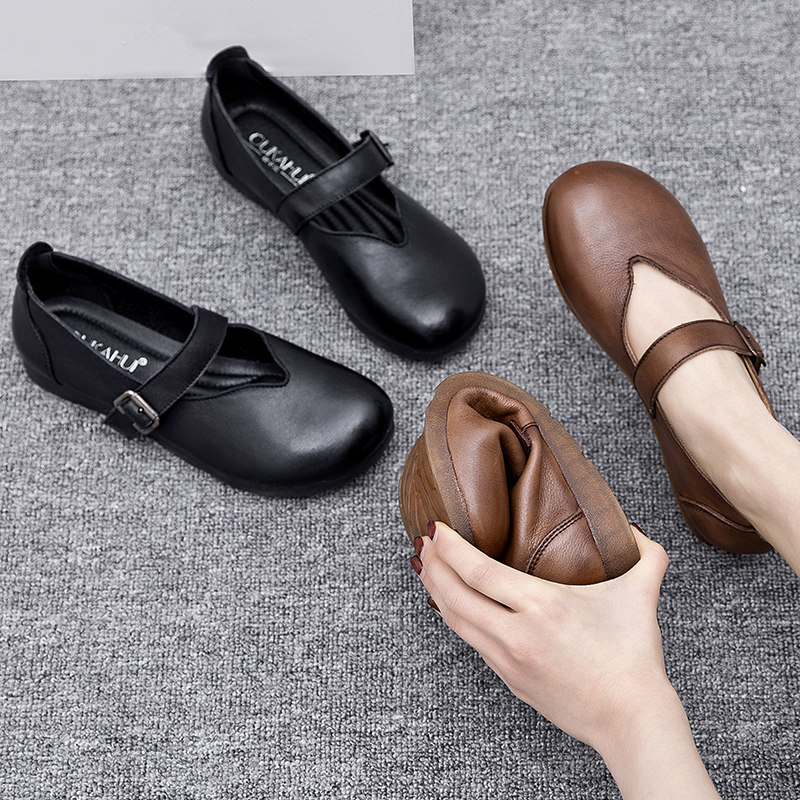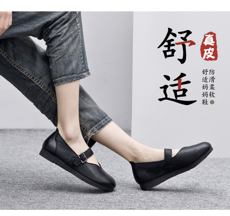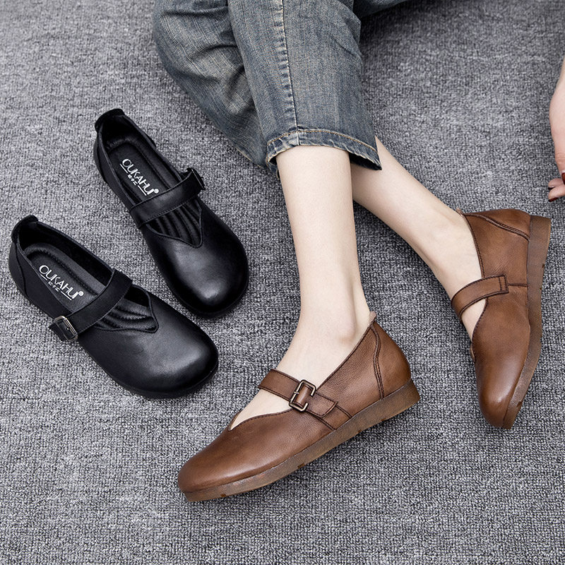 Весна и осенняя кожаная обувь обувь мягкие подошвы женщины удобные старые пожилые туфли с плоским дном мягкие ботинки с лапшой, коровьи одиночные туфли в ретро