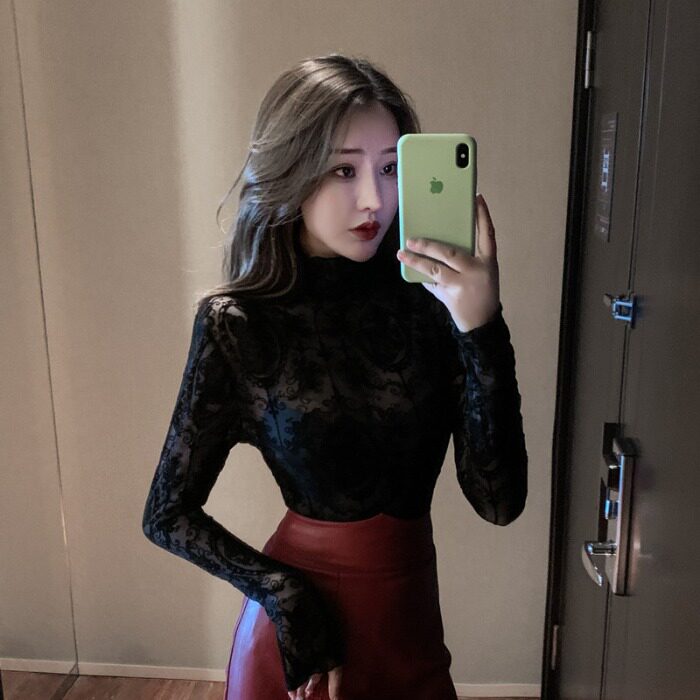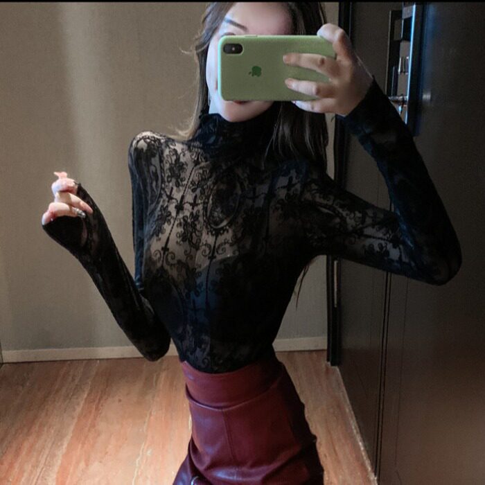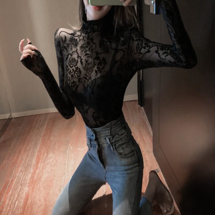 2020 весенне-осенняя сексуальная водолазка, тонкая кружевная рубашка, сетчатый низ, универсальный топ в западном стиле, новая женская одежда