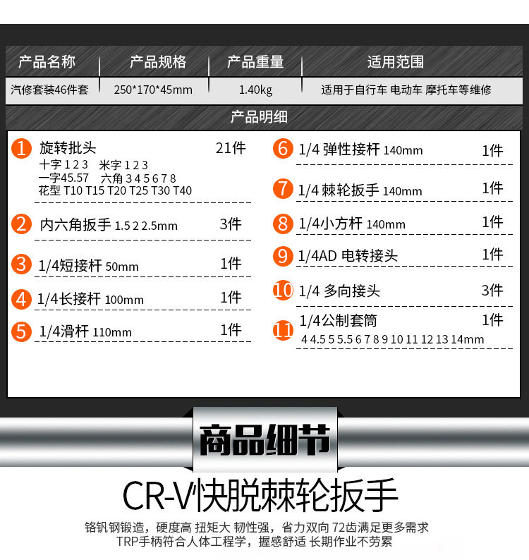 Небольшой быстрый рукав для колеса позвоночника 6,3 мм1/4 Маленькие полеты 46 комплектов набора инструментов автострахования автоматического ремонта