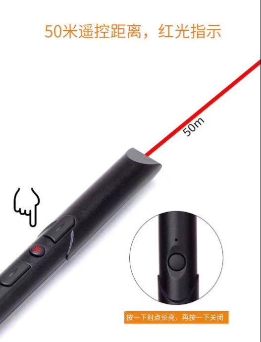 РЧ -беспроводная страница, поворотная лазерная ручка, представляет собой новый тип патентного электронного продукта, предназначенного для компьютерных и мультимедийных проекторов.В дополнение к функции традиционных лазерных ручек (лазерный кнут), его также можно использовать для удаленного управления компьютером для автоматического управления компьютером с помощью движения и кнопок поворота вниз.Пользователям не нужно оставаться рядом с компьютером, и они могут свободно перемещаться в классной комнате и в лекционном зале, ближе к аудитории и увеличивать хорошее взаимодействие; свободно переключать страницу в спокойствие и получить замечательные результаты!
