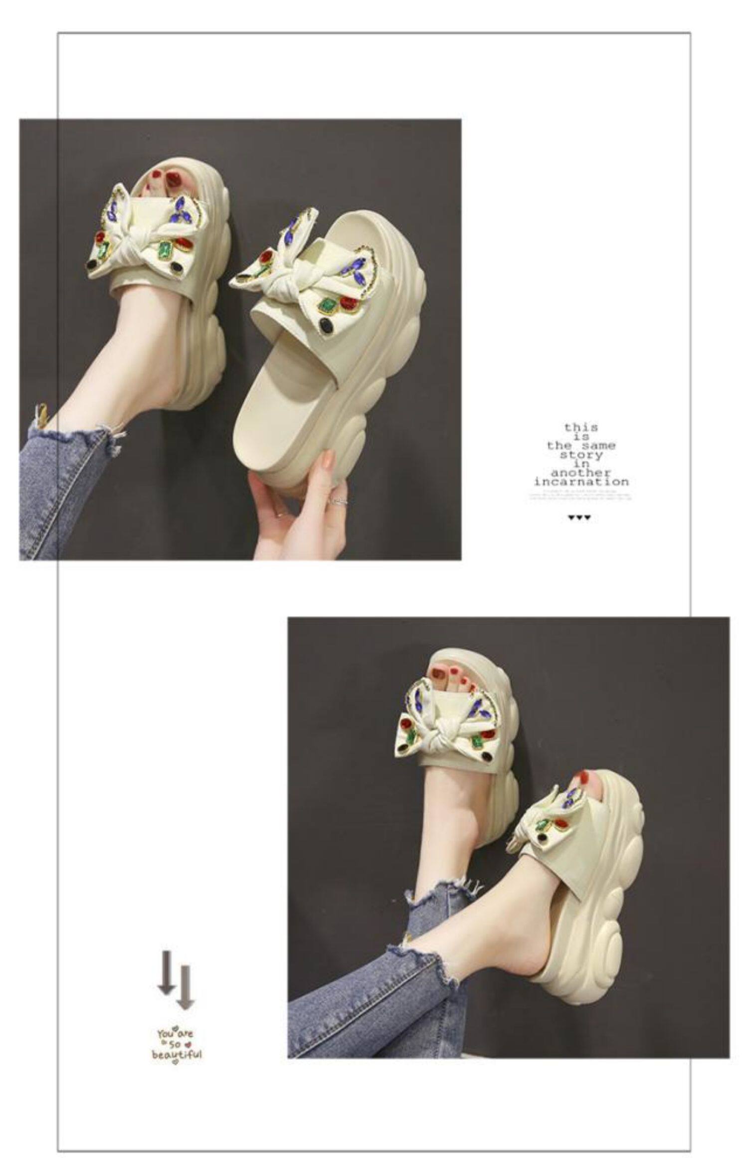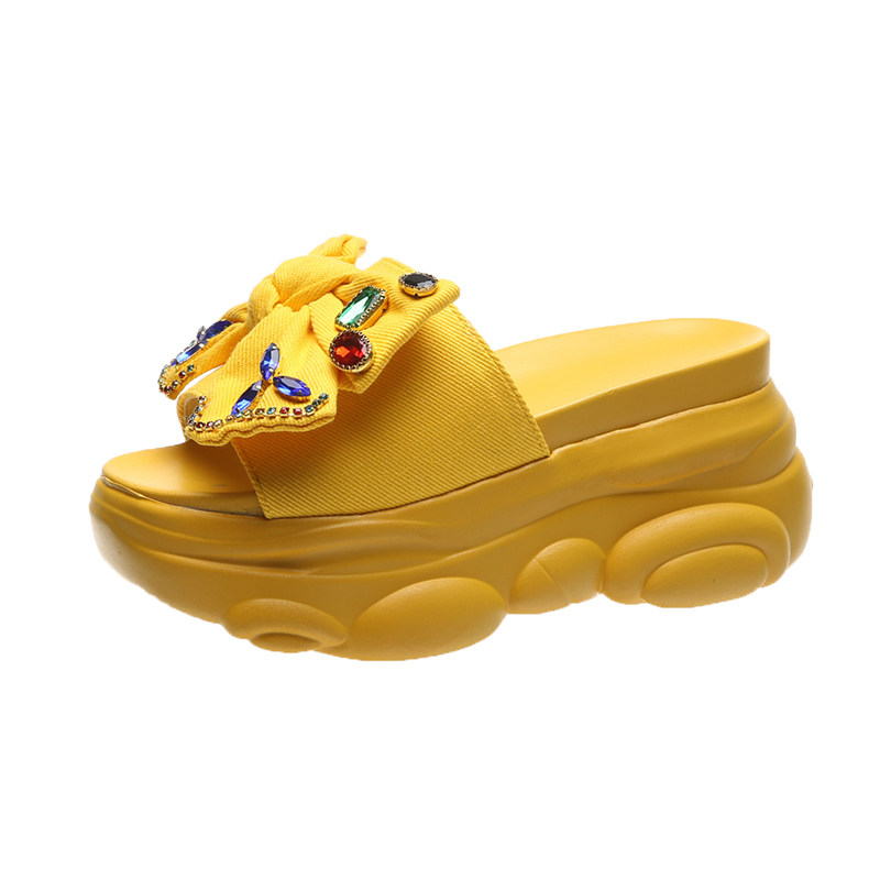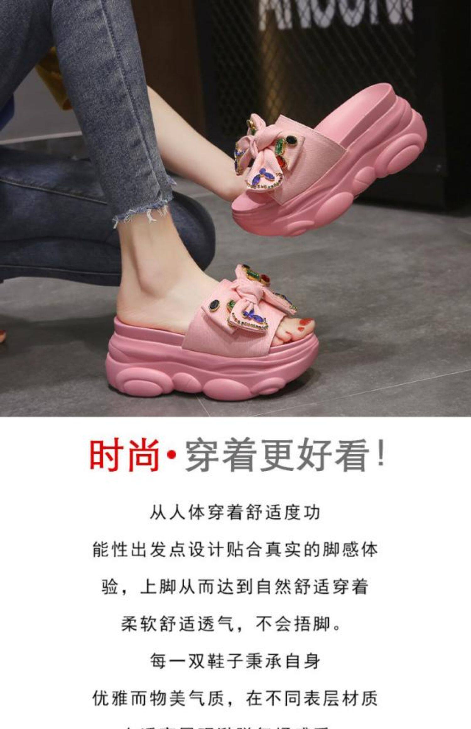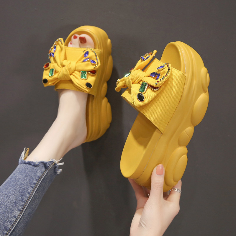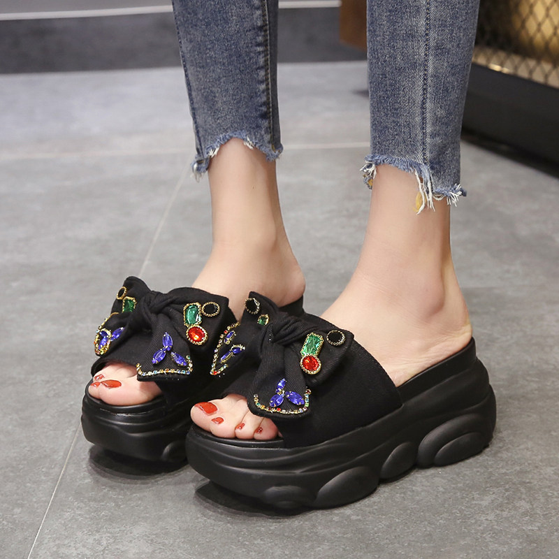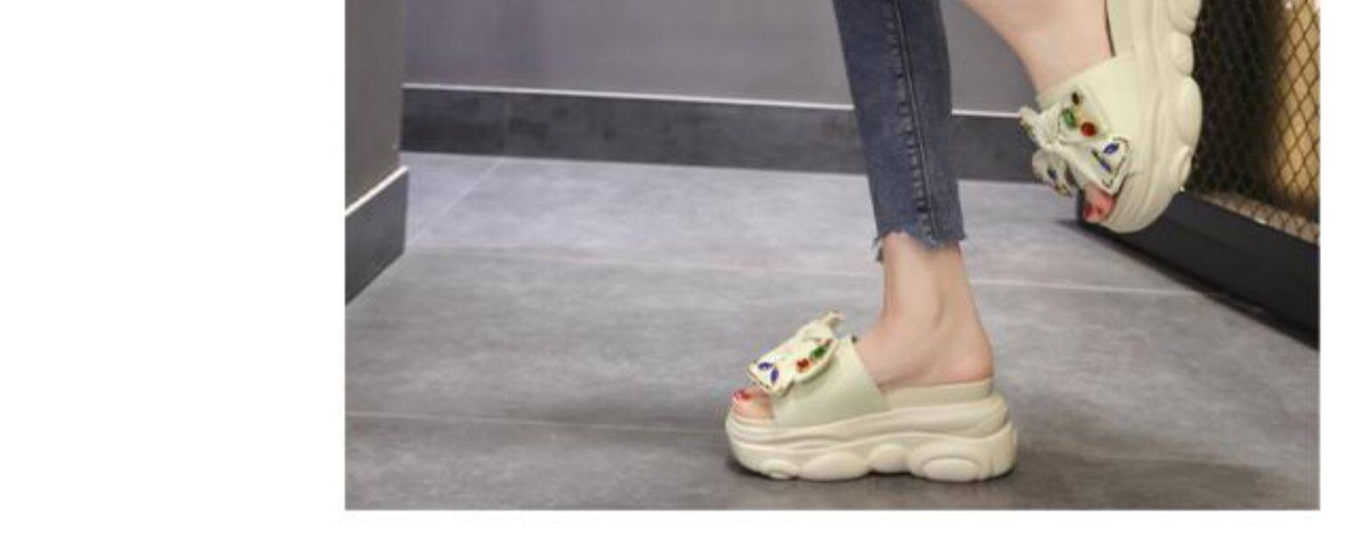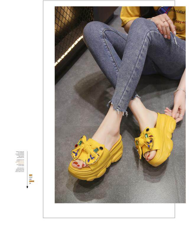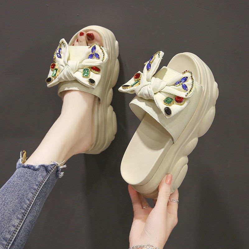 Интернет-знаменитости, удлиняющие тапочки на толстой подошве, новинка 2024 года, модные женские тапочки на платформе и высоком каблуке с бантом и стразами