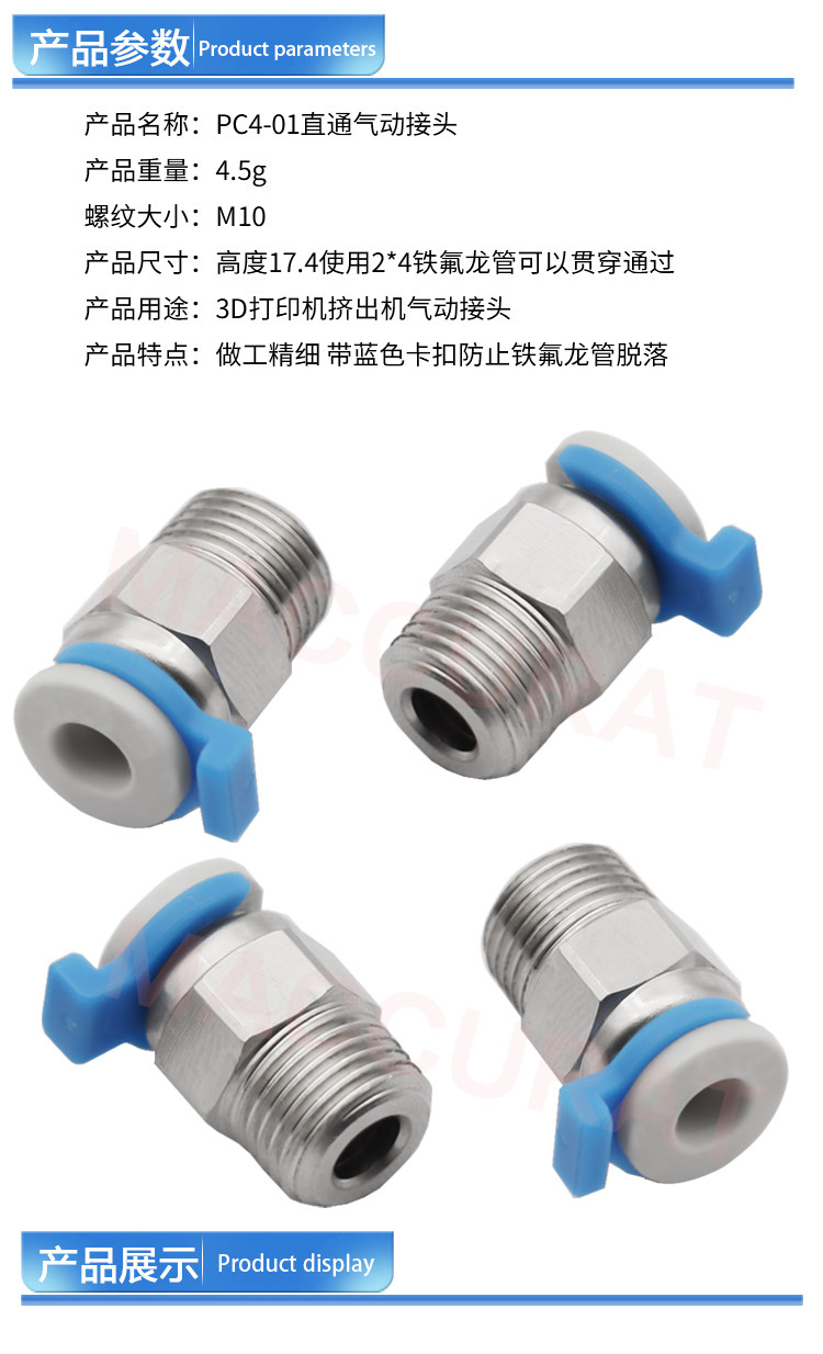 Mingtai 3D-принтер аксессуар PC4-01 Pole Pneumatic Connecter Thread M10 непосредственно через пневматический разъем V6