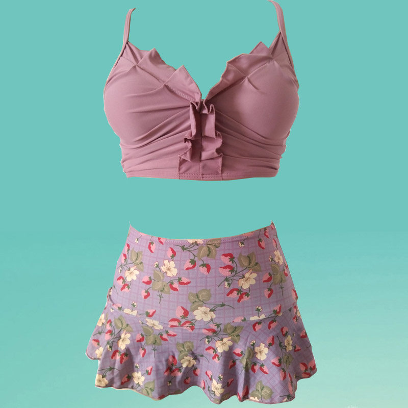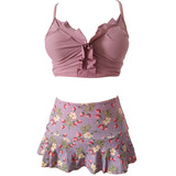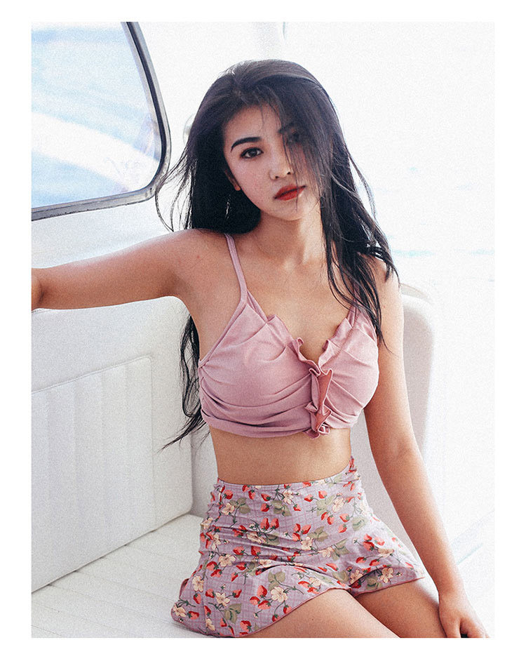 Купальник, маленькая мини-юбка, ремень, розовые штаны, крой «рыбий хвост», высокая талия, цветочный принт