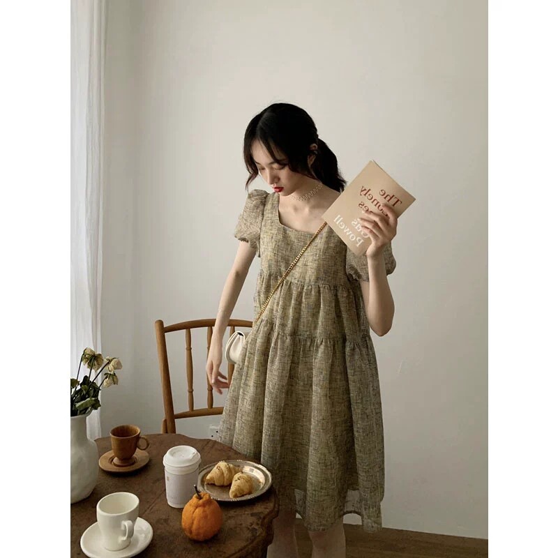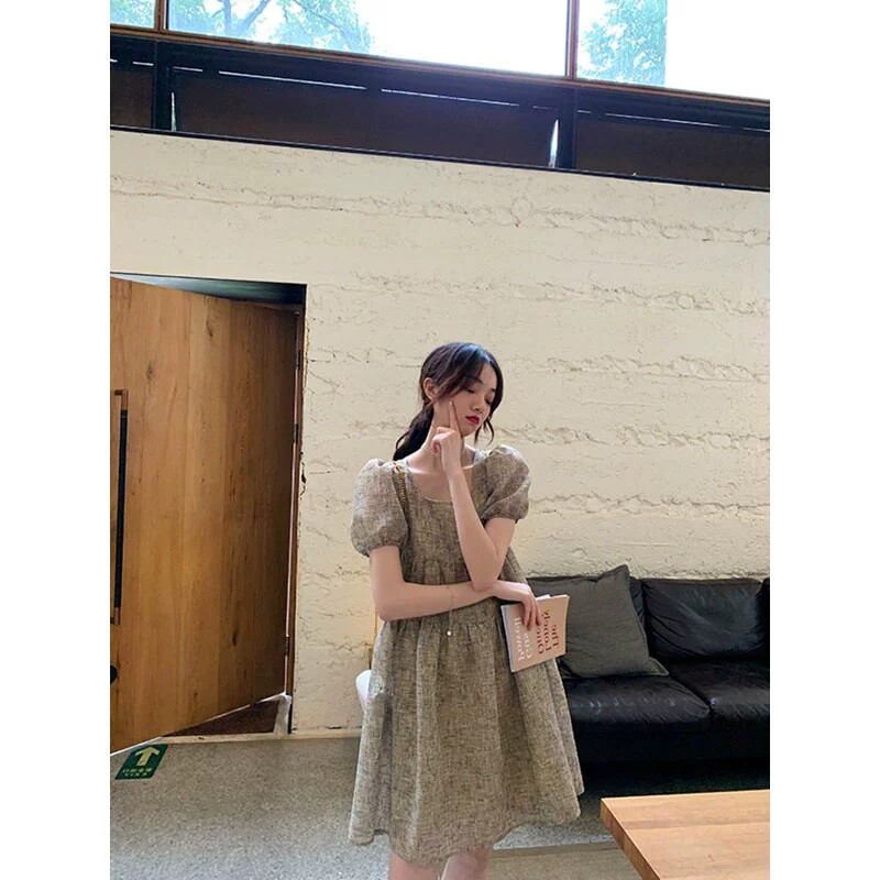 Платье, коллекция 2022, в стиле Шанель, подходит для подростков, французский стиль, квадратный вырез, рукава фонарики, с рукавом