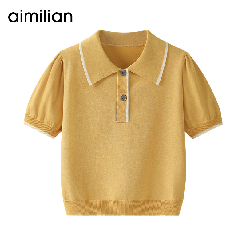 艾米恋 Тонкий трикотажный летний белый свитер, короткая базовая футболка с коротким рукавом, воротник поло