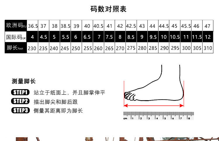 | Размер обуви: | 36, 230mm, 37 (длину 235 мм), 38, 240mm, 39 (длина ноги 250 мм), 40, 255mm, 40, 260mm, 41 (foot length 265mm), 42 (длина ноги 270 мм), 42.5 (foot length 275mm), 43 (длина ноги 280 мм), 44 (длина ноги 285 мм), 44.5 (foot length 290mm), 45 (foot length 295mm) |