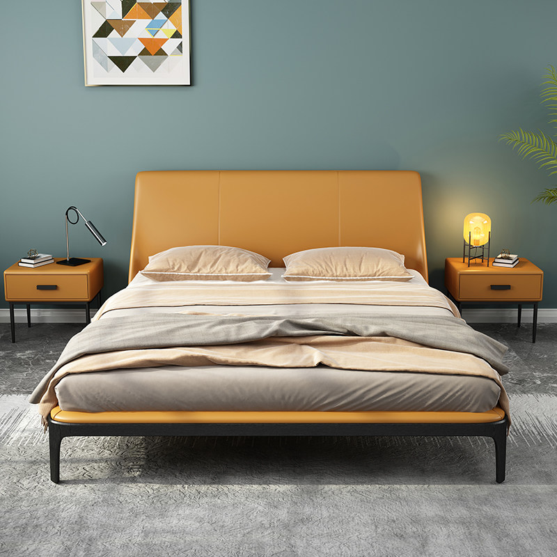 [意式极简轻奢皮床1.8米头层真皮床小户型简约主卧成人黄色双人床]