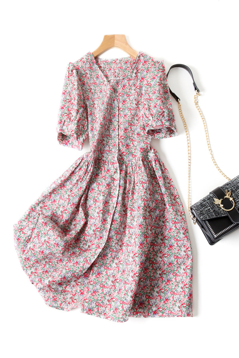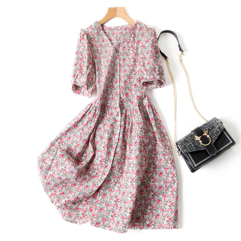 Фонарь, ретро платье с рукавами, приталенный корсет, хлопковая рубашка, французский стиль, V-образный вырез, короткий рукав, рукава фонарики, в цветочек