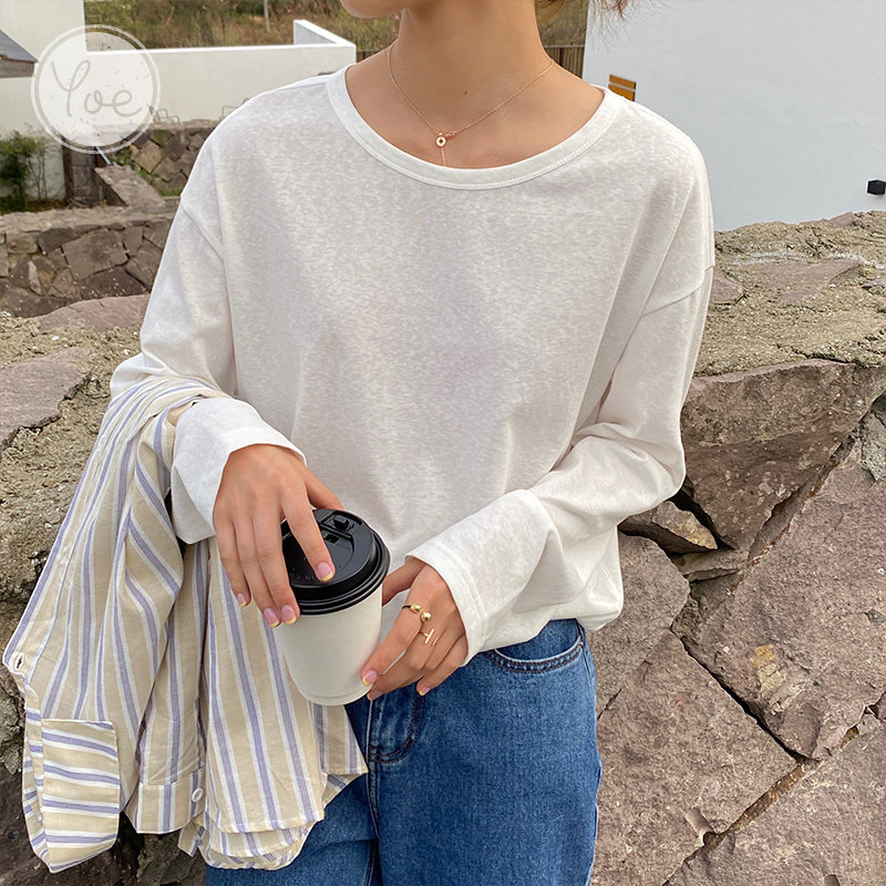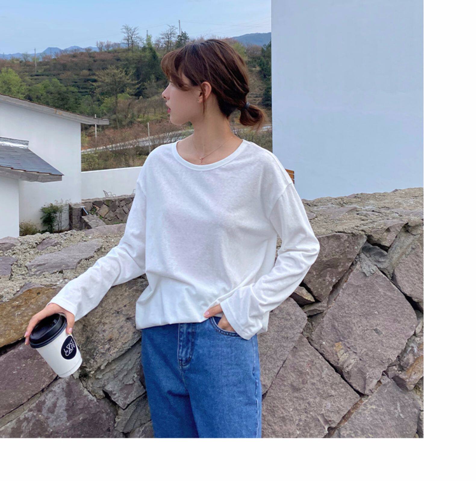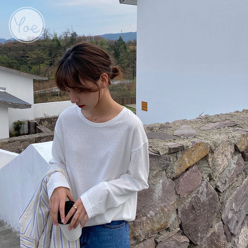 Tide, белая футболка, бамбуковый осенний лонгслив с круглым воротником, оверсайз, популярно в интернете