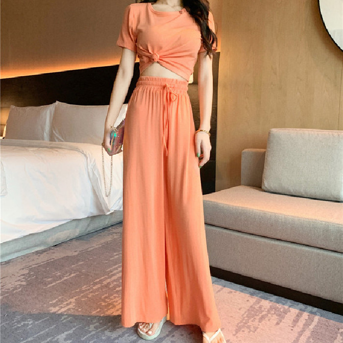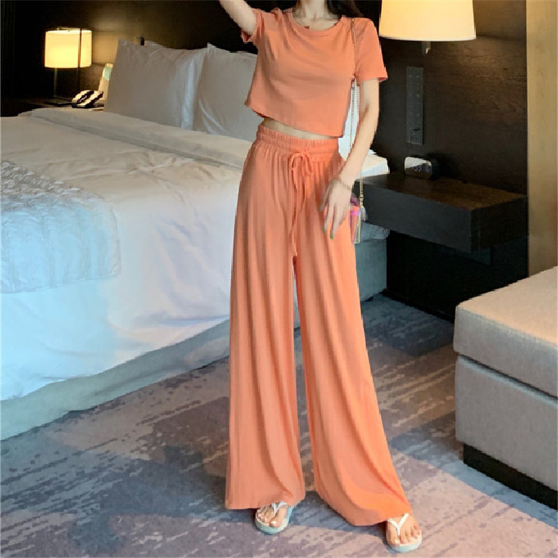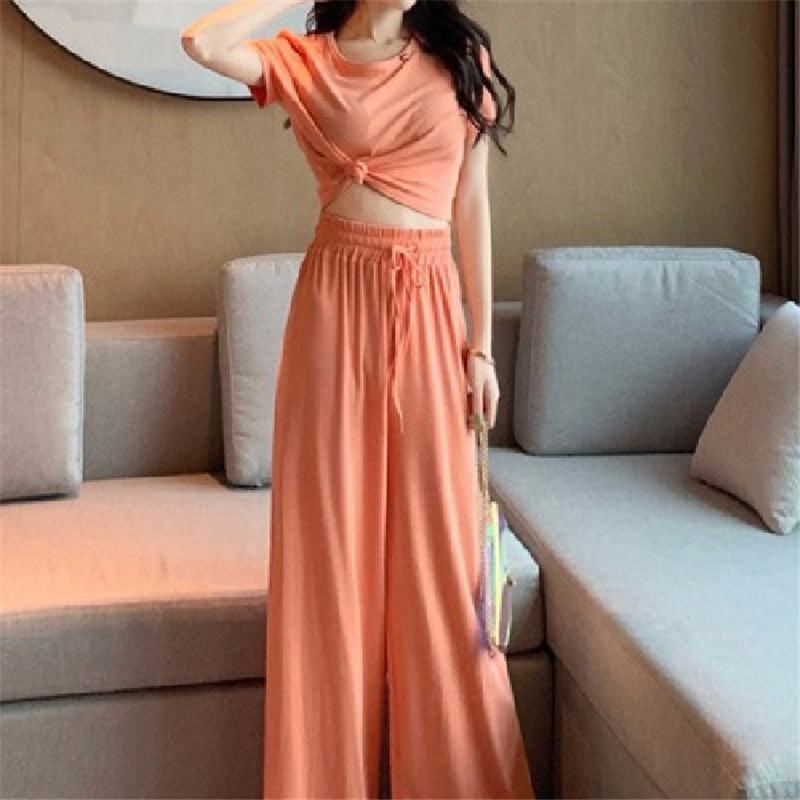 Летний комплект, футболка с коротким рукавом, штаны, в корейском стиле, высокая талия, свободный прямой крой