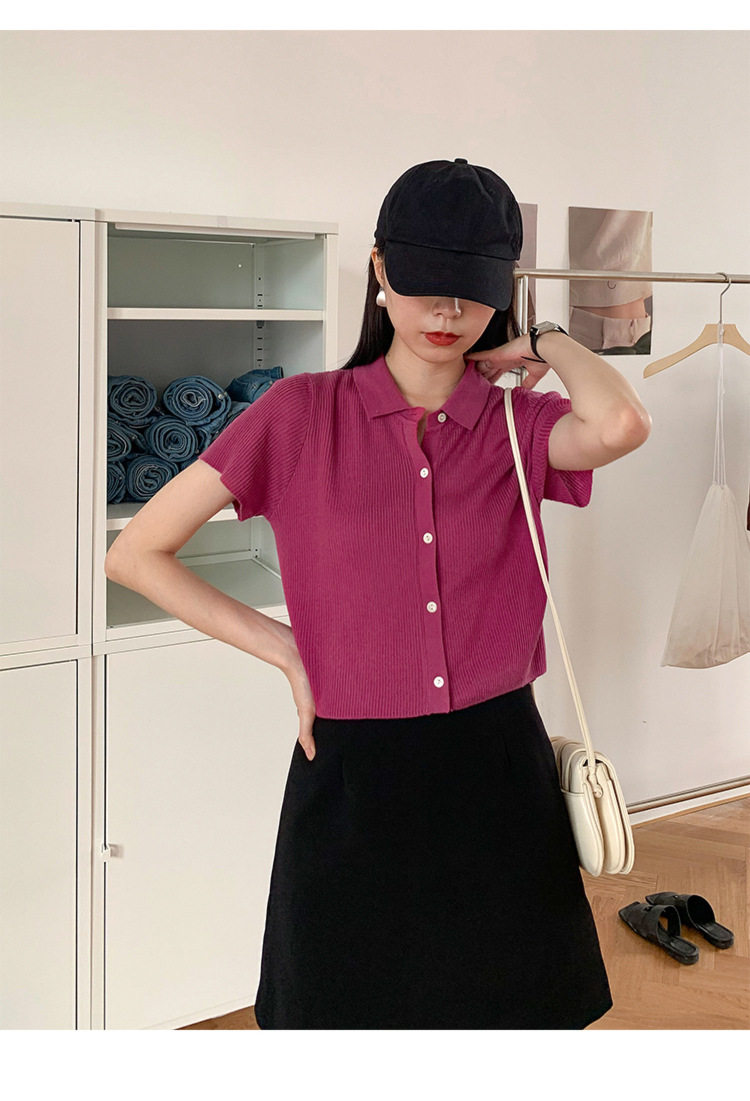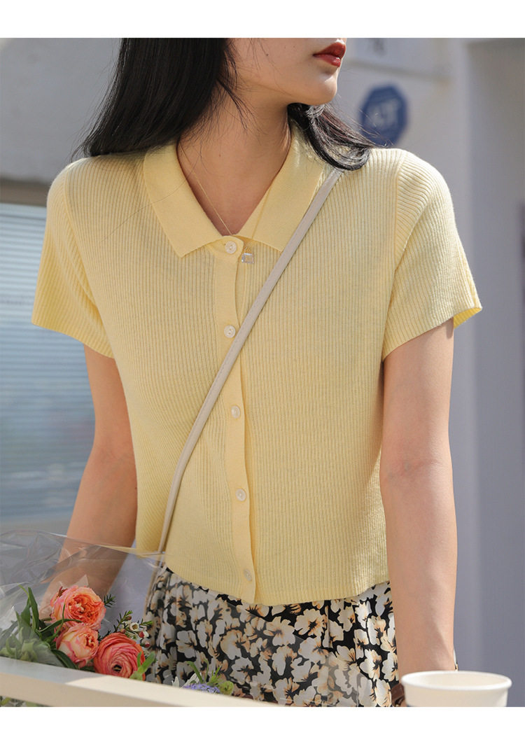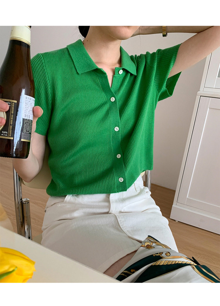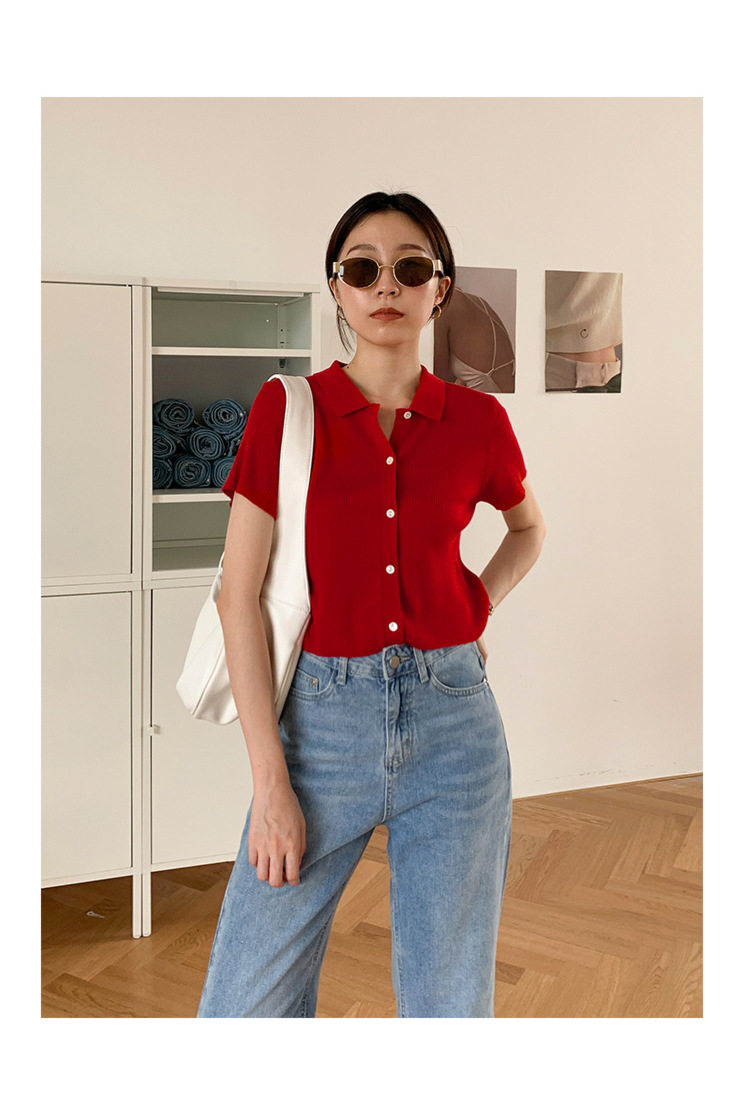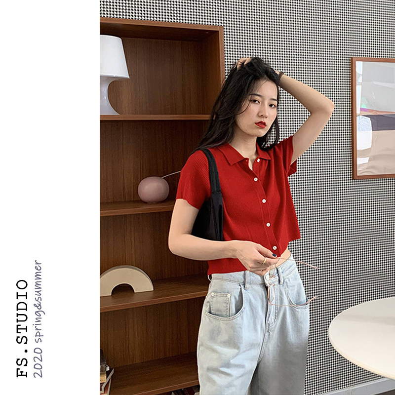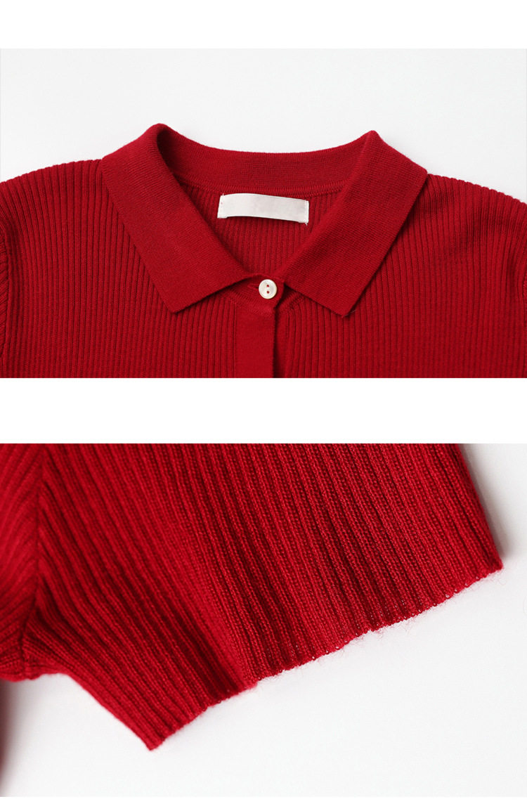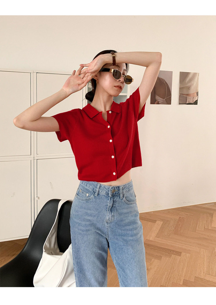 Дизайнерский короткий трикотажный кардиган, высокая талия, тренд сезона, французский стиль, воротник поло, короткий рукав