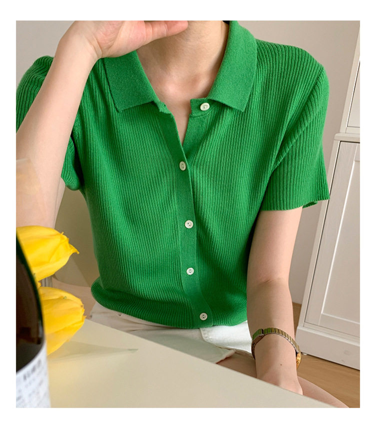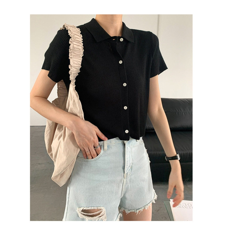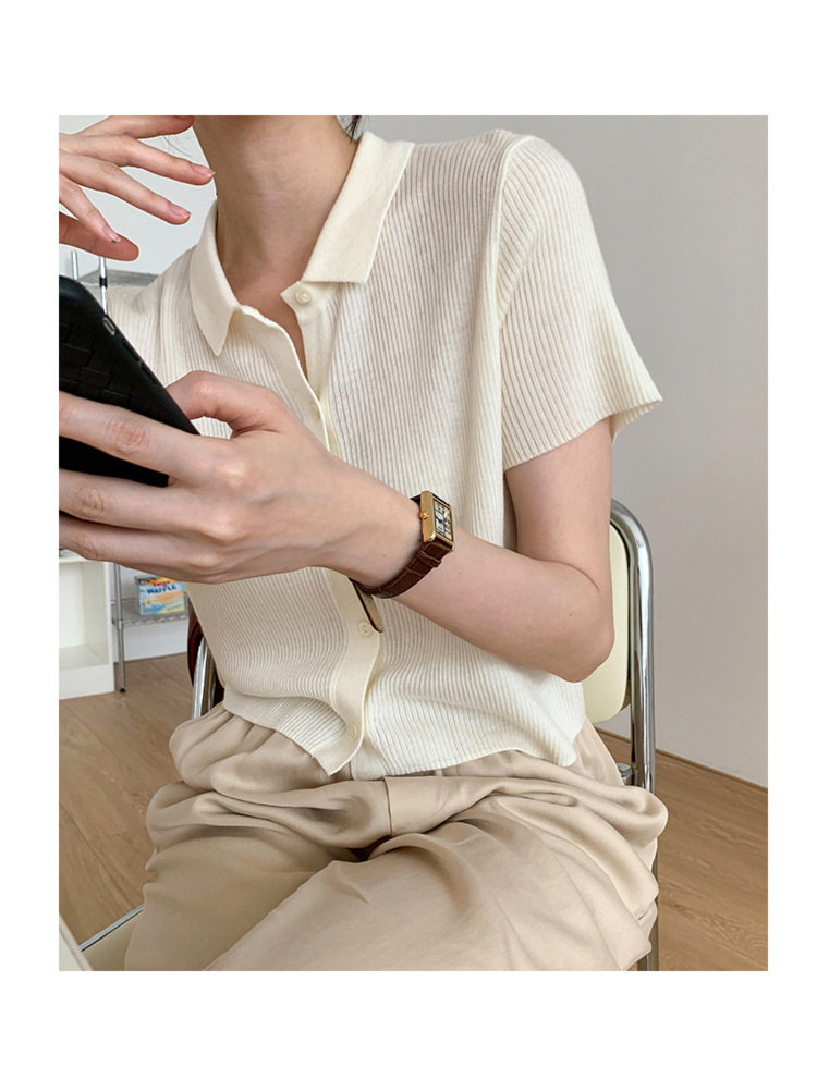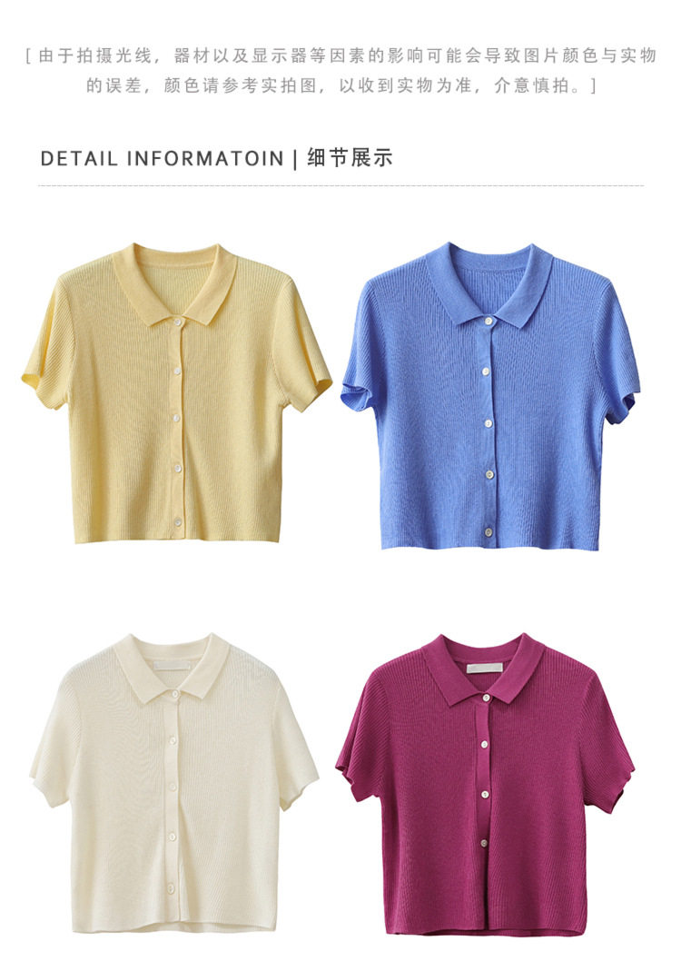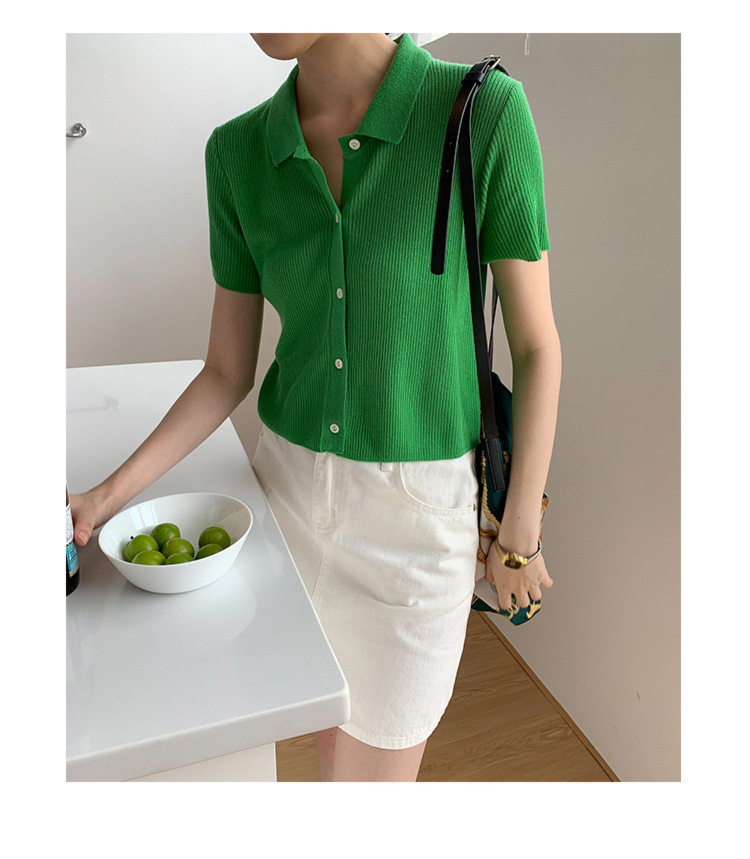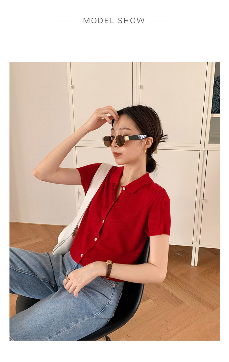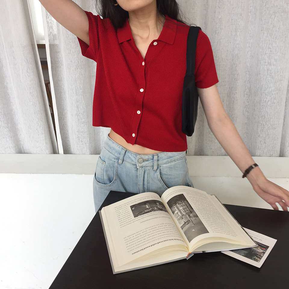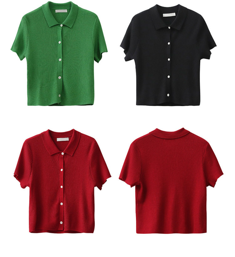 Дизайнерский короткий трикотажный кардиган, высокая талия, тренд сезона, французский стиль, воротник поло, короткий рукав