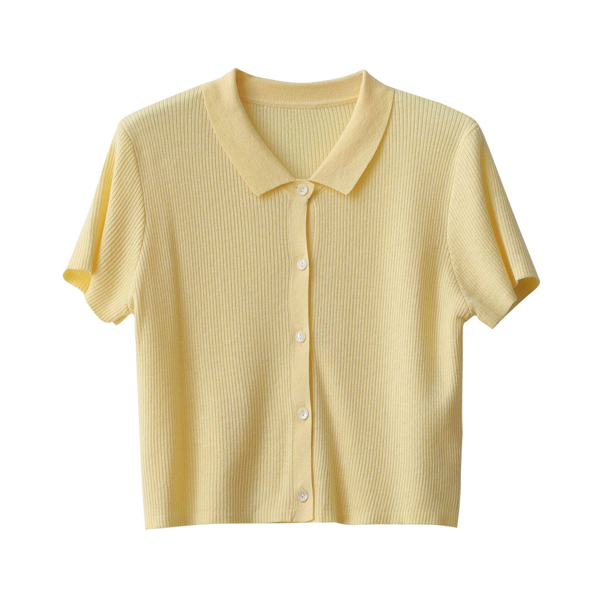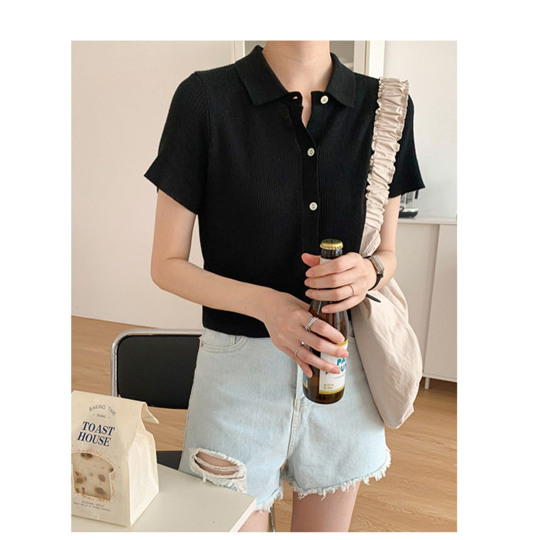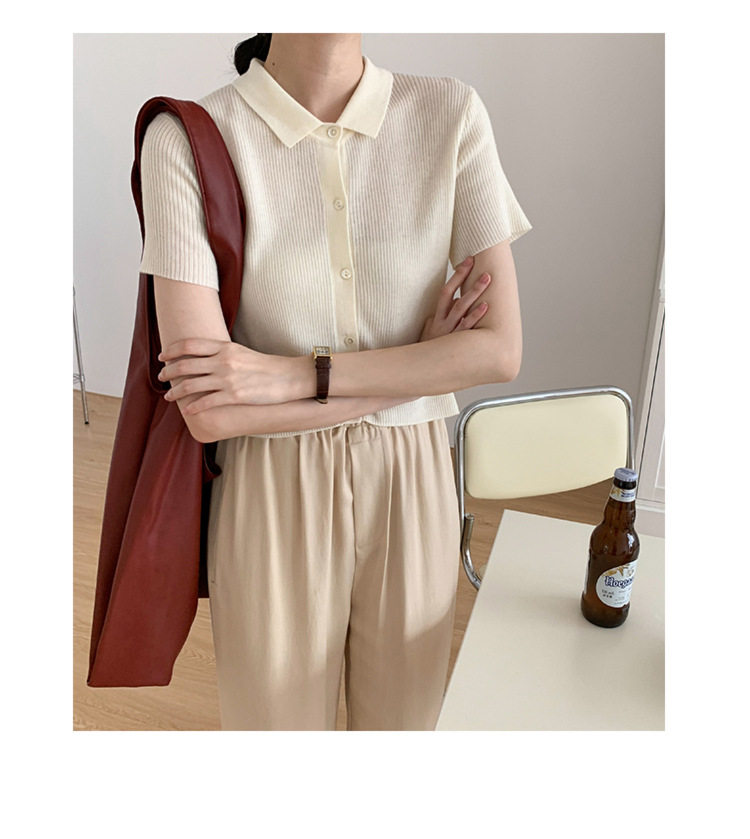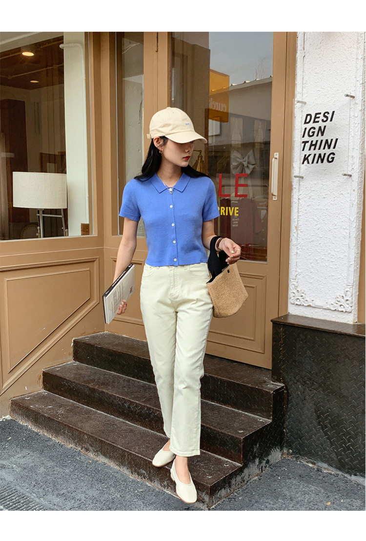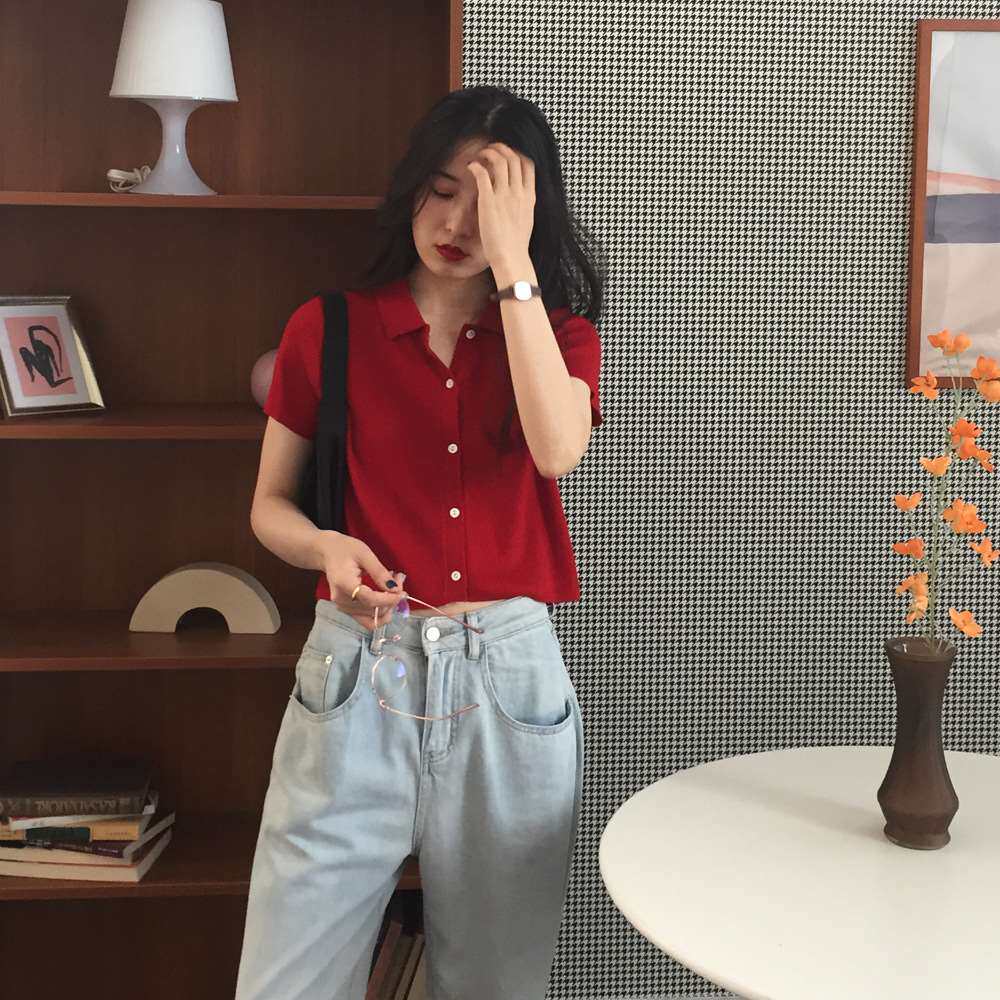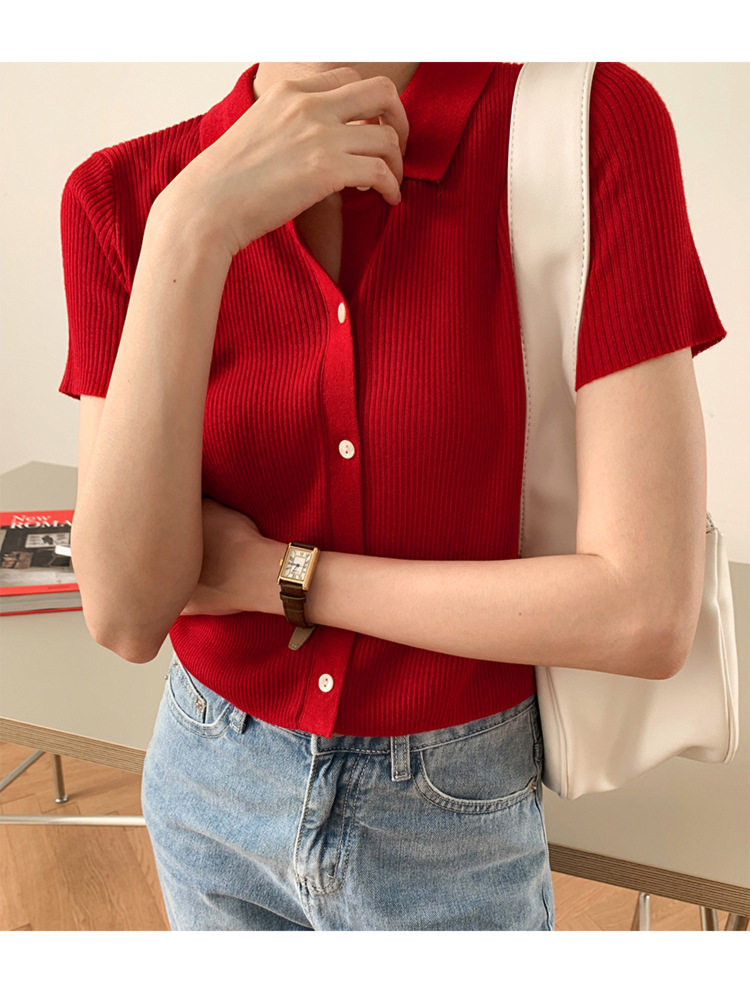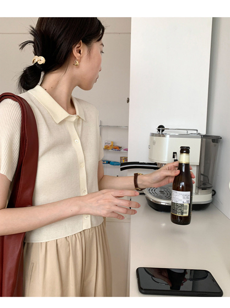 Дизайнерский короткий трикотажный кардиган, высокая талия, тренд сезона, французский стиль, воротник поло, короткий рукав